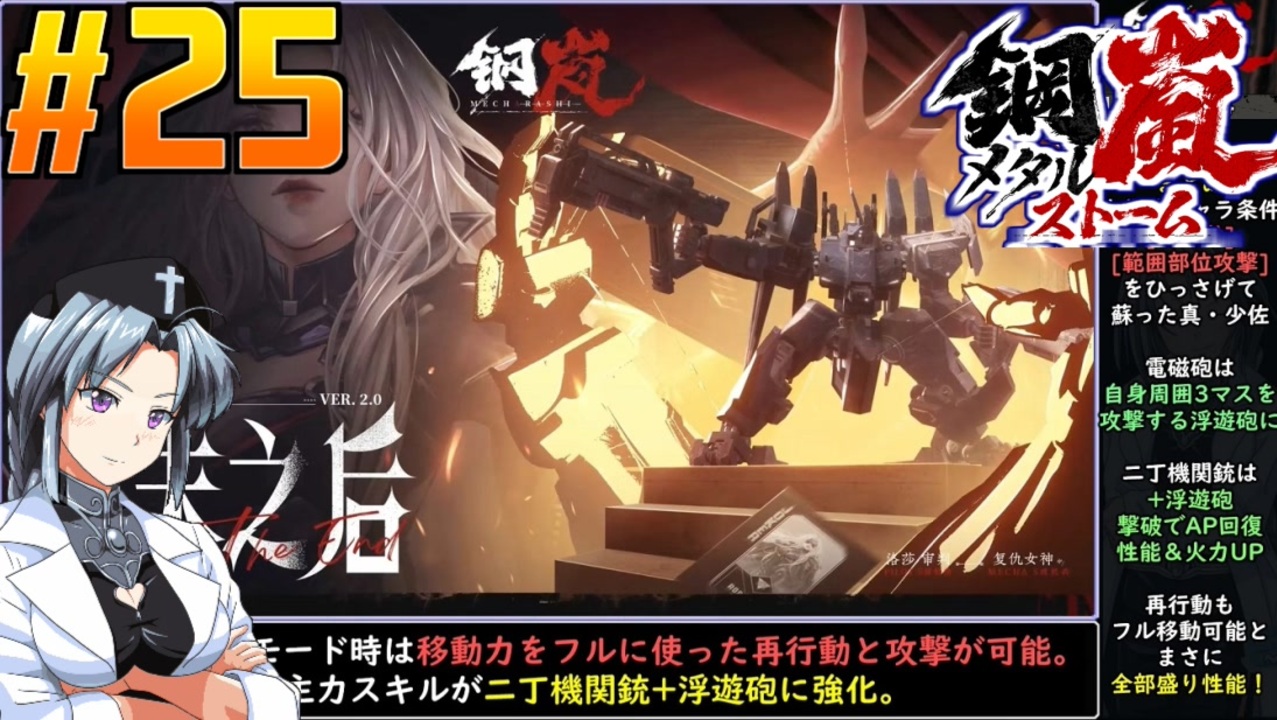MISSION:5-4 自由の地にて<br>MISSION:5-5 二面交渉<br>5章夜明けのステラ<br><br>◆鋼嵐メタルストーム(MECHARASHI)◆<br>あらすじ <br>新暦91年、小惑星ミハマが公海に墜落。 新たに生まれた島は「ミハマ島」と名付けられた。<br>調査に訪れた黒曜石(オブシディアン)コーポレーションが新元素「シエラム元素」を発見。<br>「シエラム合金」が生み出され、これにより工業用機体「ST」が爆発的進化を遂げた。<br>数年後、新元素を狙い大国がミハマ島で衝突。<br>第一次ミハマ紛争勃発。新暦101年、戦争は終結。<br>それから15年後、新暦116年。<br>ノース連合・ステラ同盟の国境争いが激化しつつあった・・・<br><br>2024年 9月12日クローズドβ開始<br>2024年10月23日正式サービス開始<br>本動画はメカ・ロボSRPG鋼嵐メタルストームのvoicepeak桜乃そら実況です。<br><br>◆補足◆<br>元々はフロントミッション2089ボーダースケープとして2022年4月にタイトルが発表されたものの、<br>2022年12月にタイトル変更、鋼嵐となりました。<br><br>◆ニコニコクリエイターサポート<br><a href="https://creator-support.nicovideo.jp/registration/1203831" target="_blank" rel="noopener nofollow">https://creator-support.nicovideo.jp/registration/1203831</a><br>動画制作の励みになります<br><br>◆Twitter<br><a href="https://twitter.com/ikamono8bit" target="_blank" rel="noopener nofollow">https://twitter.com/ikamono8bit</a><br>◆youtube<br><a href="http://www.youtube.com/c/IkamonoY" target="_blank" rel="noopener nofollow">http://www.youtube.com/c/IkamonoY</a><br>◆シリーズまとめ<br><a href="https://www.nicovideo.jp/user/1203831/series" target="_blank" rel="noopener nofollow">https://www.nicovideo.jp/user/1203831/series</a>
