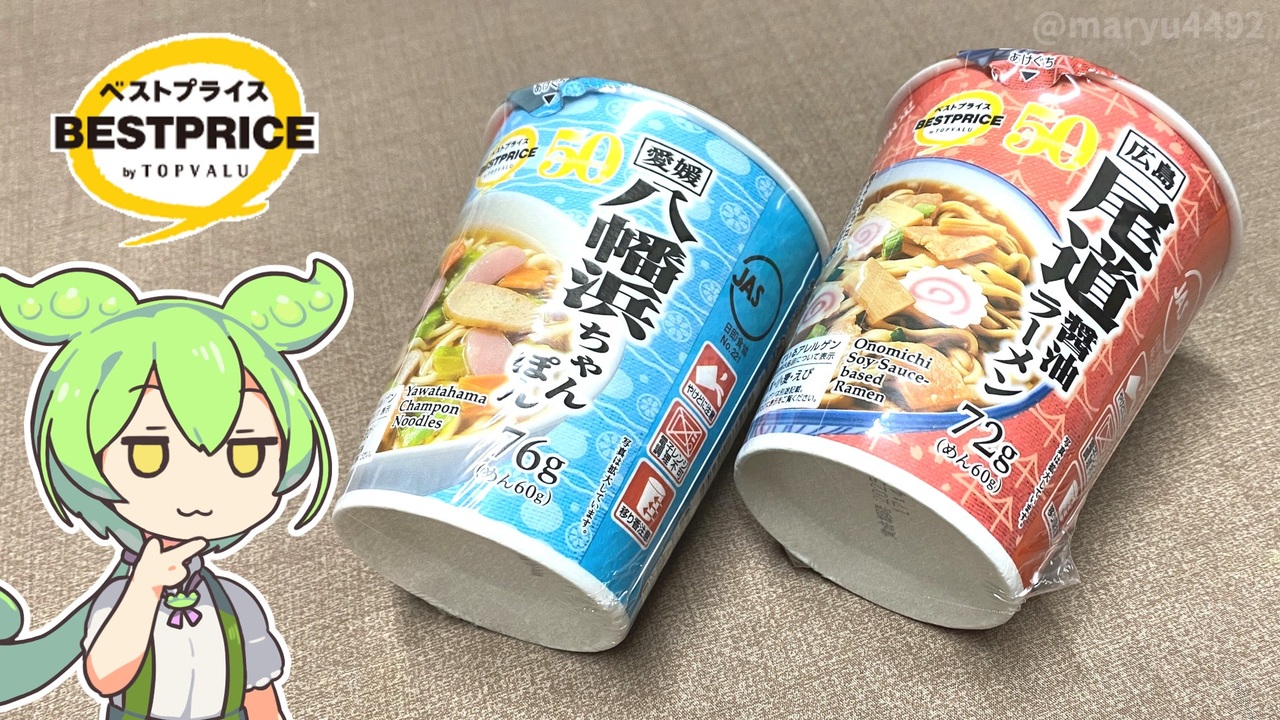 2024年11月に製造が終了してしまいましたが <br>ご当地カップ麺が発売されていたので紹介します。<br><br><br>【参考】 <br>広島尾道醤油ラーメン(トップバリュ) <br><a href="https://www.topvalu.net/items/detail/4549414633955/" target="_blank" rel="noopener nofollow">https://www.topvalu.net/items/detail/4549414633955/</a><br> 愛媛八幡浜ちゃんぽん(トップバリュ) <br><a href="https://www.topvalu.net/items/detail/4549414633962/" target="_blank" rel="noopener nofollow">https://www.topvalu.net/items/detail/4549414633962/</a><br><br>【使用した素材】(※敬称略) <br>(合成音声)VOICEVOX/ずんだもん/四国めたん <br><a href="https://voicevox.hiroshiba.jp/" target="_blank" rel="noopener nofollow">https://voicevox.hiroshiba.jp/</a> <br>(立ち絵)坂本アヒル <br><a href="https://seiga.nicovideo.jp/seiga/im10788496?track" target="_blank" rel="noopener nofollow">https://seiga.nicovideo.jp/seiga/im10788496?track</a> <br>(楽曲)甘茶の音楽工房/「楽しい麦畑」「フルーツパフェ」「お城の舞踏会」「残業戦士」 <br><a href="https://amachamusic.chagasi.co" target="_blank" rel="noopener nofollow">https://amachamusic.chagasi.co</a><br>