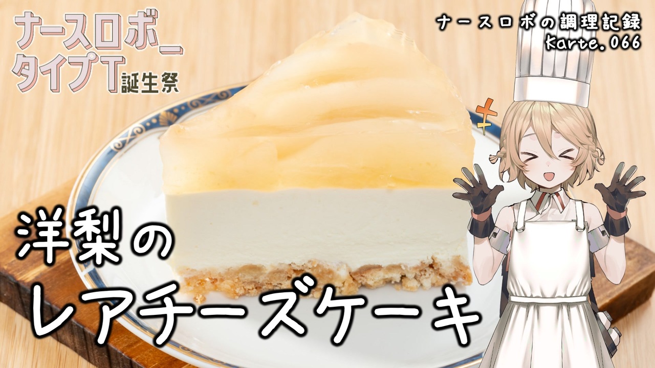<span style="font-size: 16px;"><strong>今日はナースロボ_タイプTの誕生日!</strong></span><br><br>お祝いの気持ちを込めてレアチーズケーキを作ります。<br>今回は豪華にラ・フランスのコンポートをゼリーも用意!<br>レアチーズケーキとゼリー部分の2層構造です!<br>レアチーズケーキは製菓初心者にもおすすめです。<br>ぜひ作ってみてくださいね。<br><br>音声: VOICEVOX:ナースロボ_タイプT<br>立ち絵: 捨て犬A<br>イラスト: いらすとや<br>SE: otologic, 効果音ラボ<br>BGM: BGMer<br /><br>[各種リンク]<br>ニコニコ動画: <a href="http://nicovideo.jp/user/130153578" target="_blank" rel="noopener nofollow">http://nicovideo.jp/user/130153578</a><br>YouTubeメイン(料理): <a href="http://youtube.com/@cooking25euph" target="_blank" rel="noopener nofollow">http://youtube.com/@cooking25euph</a><br>YouTubeサブ(料理以外): <a href="https://youtube.com/@sub25euph" target="_blank" rel="noopener nofollow">https://youtube.com/@sub25euph</a><br>X (twitter): <a href="https://twitter.com/nico25euph" target="_blank" rel="noopener nofollow">https://twitter.com/nico25euph</a><br>Bluesky: <a href="http://nico25euph.bsky.social" target="_blank" rel="noopener nofollow">http://nico25euph.bsky.social</a><br>TikTok: <a href="http://tiktok.com/@nico25euph" target="_blank" rel="noopener nofollow">http://tiktok.com/@nico25euph</a>