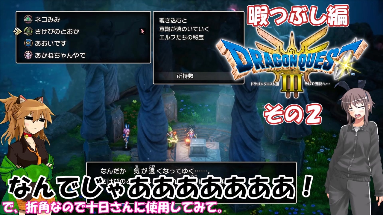 この動画はドラゴンクエスト3 HD-2D REMAKE そして伝説へ・・・<br>の<span style="font-size: 18px;"><strong>13日まで先に進めないので暇つぶしの実況プレイ動画</strong></span>となります。<br>そのため<strong>途中でバッサリ終わります。</strong>多分。<br><br><span style="font-size: 18px;"><strong>※シナリオに関わるネタバレあり。ご注意ください。</strong></span><br>(動画投稿ガイドラインより)<br><br>この動画で利用している株式会社スクウェア・エニックスを代表とする共同著作者が権利を所有する著作物及びスギヤマ工房有限会社が権利を所有する楽曲の転載・配布は禁止いたします。<br>© ARMOR PROJECT/BIRD STUDIO/SPIKE CHUNSOFT/SQUARE ENIX<br>© SUGIYAMA KOBO<br>℗ SUGIYAMA KOBO<br><br><a href="https://www.nicovideo.jp/watch/sm44386693" class="watch">sm44386693</a> ← 前 次→ <a href="https://www.nicovideo.jp/watch/sm44394157" class="watch">sm44394157</a><br>マイリスト → <a href="https://www.nicovideo.jp/mylist/77305494" target="_blank" rel="noopener">mylist/77305494</a><br>その1リスト → <a href="https://www.nicovideo.jp/mylist/58364125" target="_blank" rel="noopener">mylist/58364125</a><br><br>※使用Voice(及び配役)<br>VOICEVOX:春日部つむぎ(ネコ耳) WhiteCUL(十日さん)<br>Voiceroid:琴葉茜(茜ちゃんやで) 琴葉葵(葵ちゃん)<br>立ち絵:ネコ耳(470/43様より頂きました)<br> 琴葉姉妹(パーカー風味琴葉姉妹立ち絵素材 C-mainasu様作)<br> 十日さん(きゃらくたーなんとか機)