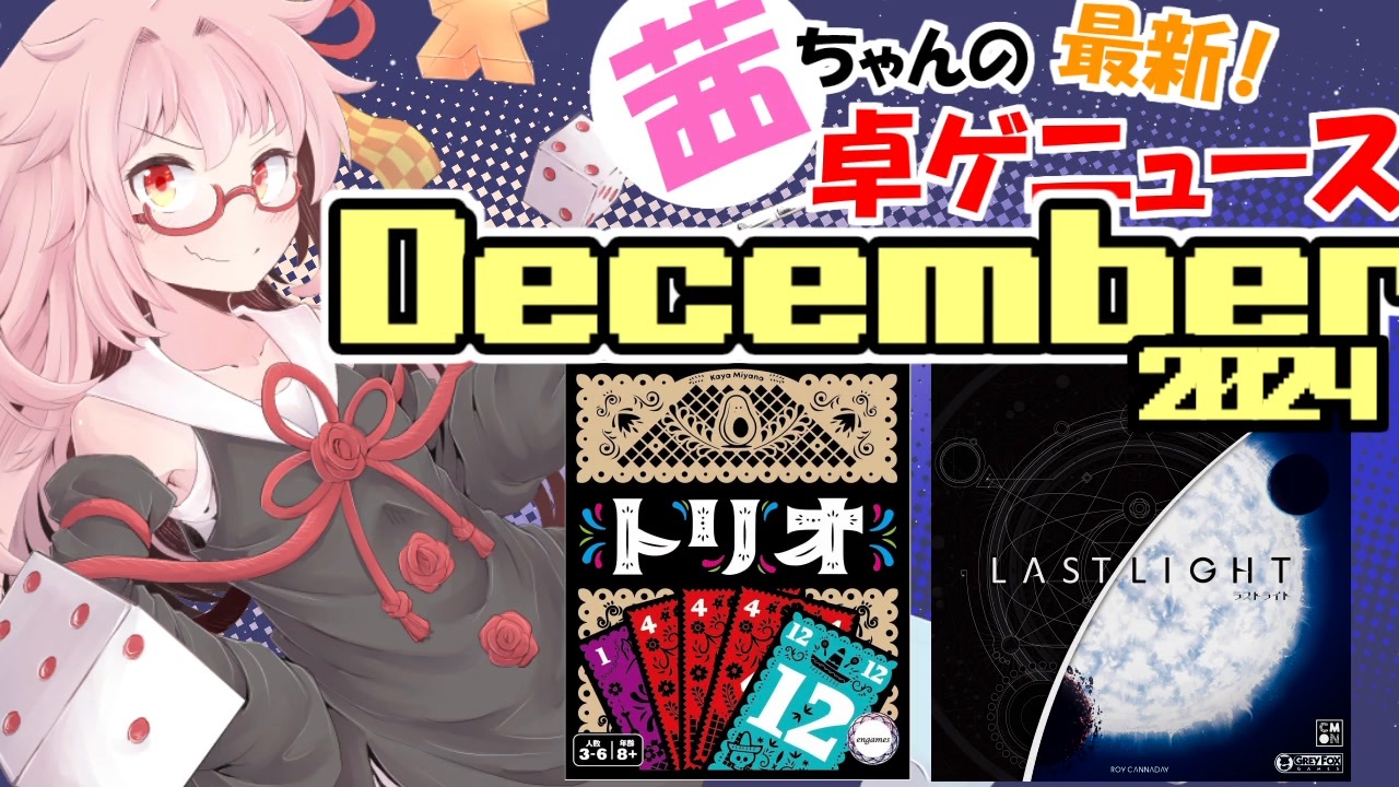ボドゲやりた~~~い<br><span style="font-size: 10px;">年末企画についてのコメントがありましたが<br>あれはメッチャ大変なのでちょっと難しそうです<br>誰かやってくれたら嬉しいな…</span><br><br><span style="color: #ff0000;"><strong>「トリオ」修正</strong></span><br><span style="color: #ff0000;">誤:プレイ人数 2~4<br>正:プレイ人数 3~6</span><br><br><a href="https://www.nicovideo.jp/watch/sm44269066" class="watch">sm44269066</a> ←前 次→ <a href="https://www.nicovideo.jp/watch/sm44491752" class="watch">sm44491752</a><br><br><span style="font-size: 10px;"><strong>Engames「トリオ」note</strong></span><br><span style="font-size: 10px;"><a href="https://note.com/engames/n/n8daac1586af6" target="_blank" rel="noopener nofollow">https://note.com/engames/n/n8daac1586af6</a></span><br><span style="font-size: 10px;"><strong>「まねきねこれくしょん」公式</strong></span><br><span style="font-size: 10px;"><a href="https://www.s-mundi.co.jp/games/manekinecollection" target="_blank" rel="noopener nofollow">https://www.s-mundi.co.jp/games/manekinecollection</a></span><br><span style="font-size: 10px;"><strong>「ラストライト」公式ショップページ</strong></span><br><span style="font-size: 10px;"><a href="https://cmonjapan.shop/products/last-light" target="_blank" rel="noopener nofollow">https://cmonjapan.shop/products/last-light</a><br><br>D&Dプレイ動画:<a href="https://www.nicovideo.jp/series/481311" target="_blank" rel="noopener">series/481311</a><br>「芋花」初見プレイきりたん:<a href="https://www.nicovideo.jp/series/312394" target="_blank" rel="noopener">series/312394</a><br>ボドゲプレイ動画:<a href="https://www.nicovideo.jp/series/163166" target="_blank" rel="noopener">series/163166</a><br>Discordサーバー:<a href="https://discord.gg/DFySkdS" target="_blank" rel="noopener nofollow">https://discord.gg/DFySkdS</a></span>