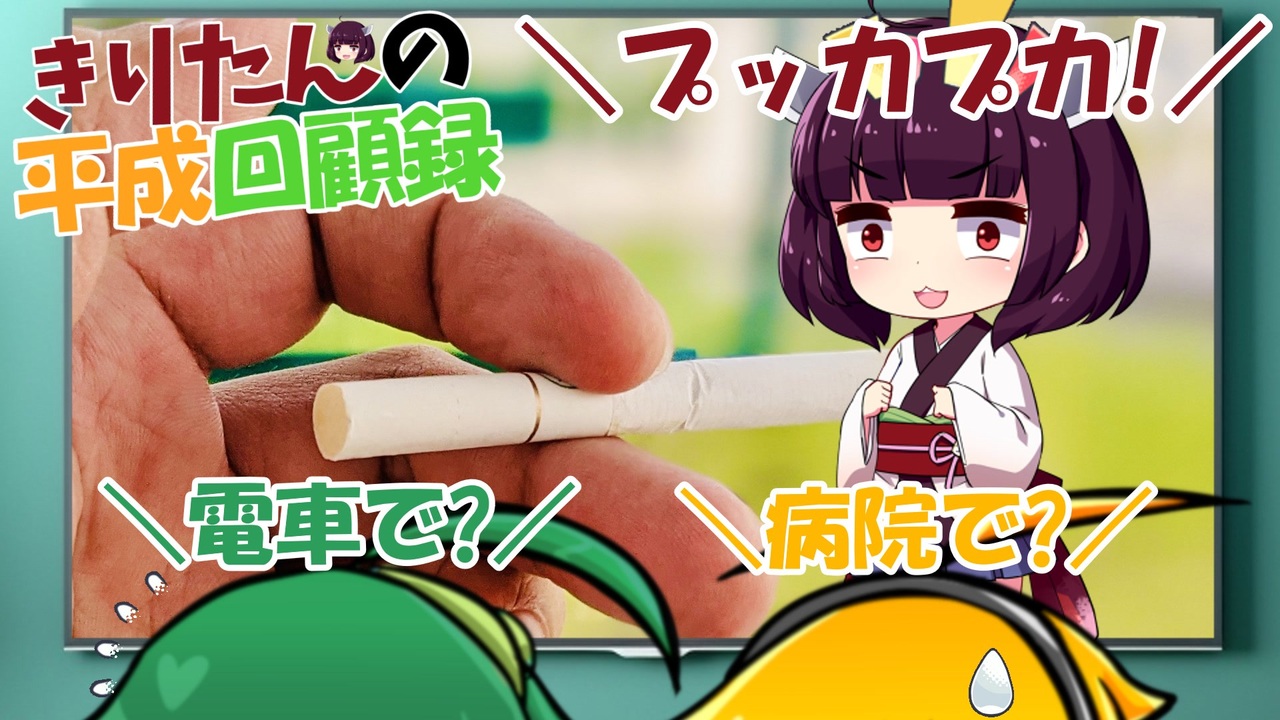 <strong>ようこそ! 平成回顧録へ!</strong><br><br>大人になったらタバコは吸うべきもの、という時代に育ったものとしては、現代はとても綺麗に感じます。昔はホント、どんな場所でもタバコの匂いがすること自体が当たり前でしたから。<br>非喫煙者からすると良い時代になったものです。<br>だからこそ「こちら側」もマナーやモラルは大切にしていきたいですね。<br><br>では、ごゆっくりとお楽しみください!<br><br><a href="https://www.nicovideo.jp/watch/sm44322916" class="watch">sm44322916</a> ← 前 次 → <a href="https://www.nicovideo.jp/watch/sm44442872" class="watch">sm44442872</a><br>回顧目録 → <a href="https://www.nicovideo.jp/mylist/76747431" target="_blank" rel="noopener">mylist/76747431</a><br>YouTube版 → <a href="https://youtu.be/PkPIbiBtZ8g" target="_blank" rel="noopener nofollow">https://youtu.be/PkPIbiBtZ8g</a><br><br>シリーズ一話マイリスト →<span style="color: #006699;"> </span><a href="https://www.nicovideo.jp/mylist/69322831" target="_blank" rel="noopener">mylist/69322831</a><br>試作品マイリスト → <a href="https://www.nicovideo.jp/mylist/69322827" target="_blank" rel="noopener">mylist/69322827</a><br><br>更新情報とか質問とかX(ツイッター) → <a href="https://twitter.com/suzakatsuki " target="_blank" rel="noopener nofollow">https://twitter.com/suzakatsuki </a><br><br>~お借りしたもの~<br>立ち絵:blueberry様(SD東北きりたん他)、りんどう様(ボイロミニキャラ後ろ姿素材)<br>背景小物類:写真AC様<br> イラストAC様<br>BGM:こんとどぅふぇ HiLi様いっしょ、港町ポルカ、目が覚めた<br>効果音:効果音ラボ様<br> On-Jin ~音人~様<br> <br><br>※リンク情報などは、マイリストの説明欄にて補足しています。