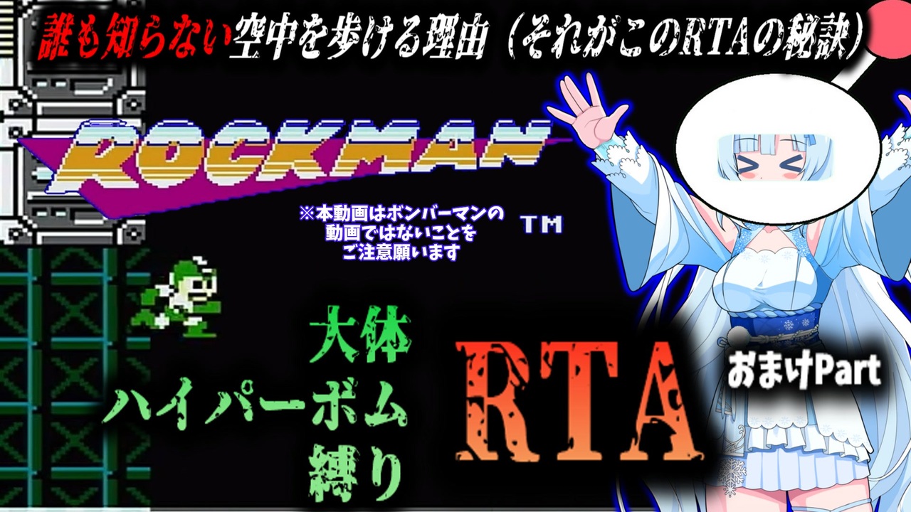 あらかじめこちらの動画をご視聴いただくとより理解できます。→<a href="https://www.nicovideo.jp/watch/sm43763197" class="watch">sm43763197</a><br><br>クラコレ版ロックマン(Switch)を以下の条件でRTAしました。<br><br>・敵にダメージを与える手段はハイパーボムのみ(ダメージを与えなければ他の武器も使用OK)<br>・ハイパーボムが効かない、効いても倒しきれないボスは、特別ルールを適用する(詳細は都度解説)<br>・壁抜け禁止<br>・セレクトボタン原則禁止(特別ルールで解禁あり)<br>・計測区間はタイトル画面でスタートボタンを押してからラスボス撃破まで<br>・CPUスピードターボ<br>・苦行はしない<br><br>参考サイト等……<br>GCGX:<a href="https://gcgx.games/" target="_blank" rel="noopener nofollow">https://gcgx.games/</a><br>ハイパーボム縛り実況:<a href="https://www.youtube.com/playlist?list=PLLdO6_Tw9EhEs3j_OzFVbzYH4IUFG16Wq" target="_blank" rel="noopener nofollow">https://www.youtube.com/playlist?list=PLLdO6_Tw9EhEs3j_OzFVbzYH4IUFG16Wq</a><br>ゆっくり バスター禁止ロックマン P2:<a href="https://www.nicovideo.jp/watch/sm38242290" class="watch">sm38242290</a><br><br>VOICEVOX:WhiteCUL<br><br>Last Part→<a href="https://www.nicovideo.jp/watch/sm44373573" class="watch">sm44373573</a><br><br>©CAPCOM CO., LTD. ALL RIGHTS RESERVED<br>