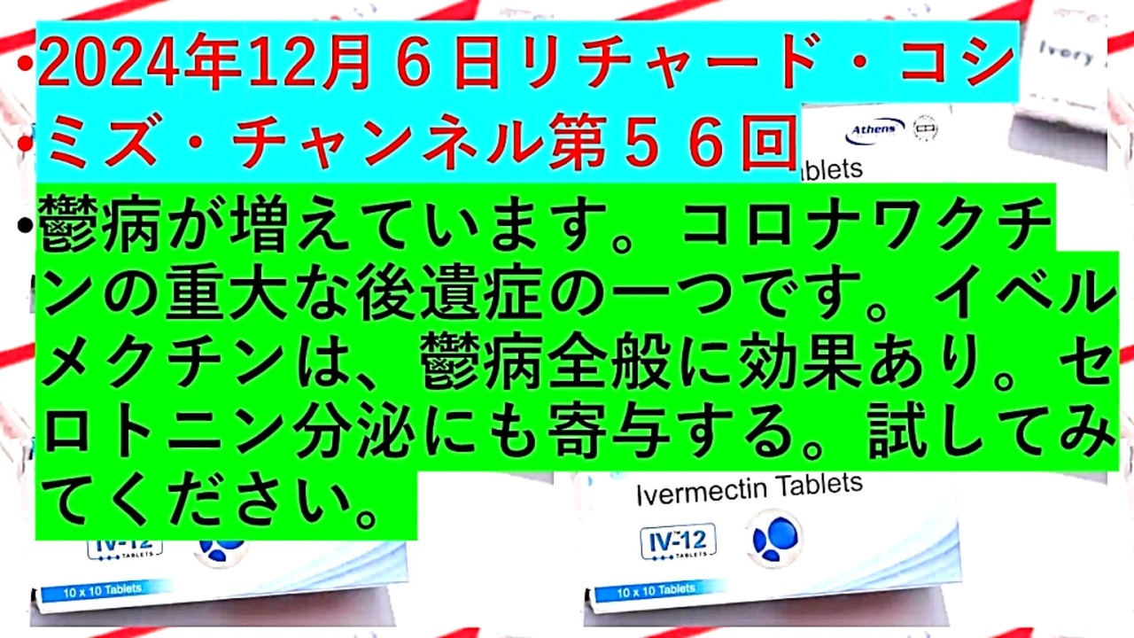 <span style="color: #cc0000;"><strong>◐『 リチャード・コシミズ・チャンネル⦅ 第56回放送 ⦆⦅ 暫定版 ⦆』</strong></span><br><br> <span style="color: #ff0000;"><strong>「『 鬱病 』が『 増えています 』。『 コロナワクチン 』の『 重大 』な『 後遺症 』の『 一つ 』です。『 イベルメクチン 』は、<br> 『 鬱病全般 』に『 効果 』あり。『 セロトニン分泌 』にも『 寄与 』する。『 試してみて下さい 』」</strong></span><br><br> <span style="color: #38761d;"><strong>◐『 リチャード・コシミズ 書籍 :「 2024年 鳥インフルH5N1バイオテロを生き抜くために 」』</strong></span><br> <span style="color: #0000ff;"><strong><a href="https://x.gd/AG1bf" target="_blank" rel="noopener nofollow">https://x.gd/AG1bf</a></strong></span><br><br> <span style="color: #38761d;"><strong>◐ 『 リチャード・コシミズ・チャンネル⦅ ニコニコ チャンネル ⦆』</strong></span><br> <span style="color: #0000ff;"><strong><a href="https://ch.nicovideo.jp/richardkoshimizu" target="_blank" rel="noopener nofollow">https://ch.nicovideo.jp/richardkoshimizu</a></strong></span><br><br> <span style="color: #38761d;"><strong>◐ 『 リチャード・コシミズ ニコニコ生放送⦅ LIVE ⦆』</strong></span><br> <span style="color: #0000ff;"><strong><a href="https://www.nicovideo.jp/user/120930363/live_programs" target="_blank" rel="noopener nofollow">https://www.nicovideo.jp/user/120930363/live_programs</a></strong></span><br><br> <span style="color: #38761d;"><strong>◐ 『 リチャード・コシミズ「 Rumble 」公式 動画ギャラリー 』</strong></span><br> <span style="color: #0000ff;"><strong><a href="https://rumble.com/user/richardkoshimizu" target="_blank" rel="noopener nofollow">https://rumble.com/user/richardkoshimizu</a></strong></span><br> <span style="color: #0000ff;"><strong><a href="https://rumble.com/user/RKVideoGallery" target="_blank" rel="noopener nofollow">https://rumble.com/user/RKVideoGallery</a></strong></span><br><br>