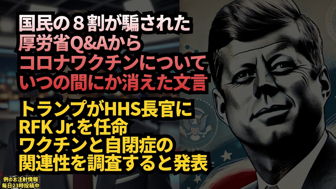 mRNAは接種後数日以内に分解され、作られるスパ イク蛋白も接種後2週間でなくなると言われています。<br><br>やっぱり、厚労省は消したか。<br><a href="https://x.gd/5Ex3o" target="_blank" rel="noopener nofollow">https://x.gd/5Ex3o</a><br><br>厚労省Q&Aから最近何故これが消えたのか?<br><a href="https://x.gd/7pLtJ" target="_blank" rel="noopener nofollow">https://x.gd/7pLtJ</a><br><br><br>『速報:トランプ氏が、HHS(健康福祉省)長官としてRFK Jr.を任命し、ワクチンと自閉症の関連性を調査することを発表。<br><a href="https://x.gd/XxNXk" target="_blank" rel="noopener nofollow">https://x.gd/XxNXk</a><br><br>トランプ次期大統領は、保健福祉省長官にロバート・ケネディ・ジュニア氏を指名し、ワクチンと自閉症の関連性を調査する方針を示しました。NBCの記者に「子どもの予防接種廃止を望むのか」と問われた際、トランプ氏は「もしそれが子どもにとって危険なら」と回答。<br><br>トランプ氏は、自閉症の増加に触れ、「原因を徹底的に調査すべき」と述べる一方で、過去の研究で否定された主張も示唆しました。また、「一部のワクチンは素晴らしいが、見直しが必要なものもあるかもしれない」と慎重な姿勢を強調。<br><br>さらに、トランプ氏は自身の邸宅「マー・ア・ラゴ」で製薬業界と会談し、健康問題の解決策を模索する意向を明らかにしました。<br><br>トランプ氏、<br>保険福祉省長官指名のケネディ氏に<br>小児用ワクチン廃止の検討「認める」(CNN.co.jp) - Yahoo!ニュース<br><a href="https://x.gd/rpMiQ" target="_blank" rel="noopener nofollow">https://x.gd/rpMiQ</a><br><br>記事<br><a href="https://x.gd/c0Z1Z" target="_blank" rel="noopener nofollow">https://x.gd/c0Z1Z</a><br><br>いいサムネが奇跡的に作れました<br><a href="https://seiga.nicovideo.jp/seiga/im11530502" target="_blank" rel="noopener">im11530502</a><br><br><br>新型コロナウイルス<br>ワクチン<br>コロナワクチン<br>mRNAワクチン<br>スパイクタンパク<br>厚労省<br>厚労省Q&A<br>スパイクタンパクは2週間で消える<br>トランプ大統領<br>ロバート・ケネディ・ジュニア<br>小児用ワクチンの廃止<br><br>マイリンク<a href="https://lit.link/keiichiro8140" target="_blank" rel="noopener nofollow">https://lit.link/keiichiro8140</a><br><br><br><br />著作権、肖像権に配慮して作成しております。<br><br>◆気になったニュースの台本!?<br>メモ代わりに作った台本をそのままあげてます<br><a href="https://keiichiro8140.hatenablog.com/." target="_blank" rel="noopener nofollow">https://keiichiro8140.hatenablog.com/.</a><br><br><br>ここからはシリーズ紹介<br><br><br>◆ ワクチン解毒・デトックス<br><a href="https://x.gd/fZweg" target="_blank" rel="noopener nofollow">https://x.gd/fZweg</a><br><br>◆ウイリアム・マキス博士のがん治療(イベルメクチン・フェンベンダゾール等)<br><a href="https://x.gd/AtFYS" target="_blank" rel="noopener nofollow">https://x.gd/AtFYS</a><br><br>◆予防接種健康被害救済制度<br><a href="https://x.gd/0xK9x" target="_blank" rel="noopener nofollow">https://x.gd/0xK9x</a><br><br>◆気になったニュース #1501~<br><br>◆ 【ショートver】気になったニュース<br><a href="https://x.gd/7MxXC" target="_blank" rel="noopener nofollow">https://x.gd/7MxXC</a><br><br>◆ 気になったニュース #1001~<br><a href="https://x.gd/Lp8gv" target="_blank" rel="noopener nofollow">https://x.gd/Lp8gv</a><br><br>◆ 気になったニュース #501~<br><a href="https://x.gd/EmbS4" target="_blank" rel="noopener nofollow">https://x.gd/EmbS4</a><br><br>◆ 気になったニュース #1~#500<br><a href="https://x.gd/uPhNb" target="_blank" rel="noopener nofollow">https://x.gd/uPhNb</a><br><br>◆ X(旧Twitter)・テレグラムで気になった情報<br><a href="https://x.gd/YG6FT" target="_blank" rel="noopener nofollow">https://x.gd/YG6FT</a><br><br>◆ 日比谷5万人パレードデ⚪生放送アーカイブ動画<br><a href="https://x.gd/3CHJv" target="_blank" rel="noopener nofollow">https://x.gd/3CHJv</a><br><br>◆日比谷5万人パレード⚪モのマイリスト作ってみました<br><a href="https://nico.ms/mylist/76828848?ref=sp_other" target="_blank" rel="noopener nofollow">https://nico.ms/mylist/76828848?ref=sp_other</a><br><br>◆3.30 令和の百姓⚪⚪<br><a href="https://www.nicovideo.jp/series/511791?ref=garage_share_other" target="_blank" rel="noopener nofollow">https://www.nicovideo.jp/series/511791?ref=garage_share_other</a><br><br>◆ 及川幸久さんの【XNEWS】シリーズ<br><a href="https://x.gd/3k78K" target="_blank" rel="noopener nofollow">https://x.gd/3k78K</a><br><br>◆これまでの動画<a href="https://x.gd/sPXoJ" target="_blank" rel="noopener nofollow">https://x.gd/sPXoJ</a><br><br>◆もしも(BAN)の時のためのマイリンク集<a href="https://lit.link/K-16_News44" target="_blank" rel="noopener nofollow">https://lit.link/K-16_News44</a><br><br>