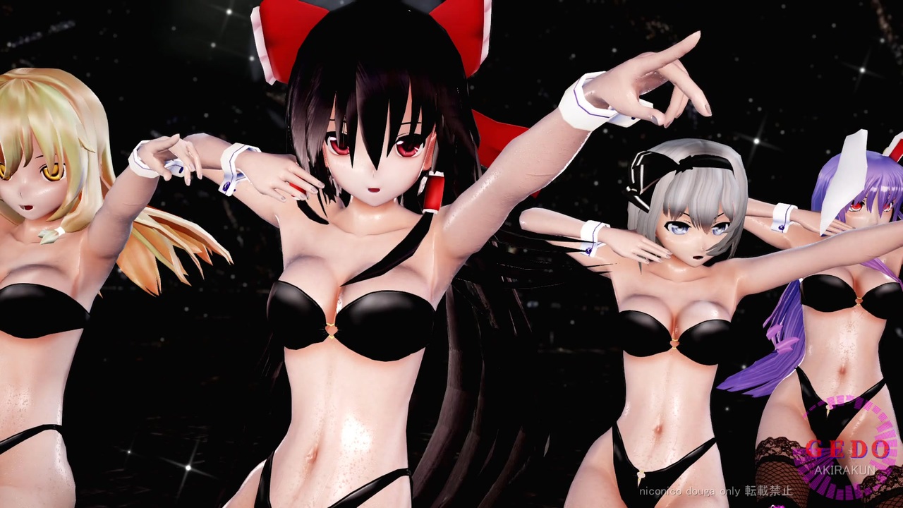 霊夢・魔理沙・アリス・鈴仙・妖夢の5人に踊ってもらいました。この作品は「東方project」の2次創作です。現在、作成リクエストは受け付けていません。<br><br><br>【楽曲】:「GEDO」: daraku様 <a href="https://www.nicovideo.jp/watch/sm41187136" class="watch">sm41187136</a><br><br>【トレース元】:足太ぺんた様 <a href="https://www.nicovideo.jp/watch/sm41588794" class="watch">sm41588794</a><br><br>【モーション】:anyk-1 様 <a href="https://www.nicovideo.jp/watch/sm43902209" class="watch">sm43902209</a><br><br>【カメラ】:鉛筆様 <a href="https://www.nicovideo.jp/watch/sm44015028" class="watch">sm44015028</a><br><br><br>■ステージ<br>廃高速ステージ:NOB 様 <a href="https://seiga.nicovideo.jp/seiga/im4942463" target="_blank" rel="noopener">im4942463</a><br><br>■モデル<br>霊夢、魔理沙、アリス:にがもん様、しえら様<br>FL改_鈴仙・U・イナバ_v4.10:フリック様 <a href="https://www.nicovideo.jp/watch/sm19270846" class="watch">sm19270846</a><br>魂魄妖夢:アールビット様<br>衣装:アールビット様<br><br>■エフェクト<br>Ray-mmd-1.5.2:Rui様<br>初心者マテリアル:さらしな様<br>肌マテリアル:MARUSU様<br>AutoLuminous4:そぼろ様<br>水面エフェクト:ビームマンP様<br>空中に漂う埃:化身バレッタ様<br>ikBokeh_v020a:ikeno様<br><br><br>MikuMikuDance:樋口優様<br>MMEffect :舞力介入P様<br>PMDE、PmxE:極北P様<br>AviUtl :KENくん様<br>・Aviutl + x264guiExでエンコード:rigaya様<br>Ut Video Codec Suite:ゆーむP様<br>上海アリス幻楽団・東方project(ZUN様)<br><br><br>mylist ③<a href="https://www.nicovideo.jp/mylist/75586824" target="_blank" rel="noopener">mylist/75586824</a> ② <a href="https://www.nicovideo.jp/mylist/72970530" target="_blank" rel="noopener">mylist/72970530</a> ① <a href="https://www.nicovideo.jp/mylist/63690967" target="_blank" rel="noopener">mylist/63690967</a> 旧 <a href="https://www.nicovideo.jp/mylist/61238351" target="_blank" rel="noopener">mylist/61238351</a><br><br> ※動画の転載は禁止です。 <br>Attention,Unauthorized reproduction prohibited!!