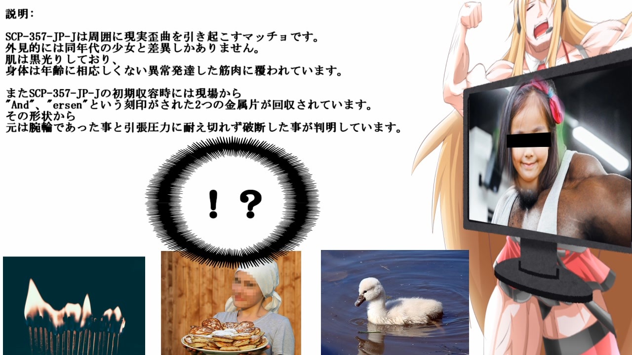 タイトル: SCP-357-JP-J - マッチョが売りの少女<br>作者: blackey<br>ソース: <a href="http://scp-jp.wikidot.com/scp-357-jp-j" target="_blank" rel="noopener nofollow">http://scp-jp.wikidot.com/scp-357-jp-j</a><br>ライセンス: CC BY-SA 3.0<br><br><br>近況:<br><br>ああ…<br>クセになってんだ<br>個別のトレーニングにすると辛いから<br>合間合間にスクワットするの<br><br><br><span style="color: #000000; font-size: 14px;"><strong>夜鷹が鳴く頃に 見て欲しいもの入れ(創作物)</strong></span><br><span style="color: #006699; font-size: 14px;"><a href="https://www.nicovideo.jp/mylist/66904506" target="_blank" rel="noopener">mylist/66904506</a></span><br><span style="color: #000000; font-size: 14px;">(SCPシリーズ他まとめ)</span><br><br>youtubeアカウント<br><a href="https://www.youtube.com/@user-yq7os2gt6b" target="_blank" rel="noopener nofollow">https://www.youtube.com/@user-yq7os2gt6b</a><br><br>ウマ娘トレーナーID / 474456856<br><br>X / @MTzLFGalKimIJAZ