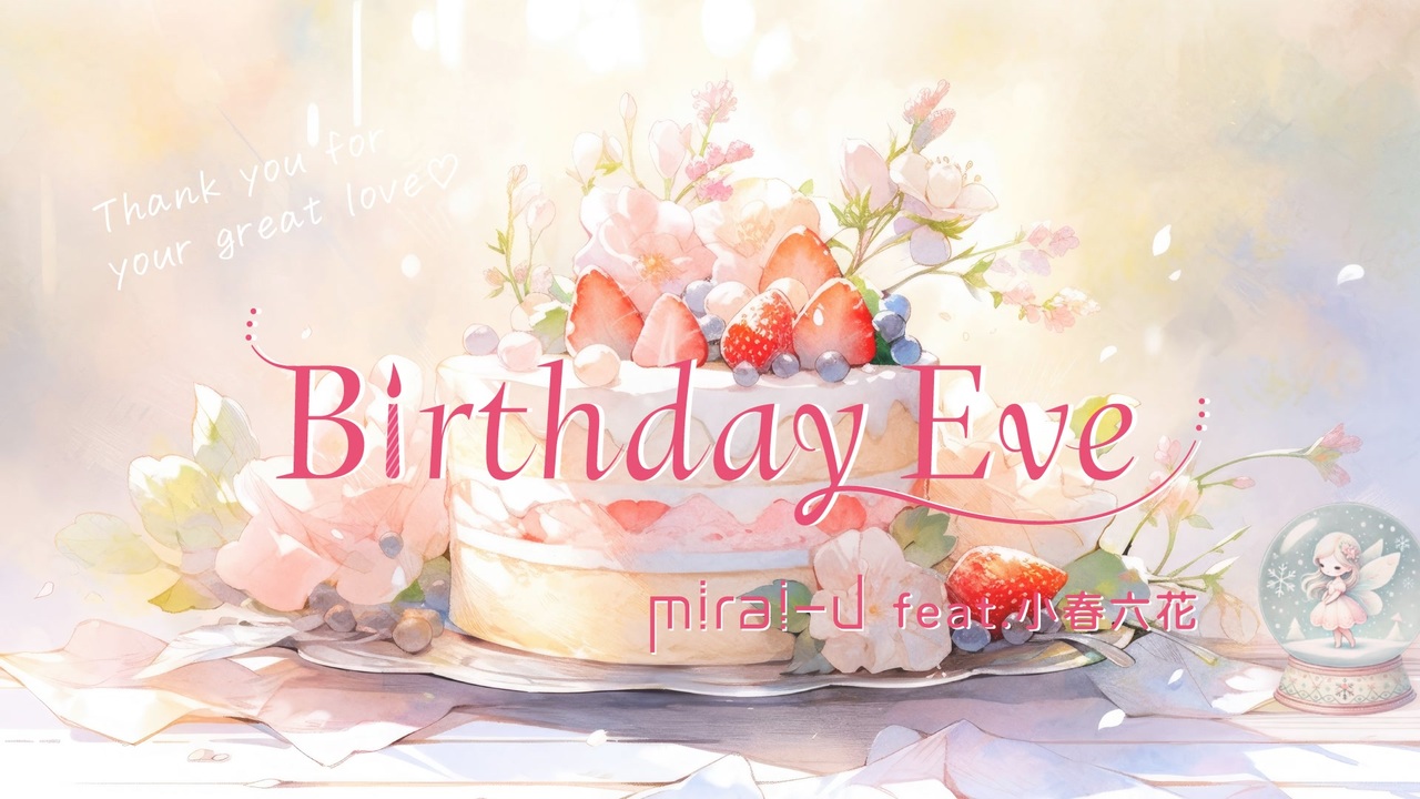 mirai-U Project 第3弾 Birthday Eve<br><br>■title:BirthdayEve feat.小春六花 / mirai-U<br>■Vocal:小春六花<br>■Lyrics&Logo:miki-U <a href="https://x.com/mikiU_music" target="_blank" rel="noopener nofollow">https://x.com/mikiU_music</a><br>■Music&Piano:未来進 <a href="https://twitter.com/Tothefuture2001" target="_blank" rel="noopener nofollow">https://twitter.com/Tothefuture2001</a><br>■comment:<br>BirthdayEve...この世に生まれてきたことに感謝する日<br>当たり前のような日常...そうやって幸せな暮らしができるのも<br>これまで育んでくれた大切な家族や愛があったからこそ...そんな優しい歌です<br><br>弾幕で応援してもらえたら嬉しいです<br>❄☪︎⋆˚✞˚。❄⋆❄☪︎⋆˚✞˚。❄⋆<br>❄️゚❆。˚☪︎⋆。˚✞˚。⋆☪︎˚。❆゚❄️<br><br>ぜひ 別アレンジとなっている本家miki-Uさんの歌声と合わせてお聴きください<br>Birthday Eve / mirai-U<br><a href="https://www.nicovideo.jp/watch/sm44417917" target="_blank" rel="noopener nofollow">https://www.nicovideo.jp/watch/sm44417917</a><br><br>■Lyrics<br><br>I wish you a happy birthday<br><br>きらめく街並み 空が白く舞う頃<br>この世に生を受け今 私はここにいる<br><br>繰り返す平穏 注がれる愛は<br>気がつかないほど 大きく当たり前で<br><br>ああー 冷たく消え入りそうなあの日も<br>隣でやさしく微笑んで<br>ひとりじゃないと思えた<br><br>今年のイブは一緒にいられないけど<br>もう少しあなたの近くで 幸せ感じさせてください<br><br>I wish you a happy birthday