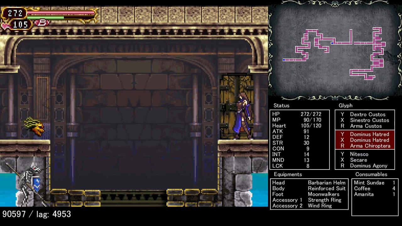 制作:Geinuhayst & hellagels<br>記録:95615フレーム / 26:38.215 @59.8261fps<br>追記回数:152567<br><br>旧記録から28723フレーム(约8分0.108秒)も更新出来た。メニュー操作がとにかく速いため装備品やアイテムを動画の中で表示するようにしました。<br><br>主な新技:<br>1. マジカルチケット使えない場面でも別のアイテムを選択し次のフレームでカーソルをマジカルチケットに合わせることで使用できる<br>2. A+L/A+Rでグリフの装備を切り替えることでMP回復速度最大50%上昇<br>3. ユニオンセカーレとイグニスを用いたオブジェクト消去で様々な効果を引き起こす<br>4. 部屋から出た時メニュー連打で画面切替を阻止することができる、外側に遠く行った状態で画面を切り替えると先の部屋の端から離れた場所で再開するのも可能<br><br>TASVideos→<a href="https://tasvideos.org/9417S" target="_blank" rel="noopener nofollow">https://tasvideos.org/9417S</a><br>自作TAS→<a href="https://www.nicovideo.jp/mylist/47539213" target="_blank" rel="noopener">mylist/47539213</a>