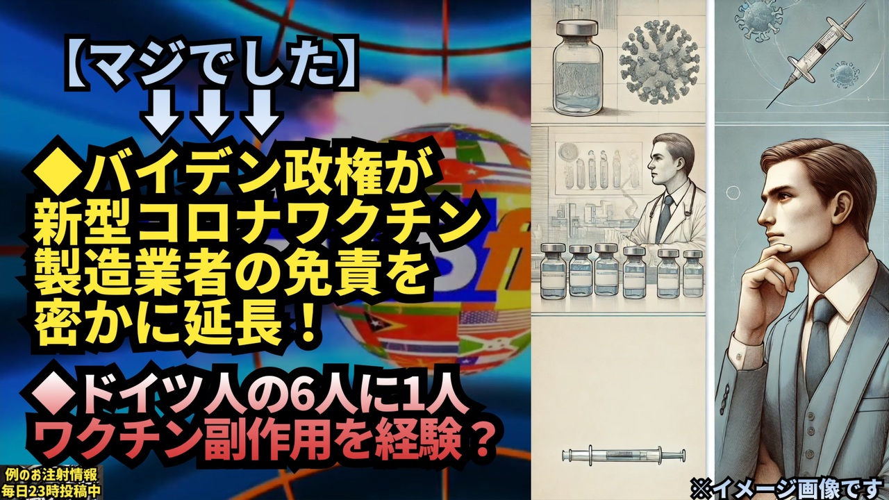 もし何も悪いことをしていないのなら…なぜ免責が必要なのでしょう?<br><br>「安全で効果的」だと分かるはずですよね…?<br><a href="https://x.com/liz_churchill10/status/1868056727524147456?t=krji_tzxLNfDBIHsdxJCXA&s=19" target="_blank" rel="noopener nofollow">https://x.com/liz_churchill10/status/1868056727524147456?t=krji_tzxLNfDBIHsdxJCXA&s=19</a><br><br>デイリーメール<br><a href="https://www.dailymail.co.uk/health/article-14189845/amp/president-joe-biden-protect-vaccine-manufacturers-injury-claims-2029.html" target="_blank" rel="noopener nofollow">https://www.dailymail.co.uk/health/article-14189845/amp/president-joe-biden-protect-vaccine-manufacturers-injury-claims-2029.html</a><br><br>2029年までCOVID-19「ワクチン」責任シールドを延長することは、雪崩をうって発生した負傷、障害、死亡に対する説明責任を回避するための腐敗した方法である。<br><a href="https://x.com/McCulloughFund/status/1867974404614783008?t=fCHjB2XHSC3OokAX372rfg&s=09" target="_blank" rel="noopener nofollow">https://x.com/McCulloughFund/status/1867974404614783008?t=fCHjB2XHSC3OokAX372rfg&s=09</a><br><br><br>「NEW - フォルサ研究所の代表的な調査によると、ドイツ人の6人に1人以上がコロナワクチン接種に関連した副作用を経験していることがわかりました」<br>NEW - More than one in six Germans has experienced side effects in connection with a corona vaccination, according to a representative survey by the Forsa Institute <br><a href="https://x.com/disclosetv/status/1846077066573181356?t=OAsmu6eh5fkMnMMWIobxAw&s=19" target="_blank" rel="noopener nofollow">https://x.com/disclosetv/status/1846077066573181356?t=OAsmu6eh5fkMnMMWIobxAw&s=19</a><br><br>NOZ<br><a href="https://www.noz.de/deutschland-welt/politik/artikel/corona-jeder-sechste-deutsche-klagt-ueber-impf-nebenwirkungen-47852597" target="_blank" rel="noopener nofollow">https://www.noz.de/deutschland-welt/politik/artikel/corona-jeder-sechste-deutsche-klagt-ueber-impf-nebenwirkungen-47852597</a><br><br>Looks like they worked... <br>どうやらうまくいったようです...<br><a href="https://t.co/41gHkb7jcR" target="_blank" rel="noopener nofollow">https://t.co/41gHkb7jcR</a><br><br><br><br><br><br />著作権、肖像権に配慮して作成しております。<br><br>◆気になったニュースの台本!?<br>メモ代わりに作った台本をそのままあげてます<br><a href="https://keiichiro8140.hatenablog.com/." target="_blank" rel="noopener nofollow">https://keiichiro8140.hatenablog.com/.</a><br><br><br>ここからはシリーズ紹介<br><br><br>◆ ワクチン解毒・デトックス<br><a href="https://x.gd/fZweg" target="_blank" rel="noopener nofollow">https://x.gd/fZweg</a><br><br>◆ウイリアム・マキス博士のがん治療(イベルメクチン・フェンベンダゾール等)<br><a href="https://x.gd/AtFYS" target="_blank" rel="noopener nofollow">https://x.gd/AtFYS</a><br><br>◆予防接種健康被害救済制度<br><a href="https://x.gd/0xK9x" target="_blank" rel="noopener nofollow">https://x.gd/0xK9x</a><br><br>◆気になったニュース #1501~<br><br>◆ 【ショートver】気になったニュース<br><a href="https://x.gd/7MxXC" target="_blank" rel="noopener nofollow">https://x.gd/7MxXC</a><br><br>◆ 気になったニュース #1001~<br><a href="https://x.gd/Lp8gv" target="_blank" rel="noopener nofollow">https://x.gd/Lp8gv</a><br><br>◆ 気になったニュース #501~<br><a href="https://x.gd/EmbS4" target="_blank" rel="noopener nofollow">https://x.gd/EmbS4</a><br><br>◆ 気になったニュース #1~#500<br><a href="https://x.gd/uPhNb" target="_blank" rel="noopener nofollow">https://x.gd/uPhNb</a><br><br>◆ X(旧Twitter)・テレグラムで気になった情報<br><a href="https://x.gd/YG6FT" target="_blank" rel="noopener nofollow">https://x.gd/YG6FT</a><br><br>◆ 日比谷5万人パレードデ⚪生放送アーカイブ動画<br><a href="https://x.gd/3CHJv" target="_blank" rel="noopener nofollow">https://x.gd/3CHJv</a><br><br>◆日比谷5万人パレード⚪モのマイリスト作ってみました<br><a href="https://nico.ms/mylist/76828848?ref=sp_other" target="_blank" rel="noopener nofollow">https://nico.ms/mylist/76828848?ref=sp_other</a><br><br>◆3.30 令和の百姓⚪⚪<br><a href="https://www.nicovideo.jp/series/511791?ref=garage_share_other" target="_blank" rel="noopener nofollow">https://www.nicovideo.jp/series/511791?ref=garage_share_other</a><br><br>◆ 及川幸久さんの【XNEWS】シリーズ<br><a href="https://x.gd/3k78K" target="_blank" rel="noopener nofollow">https://x.gd/3k78K</a><br><br>◆これまでの動画<a href="https://x.gd/sPXoJ" target="_blank" rel="noopener nofollow">https://x.gd/sPXoJ</a><br><br>◆もしも(BAN)の時のためのマイリンク集<a href="https://lit.link/K-16_News44" target="_blank" rel="noopener nofollow">https://lit.link/K-16_News44</a><br><br>