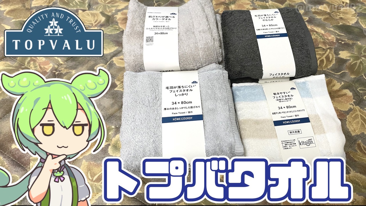 今回は趣向を変え、トップバリュ(ホームコーディー)と呼ばれる <br>雑貨類に付けられる青トプバの商品からタオルを紹介します。 <br>肌触り(3種類)、サイズ(4種類)カラーバリエーション(8種類)があり <br>今回は一番小さなフェイスタオルを購入。 <br>基本のタオル以外にも機能性を高めた別シリーズがあったので 合わせて検証してみました。 <br><br><br>【前回の青トプバ】 <br>トップバリュの青いヤツ「電動給湯ポット2.2L(5980円)」2024.07.13<br>(※ニコニコ休止中の為、YouTube動画になります)<br><a href="https://www.youtube.com/watch?v=lBaVLc1tDQg" target="_blank" rel="noopener nofollow">https://www.youtube.com/watch?v=lBaVLc1tDQg</a><br><br>【参考】 <br>ホームコーディの肌ざわりが選べるカラータオル(498円)(イオンスタイルオンライン) <br><a href="https://aeonretail.com/product/0/P-4549414567731/" target="_blank" rel="noopener nofollow">https://aeonretail.com/product/0/P-4549414567731/</a><br> ホームコーディ 乾きやすいフェイスタオル(部屋干し臭対応)(598円)(イオンスタイルオンライン) <br><a href="https://aeonretail.com/product/0/P-4549414281675/P-454941428167501/" target="_blank" rel="noopener nofollow">https://aeonretail.com/product/0/P-4549414281675/P-454941428167501/</a> <br>よくあるご質問:タオルなどのゴワゴワを抑える方法を知りたいです。(日立グループ) <br><a href="https://kadenfan.hitachi.co.jp/support/wash/q_a/a115.html" target="_blank" rel="noopener nofollow">https://kadenfan.hitachi.co.jp/support/wash/q_a/a115.html</a> <br>今治タオルを乾燥機にかけるのはアリ?ナシ?2023.11.22(tocdoton) <a href="https://to-coton.com/blogs/column/imabari-towel-tumble-dryer" target="_blank" rel="noopener nofollow">https://to-coton.com/blogs/column/imabari-towel-tumble-dryer</a> タオルに関する説明(たおる小町)<br> <a href="https://www.towel-komachi.co.jp/hpgen/HPB/categories/15135.html" target="_blank" rel="noopener nofollow">https://www.towel-komachi.co.jp/hpgen/HPB/categories/15135.html</a><br>エアーかおる(浅野撚糸)<br><a href="https://asanen.co.jp/" target="_blank" rel="noopener nofollow">https://asanen.co.jp/</a><br><br>【使用した素材】(※敬称略) <br>(合成音声)VOICEVOX/ずんだもん/四国めたん<br> <a href="https://voicevox.hiroshiba.jp/" target="_blank" rel="noopener nofollow">https://voicevox.hiroshiba.jp/</a> (立ち絵)坂本アヒル<br> <a href="https://seiga.nicovideo.jp/seiga/im10788496?track" target="_blank" rel="noopener nofollow">https://seiga.nicovideo.jp/seiga/im10788496?track</a> <br>(楽曲)甘茶の音楽工房/「楽しい麦畑」「お城の舞踏会」 <br><a href="https://amachamusic.chagasi.co" target="_blank" rel="noopener nofollow">https://amachamusic.chagasi.co</a><br>