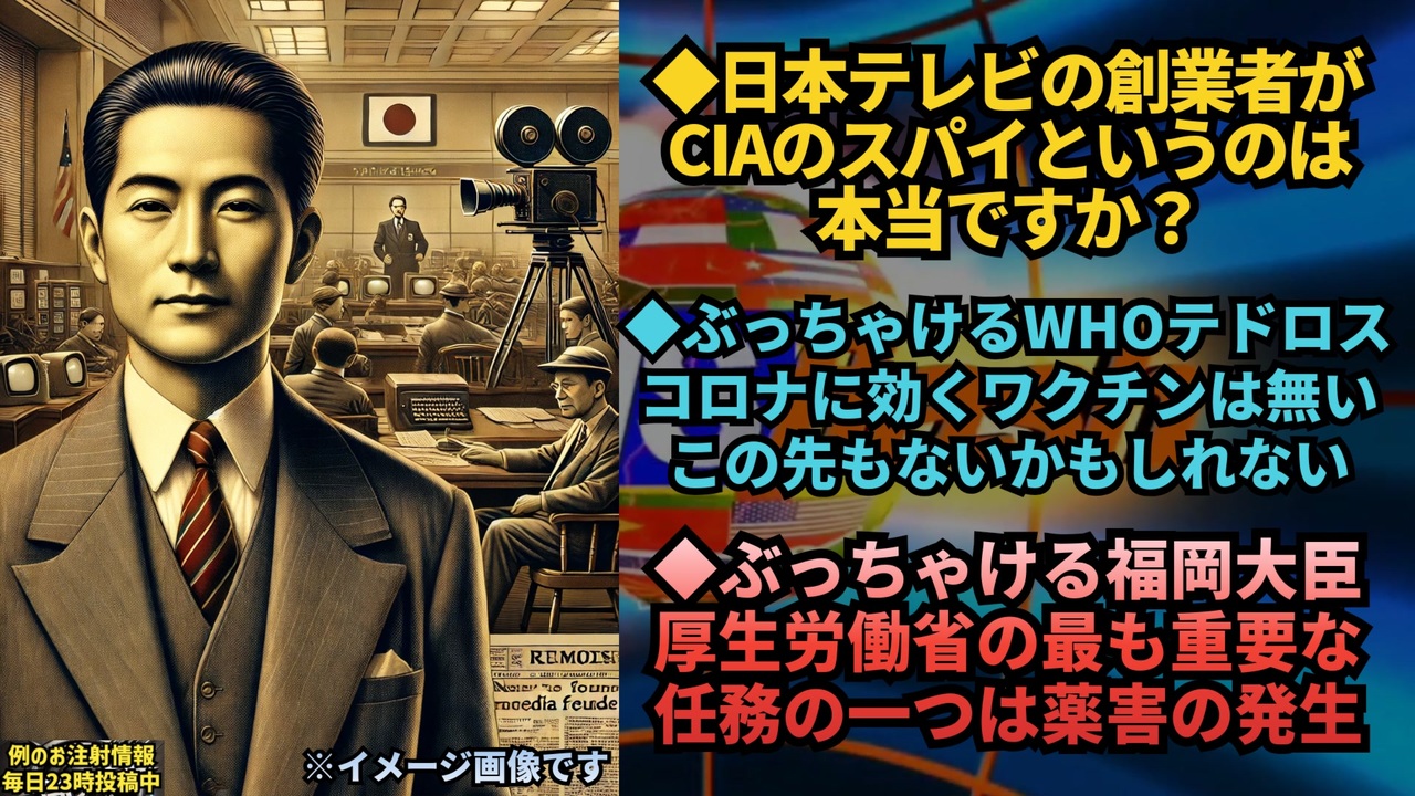 日本テレビの創業者である正力松太郎がCIAのスパイだったという情報は、アメリカ政府の公式文書により確認されています。<br>具体的には、正力松太郎はCIAの代理人として活動していたことが知られています。<br><br>追加情報:<br>正力松太郎は、元読売新聞社社主であり、日本の警察官僚、政治家でもありました。<br>彼のCIAとの関わりは、冷戦時代のアメリカの対日工作の一環とされています。<br><br> <a href="https://x.com/CRNK_HZ/status/1869226601713697014?t=J3YVDDrgh08yFQ7QH8yToA&s=19" target="_blank" rel="noopener nofollow">https://x.com/CRNK_HZ/status/1869226601713697014?t=J3YVDDrgh08yFQ7QH8yToA&s=19</a><br><br>本当だ。<br>「日本へのテレビ放送の導入と原子力発電の導入について、正力はCIAと利害が一致していたので協力し合うことになった。」<br>「気をつけないと、知らないうちに自分たちを利用しかねない人間だった」<br><br><a href="https://x.com/deelgai/status/1869264177023557768?t=sKVLA6TphRaqAsF51LwcGQ&s=19" target="_blank" rel="noopener nofollow">https://x.com/deelgai/status/1869264177023557768?t=sKVLA6TphRaqAsF51LwcGQ&s=19</a><br><br><br>WHO テドロス事務総長<br>コロナ感染に効くワクチンは無いと言う<br>では 今のワクチンは なんの為に打たせているか<br>ワクチンに意味が無いので有れば即刻中止せよ<br><a href="https://x.com/N4er5BANKPkQFQe/status/1869178198052999452?t=4-ac6ztMK3nrYqbOFFgi_Q&s=09" target="_blank" rel="noopener nofollow">https://x.com/N4er5BANKPkQFQe/status/1869178198052999452?t=4-ac6ztMK3nrYqbOFFgi_Q&s=09</a><br><br><br>福岡厚労大臣 「厚生労働省の最も重要な任務のひとつは『薬害の発生』である」と述べる(動画)<br><a href="https://x.com/TotalWorld1/status/1868906473368990030?t=raXf9zxjO3ZNsKlqrGvYFw&s=19" target="_blank" rel="noopener nofollow">https://x.com/TotalWorld1/status/1868906473368990030?t=raXf9zxjO3ZNsKlqrGvYFw&s=19</a><br><br>福岡厚生労働大臣<br>「薬害の発生というのは最も重要な任務のひとつ」<br>さすがに言い間違えだと思います。拡散しないようにお願いします。<br><a href="https://x.com/JINKOUZOUKA_jp/status/1868866450934645151?t=CvuWuJiZVD_hC24UWGvyvg&s=19" target="_blank" rel="noopener nofollow">https://x.com/JINKOUZOUKA_jp/status/1868866450934645151?t=CvuWuJiZVD_hC24UWGvyvg&s=19</a><br><br><br>マイリンク<a href="https://lit.link/keiichiro8140" target="_blank" rel="noopener nofollow">https://lit.link/keiichiro8140</a><br />著作権、肖像権に配慮して作成しております。<br><br>◆気になったニュースの台本!?<br>メモ代わりに作った台本をそのままあげてます<br><a href="https://keiichiro8140.hatenablog.com/." target="_blank" rel="noopener nofollow">https://keiichiro8140.hatenablog.com/.</a><br><br><br>ここからはシリーズ紹介<br><br><br>◆ ワクチン解毒・デトックス<br><a href="https://x.gd/fZweg" target="_blank" rel="noopener nofollow">https://x.gd/fZweg</a><br><br>◆ウイリアム・マキス博士のがん治療(イベルメクチン・フェンベンダゾール等)<br><a href="https://x.gd/AtFYS" target="_blank" rel="noopener nofollow">https://x.gd/AtFYS</a><br><br>◆予防接種健康被害救済制度<br><a href="https://x.gd/0xK9x" target="_blank" rel="noopener nofollow">https://x.gd/0xK9x</a><br><br>◆気になったニュース #1501~<br><br>◆ 【ショートver】気になったニュース<br><a href="https://x.gd/7MxXC" target="_blank" rel="noopener nofollow">https://x.gd/7MxXC</a><br><br>◆ 気になったニュース #1001~<br><a href="https://x.gd/Lp8gv" target="_blank" rel="noopener nofollow">https://x.gd/Lp8gv</a><br><br>◆ 気になったニュース #501~<br><a href="https://x.gd/EmbS4" target="_blank" rel="noopener nofollow">https://x.gd/EmbS4</a><br><br>◆ 気になったニュース #1~#500<br><a href="https://x.gd/uPhNb" target="_blank" rel="noopener nofollow">https://x.gd/uPhNb</a><br><br>◆ X(旧Twitter)・テレグラムで気になった情報<br><a href="https://x.gd/YG6FT" target="_blank" rel="noopener nofollow">https://x.gd/YG6FT</a><br><br>◆ 日比谷5万人パレードデ⚪生放送アーカイブ動画<br><a href="https://x.gd/3CHJv" target="_blank" rel="noopener nofollow">https://x.gd/3CHJv</a><br><br>◆日比谷5万人パレード⚪モのマイリスト作ってみました<br><a href="https://nico.ms/mylist/76828848?ref=sp_other" target="_blank" rel="noopener nofollow">https://nico.ms/mylist/76828848?ref=sp_other</a><br><br>◆3.30 令和の百姓⚪⚪<br><a href="https://www.nicovideo.jp/series/511791?ref=garage_share_other" target="_blank" rel="noopener nofollow">https://www.nicovideo.jp/series/511791?ref=garage_share_other</a><br><br>◆ 及川幸久さんの【XNEWS】シリーズ<br><a href="https://x.gd/3k78K" target="_blank" rel="noopener nofollow">https://x.gd/3k78K</a><br><br>◆これまでの動画<a href="https://x.gd/sPXoJ" target="_blank" rel="noopener nofollow">https://x.gd/sPXoJ</a><br><br>◆もしも(BAN)の時のためのマイリンク集<a href="https://lit.link/K-16_News44" target="_blank" rel="noopener nofollow">https://lit.link/K-16_News44</a><br><br>