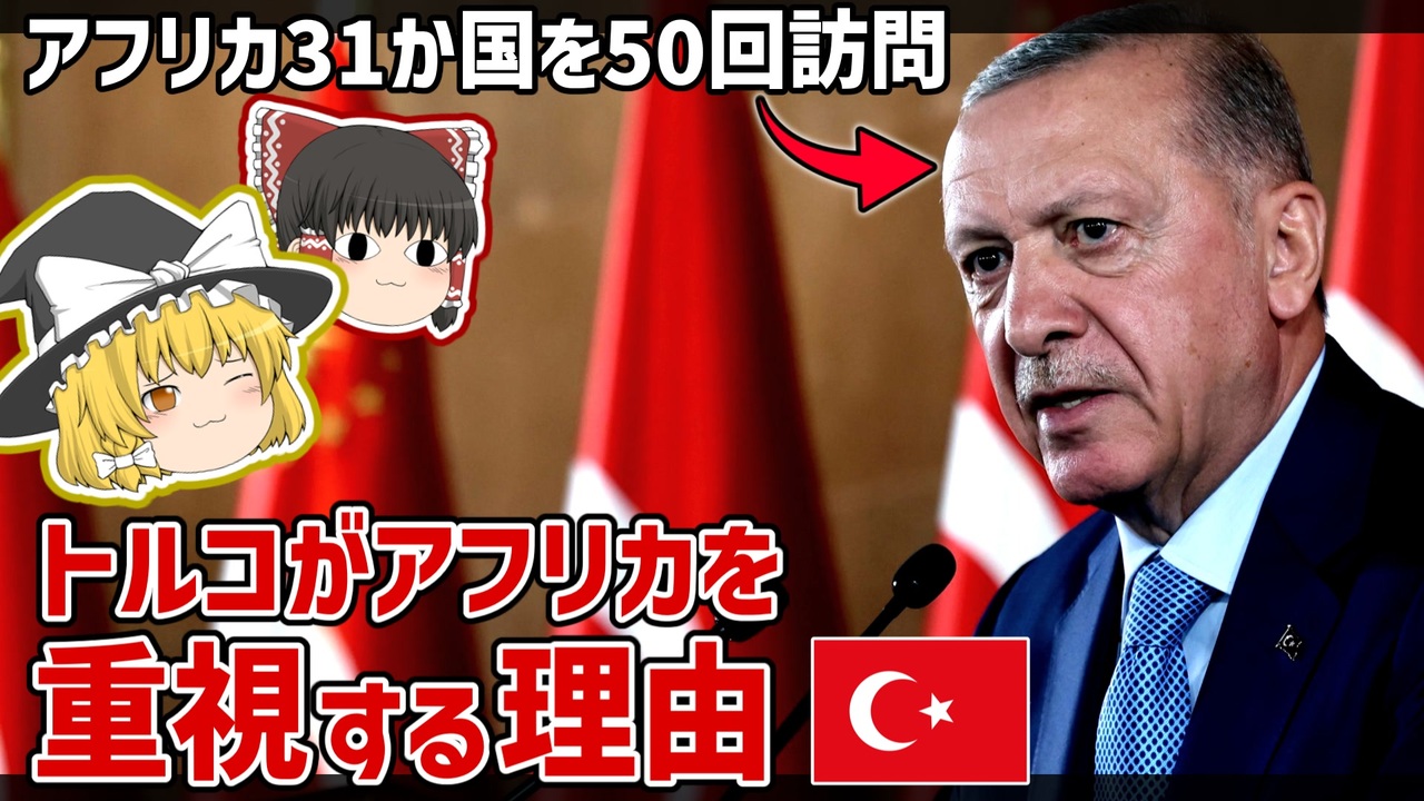 <span style="font-size: 18px;">エルドアン大統領</span><br>2003年から2014年までの首相時代と2014年から現在に至るまでの大統領時代、<br>合わせて約20年近くトルコ国家の中心にいた人物です。<br><br>そんな彼はアフリカ31か国を50回訪問し、在アフリカ大使館の数を増やすなど、<br><strong>「アフリカ重視」</strong>の姿勢をとってきました。<br><br><span style="font-size: 16px;">今回はそんなトルコがアフリカ重視をする理由について解説してみました!</span><br><br><br>◆参考文献等<a href="https://note.com/africarner1960/n/n710f4f408aff" target="_blank" rel="noopener nofollow">https://note.com/africarner1960/n/n710f4f408aff</a> <br>◆Twitter <a href="https://twitter.com/AfrikaanerMaris" target="_blank" rel="noopener nofollow">https://twitter.com/AfrikaanerMaris</a> <br>◆マイリスト <a href="https://www.nicovideo.jp/mylist/73354161" target="_blank" rel="noopener nofollow">https://www.nicovideo.jp/mylist/73354161</a><br>