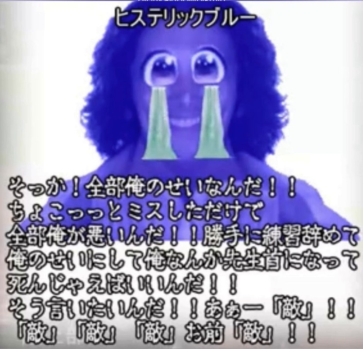 エナジェティックなトランスだけどダンスとかハウス感じるので初投稿です<br>ありがと那須!<br><br>そっか全部俺のせいなんだ<br>ちょこっっとミスしただけで全部俺が悪いんだ<br>勝手に練習辞めて俺のせいにして<br>俺なんか先生クビになって<br>死んじゃえばいいんだ <br>そう言いたいんだあぁー <br>「敵」「敵」「敵」お前「敵」