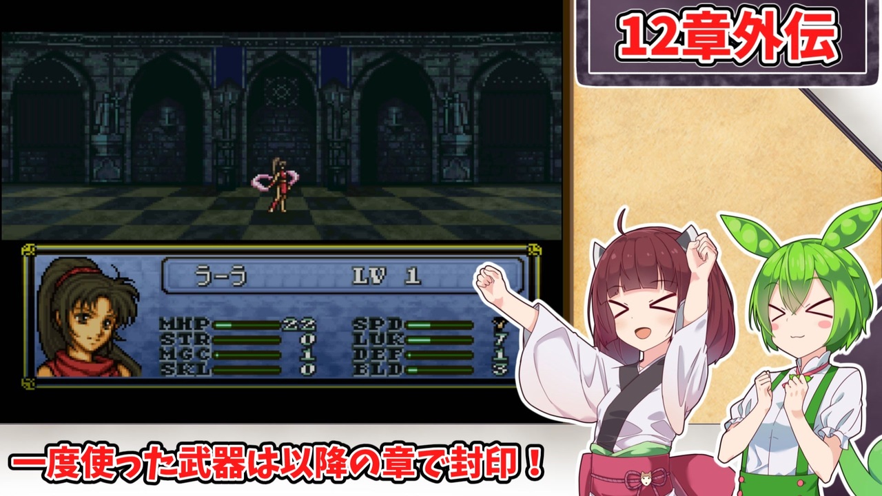 <span style="color: #85200c; font-size: 24px;"><strong><i>クラスチェンジでこのクラスになれる作品はレアですねぇ</i></strong></span><br><br><br><span style="font-size: 16px;"><strong>1:一度使用した武器種は、以降の章で使用する事を禁止する。<br>2:武器の使用の定義は『その武器を装備した状態で敵との戦闘が発生したタイミング』<br>または『その武器を使って敵に「捕える」コマンドを実行したタイミング』<br>杖の場合は『対象に対して使用した時点(命中の可否は問わない)』とする。 </strong></span><br><span style="color: #ff0000; font-size: 16px;"><strong>※同盟軍、演出による戦闘イベントでは使用した判定にはならないこととする。</strong></span><span style="font-size: 16px;"><strong> <br>3:仲間を47人生存させ、【外伝】を含む全ての章を攻略し、総合評価でB以上の状態でゲームをクリアする。</strong></span><br><br><br>本動画のシリーズリスト【<a href="https://www.nicovideo.jp/series/482976" target="_blank" rel="noopener">series/482976</a>】<br>『烈火』の同縛りプレイ【<a href="https://www.nicovideo.jp/series/406473" target="_blank" rel="noopener">series/406473</a>】<br>『封印』の同縛りプレイ【<a href="https://www.nicovideo.jp/series/316824" target="_blank" rel="noopener">series/316824</a>】<br>前:【<a href="https://www.nicovideo.jp/watch/sm44424728" class="watch">sm44424728</a>】次:【<a href="https://www.nicovideo.jp/watch/sm44474154" class="watch">sm44474154</a>】<br><br><strong>使用したソフト</strong><br>VOICEROID+東北きりたんEX<br>VOICEVOX:ずんだもん<br><strong>お借りした素材</strong><br>ニコニコモンズの皆様(コンテンツツリー参照)