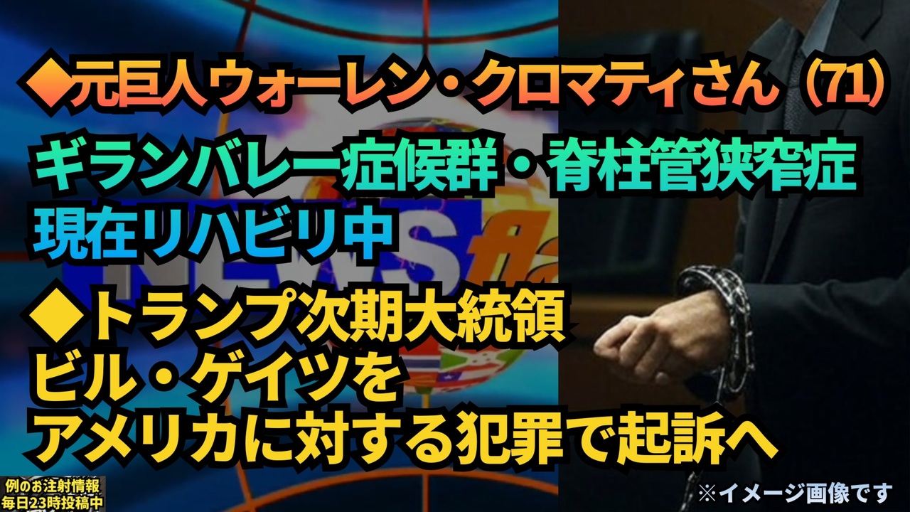 元巨人 ウォーレン・クロマティさん(71)<br>コロナワクチンによる影響があった<br><br>2021年 ワクチン接種<br>2021年12月 コロナに罹患、急激な腰痛<br>2022年1月 歩けなくなった<br>ワクチン由来のギランバレー症<br>脊柱管狭窄症(せきちゅうかんきょうさくしょう)で手術<br>2023年春 徳島大学病院で再手術<br>現在リハビリ中<br>①<a href="https://x.gd/QMp7G" target="_blank" rel="noopener nofollow">https://x.gd/QMp7G</a><br>②<a href="https://x.gd/1HiCB" target="_blank" rel="noopener nofollow">https://x.gd/1HiCB</a><br>③<a href="https://x.gd/lk85C" target="_blank" rel="noopener nofollow">https://x.gd/lk85C</a> (YouTube)<br><br><br>トランプ次期大統領、ビル ゲイツを「アメリカに対する犯罪」で起訴へ<br>Source: @tpvsean<br><a href="https://x.gd/uUysJ" target="_blank" rel="noopener nofollow">https://x.gd/uUysJ</a><br><br><br>トランプ氏、ビル・ゲイツを「アメリカへの犯罪」で訴追へ<br><br>次期トランプ政権は、アンソニー・ファウチ博士を訴追し、さらに億万長者で「優生思想家」とされるビル・ゲイツ氏を人道に対する罪でグアンタナモ湾へ送る計画を進めているとの報道が出ています。<br><br>トランプ氏の移行チームの内部関係者によれば、この法的に複雑な計画には、ゲイツ氏のアメリカ国籍を剥奪し、「敵性戦闘員」として指定することが含まれているとのことです。これは、ゲイツ氏が「グローバリストの陰謀」に加担し、アメリカに対する犯罪を行ったとされる容疑によるものです。<br><br>さらに一部では、ゲイツ氏が100万人以上のアメリカ人の死に直接関与している可能性があると主張されています。このような大胆な措置は、トランプ氏の「アメリカを再び偉大にする」という使命だけでなく、「アメリカを再び健康で公正な国にする」ための中心的な取り組みであるとされています。<br><a href="https://x.gd/2s4ct" target="_blank" rel="noopener nofollow">https://x.gd/2s4ct</a><br><br><br>インフルワクチンの接種率が去年よりも悪いから、今急増している、という記事(「例年より早く患者が急増している理由に、‟ワクチン接種率の低下”が考えられる」)だが、主に接種していない人たちが感染しているのかどうか調べた上でなければ意味がないと思う。<br><a href="https://x.gd/JTJwZ" target="_blank" rel="noopener nofollow">https://x.gd/JTJwZ</a><br><br><br>マイリンク<a href="https://lit.link/keiichiro8140" target="_blank" rel="noopener nofollow">https://lit.link/keiichiro8140</a><br><br><br />著作権、肖像権に配慮して作成しております。<br><br>◆気になったニュースの台本!?<br>メモ代わりに作った台本をそのままあげてます<br><a href="https://keiichiro8140.hatenablog.com/." target="_blank" rel="noopener nofollow">https://keiichiro8140.hatenablog.com/.</a><br><br><br>ここからはシリーズ紹介<br><br><br>◆ ワクチン解毒・デトックス<br><a href="https://x.gd/fZweg" target="_blank" rel="noopener nofollow">https://x.gd/fZweg</a><br><br>◆ウイリアム・マキス博士のがん治療(イベルメクチン・フェンベンダゾール等)<br><a href="https://x.gd/AtFYS" target="_blank" rel="noopener nofollow">https://x.gd/AtFYS</a><br><br>◆予防接種健康被害救済制度<br><a href="https://x.gd/0xK9x" target="_blank" rel="noopener nofollow">https://x.gd/0xK9x</a><br><br>◆気になったニュース #1501~<br><br>◆ 【ショートver】気になったニュース<br><a href="https://x.gd/7MxXC" target="_blank" rel="noopener nofollow">https://x.gd/7MxXC</a><br><br>◆ 気になったニュース #1001~<br><a href="https://x.gd/Lp8gv" target="_blank" rel="noopener nofollow">https://x.gd/Lp8gv</a><br><br>◆ 気になったニュース #501~<br><a href="https://x.gd/EmbS4" target="_blank" rel="noopener nofollow">https://x.gd/EmbS4</a><br><br>◆ 気になったニュース #1~#500<br><a href="https://x.gd/uPhNb" target="_blank" rel="noopener nofollow">https://x.gd/uPhNb</a><br><br>◆ X(旧Twitter)・テレグラムで気になった情報<br><a href="https://x.gd/YG6FT" target="_blank" rel="noopener nofollow">https://x.gd/YG6FT</a><br><br>◆ 日比谷5万人パレードデ⚪生放送アーカイブ動画<br><a href="https://x.gd/3CHJv" target="_blank" rel="noopener nofollow">https://x.gd/3CHJv</a><br><br>◆日比谷5万人パレード⚪モのマイリスト作ってみました<br><a href="https://nico.ms/mylist/76828848?ref=sp_other" target="_blank" rel="noopener nofollow">https://nico.ms/mylist/76828848?ref=sp_other</a><br><br>◆3.30 令和の百姓⚪⚪<br><a href="https://www.nicovideo.jp/series/511791?ref=garage_share_other" target="_blank" rel="noopener nofollow">https://www.nicovideo.jp/series/511791?ref=garage_share_other</a><br><br>◆ 及川幸久さんの【XNEWS】シリーズ<br><a href="https://x.gd/3k78K" target="_blank" rel="noopener nofollow">https://x.gd/3k78K</a><br><br>◆これまでの動画<a href="https://x.gd/sPXoJ" target="_blank" rel="noopener nofollow">https://x.gd/sPXoJ</a><br><br>◆もしも(BAN)の時のためのマイリンク集<a href="https://lit.link/K-16_News44" target="_blank" rel="noopener nofollow">https://lit.link/K-16_News44</a><br><br>