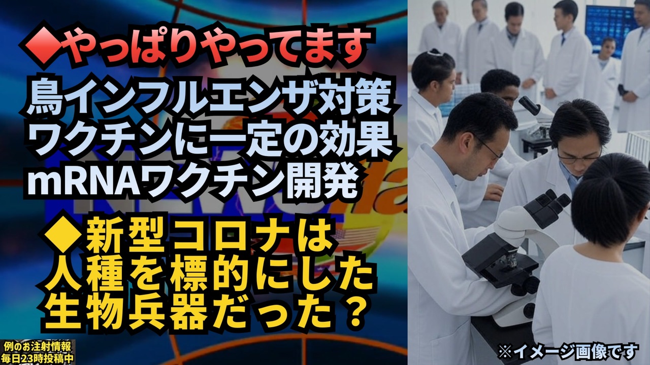 鳥インフルエンザ、mRNAワクチンが準備中のようです。<br><br>>流行の主流となっているタイプに対応したmRNAワクチンを作り、イタチの仲間のフェレットに接種する実験を行いました。<br><br>CDCワクチン開発チームの八田正人研究員は「今回はフェレットを使った実験だが、ワクチンが有効なことが確認できた。今後は、ヒトに接種した場合の効果や、最適な接種量の解明といった、研究が必要だ」としています。<br><br>鳥インフルエンザ対策 “ワクチンに一定の効果” 米CDCなど<br><a href="https://x.com/JINKOUZOUKA_jp/status/1870673230983475646?t=szvwPe69KVZrd1GW_rp3Sg&s=19" target="_blank" rel="noopener nofollow">https://x.com/JINKOUZOUKA_jp/status/1870673230983475646?t=szvwPe69KVZrd1GW_rp3Sg&s=19</a><br><br><br>「これこそがディープステートが恐れるもの」<br>RFKジュニアは、ニューヨーク・ポストのイベントで、『コロナ』は特定の人種を標的にした生物兵器であると正しく説明しました。また、アメリカがウクライナの生物兵器研究所に数億ドルを投じ、同様の生物兵器を開発していることも指摘しました<br><a href="https://t.co/3JwlpZSHmb" target="_blank" rel="noopener nofollow">https://t.co/3JwlpZSHmb</a><br><br><br>ロバート・ケネディ・ジュニア氏は、新型コロナの際に政府が恐怖を利用して人々を支配しようとしたことについてこう述べました。<br>「死ぬよりもずっと悪いことがある。それは奴隷のように生きることだ。」<br><a href="https://x.com/FreeThinkerFit/status/1792058943801594081?t=-QiZ3eWn8mzi5oHlxMlDEw&s=19" target="_blank" rel="noopener nofollow">https://x.com/FreeThinkerFit/status/1792058943801594081?t=-QiZ3eWn8mzi5oHlxMlDEw&s=19</a><br><br><br>鳥インフルエンザ<br>鳥インフルエンザワクチン<br>新型コロナウイルス<br>ワクチン<br>コロナワクチン<br>生物兵器<br>ロバート・ケネディ・ジュニア<br>ウクライナバイオラボ<br>ディープステート<br>遺伝子操作<br>真実<br><br>マイリンク<a href="https://lit.link/keiichiro8140" target="_blank" rel="noopener nofollow">https://lit.link/keiichiro8140</a><br><br><br />著作権、肖像権に配慮して作成しております。<br><br>◆気になったニュースの台本!?<br>メモ代わりに作った台本をそのままあげてます<br><a href="https://keiichiro8140.hatenablog.com/." target="_blank" rel="noopener nofollow">https://keiichiro8140.hatenablog.com/.</a><br><br><br>ここからはシリーズ紹介<br><br><br>◆ ワクチン解毒・デトックス<br><a href="https://x.gd/fZweg" target="_blank" rel="noopener nofollow">https://x.gd/fZweg</a><br><br>◆ウイリアム・マキス博士のがん治療(イベルメクチン・フェンベンダゾール等)<br><a href="https://x.gd/AtFYS" target="_blank" rel="noopener nofollow">https://x.gd/AtFYS</a><br><br>◆予防接種健康被害救済制度<br><a href="https://x.gd/0xK9x" target="_blank" rel="noopener nofollow">https://x.gd/0xK9x</a><br><br>◆気になったニュース #1501~<br><br>◆ 【ショートver】気になったニュース<br><a href="https://x.gd/7MxXC" target="_blank" rel="noopener nofollow">https://x.gd/7MxXC</a><br><br>◆ 気になったニュース #1001~<br><a href="https://x.gd/Lp8gv" target="_blank" rel="noopener nofollow">https://x.gd/Lp8gv</a><br><br>◆ 気になったニュース #501~<br><a href="https://x.gd/EmbS4" target="_blank" rel="noopener nofollow">https://x.gd/EmbS4</a><br><br>◆ 気になったニュース #1~#500<br><a href="https://x.gd/uPhNb" target="_blank" rel="noopener nofollow">https://x.gd/uPhNb</a><br><br>◆ X(旧Twitter)・テレグラムで気になった情報<br><a href="https://x.gd/YG6FT" target="_blank" rel="noopener nofollow">https://x.gd/YG6FT</a><br><br>◆ 日比谷5万人パレードデ⚪生放送アーカイブ動画<br><a href="https://x.gd/3CHJv" target="_blank" rel="noopener nofollow">https://x.gd/3CHJv</a><br><br>◆日比谷5万人パレード⚪モのマイリスト作ってみました<br><a href="https://nico.ms/mylist/76828848?ref=sp_other" target="_blank" rel="noopener nofollow">https://nico.ms/mylist/76828848?ref=sp_other</a><br><br>◆3.30 令和の百姓⚪⚪<br><a href="https://www.nicovideo.jp/series/511791?ref=garage_share_other" target="_blank" rel="noopener nofollow">https://www.nicovideo.jp/series/511791?ref=garage_share_other</a><br><br>◆ 及川幸久さんの【XNEWS】シリーズ<br><a href="https://x.gd/3k78K" target="_blank" rel="noopener nofollow">https://x.gd/3k78K</a><br><br>◆これまでの動画<a href="https://x.gd/sPXoJ" target="_blank" rel="noopener nofollow">https://x.gd/sPXoJ</a><br><br>◆もしも(BAN)の時のためのマイリンク集<a href="https://lit.link/K-16_News44" target="_blank" rel="noopener nofollow">https://lit.link/K-16_News44</a><br><br>