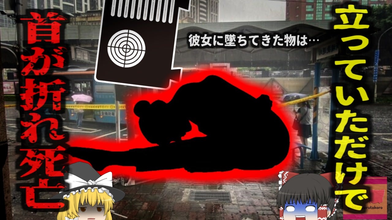 <a href="#" class="seekTime" data-seekTime="00:18" onclick="seekNicoPlayer('#00:18'); return false;">#00:18</a> 駅前のバス停で待っていた女性「Aさん」<br><a href="#" class="seekTime" data-seekTime="1:06" onclick="seekNicoPlayer('#1:06'); return false;">#1:06</a> 視聴上の注意<br><a href="#" class="seekTime" data-seekTime="1:30" onclick="seekNicoPlayer('#1:30'); return false;">#1:30</a> 本編開始<br><a href="#" class="seekTime" data-seekTime="1:45" onclick="seekNicoPlayer('#1:45'); return false;">#1:45</a> 何かがAさんに直撃<br><a href="#" class="seekTime" data-seekTime="2:38" onclick="seekNicoPlayer('#2:38'); return false;">#2:38</a> 一体何があった?<br><a href="#" class="seekTime" data-seekTime="3:21" onclick="seekNicoPlayer('#3:21'); return false;">#3:21</a> 17階から落ちてきた33kgの金属<br><a href="#" class="seekTime" data-seekTime="4:57" onclick="seekNicoPlayer('#4:57'); return false;">#4:57</a> 何故こんな事になったのか<br><a href="#" class="seekTime" data-seekTime="6:25" onclick="seekNicoPlayer('#6:25'); return false;">#6:25</a> 高所での設置作業には細心の注意が必要だったが…<br><br><br>引用・出展・参考文献(視聴者提供資料など<br>RADIO TAIWAN INTL<br><a href="https://ishort.ink/6SyU" target="_blank" rel="noopener nofollow">https://ishort.ink/6SyU</a><br>フォーカス台湾<br><a href="https://ishort.ink/LWKL" target="_blank" rel="noopener nofollow">https://ishort.ink/LWKL</a><br><br><br />※この動画は過去の事件を知り、現在でも同じことが発生する危険性を再認識、関与しないように促すための動画であり、視聴者を扇動、動揺を誘うためのコンテンツではありません。<br><br>ご要望にお応えして、メンバーシップの開設を行いました。<br>下記URLからも登録可能ですので、ご興味がある方は是非ご参加ください。<br><a href="https://www.youtube.com/channel/UCcT5a1J7XJW7CLYI2RKl4pw/join" target="_blank" rel="noopener nofollow">https://www.youtube.com/channel/UCcT5a1J7XJW7CLYI2RKl4pw/join</a><br><br><br>Twitter<br>→<a href="https://twitter.com/yukkurisurutoko" target="_blank" rel="noopener nofollow">https://twitter.com/yukkurisurutoko</a><br><br>取り急ぎ、簡易的にですがマイリストを作りました。<br>【ゆっくり解説】事故・事件関係紹介リスト <br><a href="https://www.nicovideo.jp/mylist/71034319" target="_blank" rel="noopener nofollow">https://www.nicovideo.jp/mylist/71034319</a><br>【ゆっくり解説】放射線系事故<br><a href="https://www.nicovideo.jp/mylist/71034368" target="_blank" rel="noopener nofollow">https://www.nicovideo.jp/mylist/71034368</a><br>【ゆっくり解説】鉄道系事故・事件関連<br><a href="https://www.nicovideo.jp/mylist/71034379" target="_blank" rel="noopener nofollow">https://www.nicovideo.jp/mylist/71034379</a>