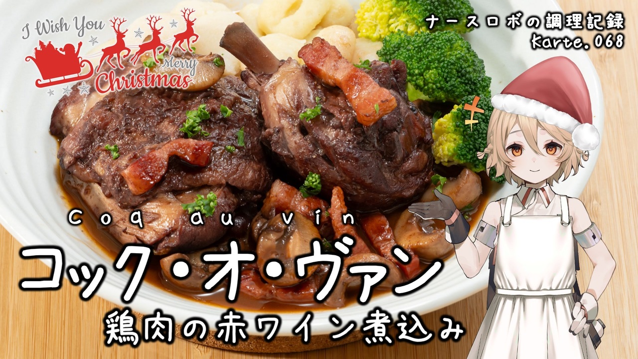 Part68の今回はクリスマスモード!<br>フランス ブルゴーニュ地方の郷土料理 コック・オー・ヴァン(Coq au vin)を作ります!<br>中々贅沢なお料理ですが、クリスマスのメインディッシュにいかがでしょうか?<br>少し難しいですがぜひ作ってみてくださいね。<br><br>音声: VOICEVOX:ナースロボ_タイプT<br>立ち絵: 捨て犬A<br>イラスト: いらすとや<br>SE: otologic, 効果音ラボ<br>BGM: BGMer, FesliyanStudios.com<br /><br>[各種リンク]<br>ニコニコ動画: <a href="http://nicovideo.jp/user/130153578" target="_blank" rel="noopener nofollow">http://nicovideo.jp/user/130153578</a><br>YouTubeメイン(料理): <a href="http://youtube.com/@cooking25euph" target="_blank" rel="noopener nofollow">http://youtube.com/@cooking25euph</a><br>YouTubeサブ(料理以外): <a href="https://youtube.com/@sub25euph" target="_blank" rel="noopener nofollow">https://youtube.com/@sub25euph</a><br>X (twitter): <a href="https://twitter.com/nico25euph" target="_blank" rel="noopener nofollow">https://twitter.com/nico25euph</a><br>Bluesky: <a href="http://nico25euph.bsky.social" target="_blank" rel="noopener nofollow">http://nico25euph.bsky.social</a><br>TikTok: <a href="http://tiktok.com/@nico25euph" target="_blank" rel="noopener nofollow">http://tiktok.com/@nico25euph</a>