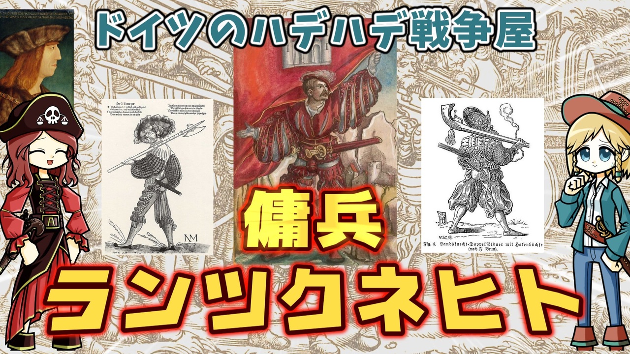 華美な衣装にでっかい剣。いい給料と自己顕示。 <br><br>失業した若い男たちを誘惑するには充分ですね。闇バイトかな? <br>まあぶっちゃけ給料は未払い常習なんだけど。 <br>中世後期から近世初期を彩ったド派手な傭兵たちのお話です。 <br><br>☆復活したニコニコチャンネル「モンド・ヒストリカの離宮」 <br>→<a href="https://ch.nicovideo.jp/mond-historica" target="_blank" rel="noopener nofollow">https://ch.nicovideo.jp/mond-historica</a><br><br>今回の主要参考文献: <br>ハインリヒ・プレティヒャ(2023)『中世への旅 農民戦争と傭兵』関楠生訳白水社<br>菊池良生(2002)『傭兵の二千年史』講談社<br>鈴木直志(2003)『ヨーロッパの傭兵』世界史リブレット80 山川出版社<br><br>その他 Wikipediaなど<br><br>twitter | <a href="https://twitter.com/Yukkuri_mond" target="_blank" rel="noopener nofollow">https://twitter.com/Yukkuri_mond</a><br />━━━━━━━━━━━━━━━━━━━━━<br><br>この動画はクリエイティブ・コモンズ継承(CC-BY-SA)ライセンスの素材を使用して制作しています。(<a href="https://creativecommons.org/licenses/by-sa/4.0/)" target="_blank" rel="noopener nofollow">https://creativecommons.org/licenses/by-sa/4.0/)</a><br>規約に基づき、この動画もCC-BY-SA 4.0 のもとで公開します。<br><br>投稿者共通情報☆彡<br><br>BGM, SE:ニコニ・コモンズ様<br><a href="http://commons.nicovideo.jp/" target="_blank" rel="noopener nofollow">http://commons.nicovideo.jp/</a><br>魔王魂様<br><a href="https://maoudamashii.jokersounds.com/" target="_blank" rel="noopener nofollow">https://maoudamashii.jokersounds.com/</a><br>Audiostock様<br><a href="https://audiostock.jp/" target="_blank" rel="noopener nofollow">https://audiostock.jp/</a><br><br>立ち絵 霊夢・魔理沙(黒子式):nicotalk様<br><a href="http://www.nicotalk.com/charasozai.html" target="_blank" rel="noopener nofollow">http://www.nicotalk.com/charasozai.html</a><br><br>立ち絵 パトラ、マリー、アン、メアリ:ライフライフ様<br><a href="https://0801lifelife.tumblr.com/" target="_blank" rel="noopener nofollow">https://0801lifelife.tumblr.com/</a><br><br>使用ツール1:ゆっくりムービーメーカー4<br><a href="https://manjubox.net/ymm4/" target="_blank" rel="noopener nofollow">https://manjubox.net/ymm4/</a><br><br>使用ツール2:AviUtl<br><a href="http://spring-fragrance.mints.ne.jp/aviutl/" target="_blank" rel="noopener nofollow">http://spring-fragrance.mints.ne.jp/aviutl/</a><br><br>各時代の地図 : World History Maps & Timelines <br><a href="http://geacron.com/home-en/" target="_blank" rel="noopener nofollow">http://geacron.com/home-en/</a><br><br>ゆっくりボイスについて:AquesTalkライセンス取得済み<br><br>キャラクターボイス<br>アン・ボニー:羽ノ華(A.I.VOICE)<br>メアリ・リード:琴葉 葵(A.I.VOICE)<br>クレオパトラ:結月ゆかり(VOICEROID2)<br>マリー‐アントワネット:東北きりたん (VOICEROID EX)<br>その他キャラ:青山龍星(A.I.VOICE)、伊織弓鶴(A.I.VOICE2)、栗田まろん(A.I.VOICE)、宮舞モカ(VOICEPEAK)、フリモメン(VOICEPEAK)<br><br><br><br>その他フリー素材ご提供元の皆様に圧倒的感謝<br>