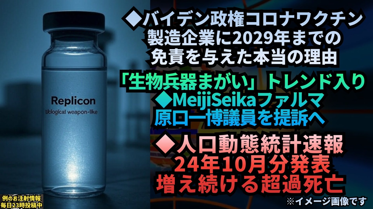 「バイデン政権は、新型コロナワクチン製造企業に2029年までの免責を与えました。」<br><br>翻訳すると、「世界中の人々が、自分たちにHIVやがんが注入されていたことに気づかれたくない、ということです。」<br><br>許すべきではありません。<br><a href="https://x.com/liz_churchill10/status/1871712300450935256?t=RTnzjj3VpcJmIlCxRWg1HQ&s=19" target="_blank" rel="noopener nofollow">https://x.com/liz_churchill10/status/1871712300450935256?t=RTnzjj3VpcJmIlCxRWg1HQ&s=19</a><br><br><br>【名誉毀損】製薬会社が立憲民主・原口一博議員を提訴へ、レプリコンワクチンめぐり「生物兵器まがい」などと発言<br><br>Meiji Seika ファルマは10月、原口氏に警告書を送っていた。その後も同様の発言が確認され、科学的根拠のない中傷で名誉を毀損されたとして提訴するという。<br><br><a href="https://x.com/livedoornews/status/1871774427433865391?t=pDndcxnvlqQzluuvv9F9lg&s=19" target="_blank" rel="noopener nofollow">https://x.com/livedoornews/status/1871774427433865391?t=pDndcxnvlqQzluuvv9F9lg&s=19</a><br><br><br>各社一斉に報道してますね<br><br>これ1周回って生物兵器でしたってデクラスしとるように思えるのは気のせい?<br><br><br><br>人口動態統計速報 24年10月分 でました<br><br>死亡者数 129712人<br>前年同月比 -4281人(-3.2%)<br>超過死亡 +5731人(+4.6%) <br>※社人研推計月毎按分値との差<br><br>前年同月比3.2%減ですが、<br>社人研推計を基準にすると超過です<br>2022年1月に少しだけ予測値を<br>下回って以降33ヶ月連続ずーっと超過です<br><br><a href="https://x.com/cr_cidp/status/1871442232433422844?t=2V0l-eOcB0TLoSO1IAxTVQ&s=19" target="_blank" rel="noopener nofollow">https://x.com/cr_cidp/status/1871442232433422844?t=2V0l-eOcB0TLoSO1IAxTVQ&s=19</a><br><br><br>本日(12/24)厚生労働省公表<br>人口動態統計速報(10月分)<br><br>1月~10月の死亡数の比較(速報値)<br>2020年 1,132,749人 ※コロナ元年<br>2021年 1,195,457人 ※大幅増<br>2022年 1,289,310人 ※超異常<br>2023年 1,310,323人 ※超異常<br>2024年 1,328,678人<br><br>超異常だった過去2年を超える死亡数です。<br>日本人の謎の大量死が起きています。<br><a href="https://x.com/JINKOUZOUKA_jp/status/1871449847049687085?t=XRu05OgMjrUDTumW9ZmA7g&s=19" target="_blank" rel="noopener nofollow">https://x.com/JINKOUZOUKA_jp/status/1871449847049687085?t=XRu05OgMjrUDTumW9ZmA7g&s=19</a><br><br><br />著作権、肖像権に配慮して作成しております。<br><br>◆気になったニュースの台本!?<br>メモ代わりに作った台本をそのままあげてます<br><a href="https://keiichiro8140.hatenablog.com/." target="_blank" rel="noopener nofollow">https://keiichiro8140.hatenablog.com/.</a><br><br><br>ここからはシリーズ紹介<br><br><br>◆ ワクチン解毒・デトックス<br><a href="https://x.gd/fZweg" target="_blank" rel="noopener nofollow">https://x.gd/fZweg</a><br><br>◆ウイリアム・マキス博士のがん治療(イベルメクチン・フェンベンダゾール等)<br><a href="https://x.gd/AtFYS" target="_blank" rel="noopener nofollow">https://x.gd/AtFYS</a><br><br>◆予防接種健康被害救済制度<br><a href="https://x.gd/0xK9x" target="_blank" rel="noopener nofollow">https://x.gd/0xK9x</a><br><br>◆気になったニュース #1501~<br><br>◆ 【ショートver】気になったニュース<br><a href="https://x.gd/7MxXC" target="_blank" rel="noopener nofollow">https://x.gd/7MxXC</a><br><br>◆ 気になったニュース #1001~<br><a href="https://x.gd/Lp8gv" target="_blank" rel="noopener nofollow">https://x.gd/Lp8gv</a><br><br>◆ 気になったニュース #501~<br><a href="https://x.gd/EmbS4" target="_blank" rel="noopener nofollow">https://x.gd/EmbS4</a><br><br>◆ 気になったニュース #1~#500<br><a href="https://x.gd/uPhNb" target="_blank" rel="noopener nofollow">https://x.gd/uPhNb</a><br><br>◆ X(旧Twitter)・テレグラムで気になった情報<br><a href="https://x.gd/YG6FT" target="_blank" rel="noopener nofollow">https://x.gd/YG6FT</a><br><br>◆ 日比谷5万人パレードデ⚪生放送アーカイブ動画<br><a href="https://x.gd/3CHJv" target="_blank" rel="noopener nofollow">https://x.gd/3CHJv</a><br><br>◆日比谷5万人パレード⚪モのマイリスト作ってみました<br><a href="https://nico.ms/mylist/76828848?ref=sp_other" target="_blank" rel="noopener nofollow">https://nico.ms/mylist/76828848?ref=sp_other</a><br><br>◆3.30 令和の百姓⚪⚪<br><a href="https://www.nicovideo.jp/series/511791?ref=garage_share_other" target="_blank" rel="noopener nofollow">https://www.nicovideo.jp/series/511791?ref=garage_share_other</a><br><br>◆ 及川幸久さんの【XNEWS】シリーズ<br><a href="https://x.gd/3k78K" target="_blank" rel="noopener nofollow">https://x.gd/3k78K</a><br><br>◆これまでの動画<a href="https://x.gd/sPXoJ" target="_blank" rel="noopener nofollow">https://x.gd/sPXoJ</a><br><br>◆もしも(BAN)の時のためのマイリンク集<a href="https://lit.link/K-16_News44" target="_blank" rel="noopener nofollow">https://lit.link/K-16_News44</a><br><br>