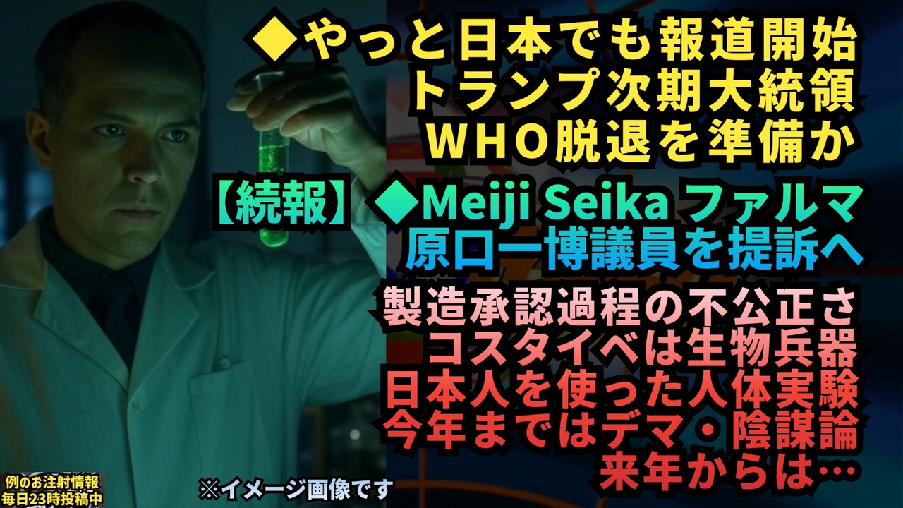 【トランプ氏 WHOの脱退を準備か】<br><a href="https://x.gd/9Tu7F" target="_blank" rel="noopener nofollow">https://x.gd/9Tu7F</a><br><br><br>原口議員がSNSや著書により名誉棄損を行った<br><br>具体的に<br>1.731部隊になぞらえた発言<br>2.コスタイベの製造承認過程の不公正さ<br>3.コスタイベが生物兵器である<br>4.これが人体実験である<br><br>損害について<br>1.原告が多数の迷惑電話を受け120万円の損害が生じている<br>2.コスタイベの見込まれていた57億円の利益がこれまで3億7000万円にとどまっている。<br>3.SNSによる名誉棄損による無形損害が2000万円<br><br>損害は55億7120万円を下回らない。<br>さらに弁護士費用5億5712万円。<br><br>損害金の一部として1000万円の支払いを訴える<br><a href="https://x.gd/0gVz0" target="_blank" rel="noopener nofollow">https://x.gd/0gVz0</a><br><br><br>井上正康教授は、mRNA遺伝子製剤やレプリコン型遺伝子製剤は「ワクチン」ではなく、長年失敗してきた遺伝子治療薬であり、世界的に深刻な被害を引き起こしていると主張しています。また、これらを「ワクチン」と称する政府や企業は、カルタヘナ条約に違反しているとして取り締まりが必要だと述べています。さらに、原口一博議員の主張は医学的に正当であり、それに対する提訴は異常であると批判しています。<br>フジYouTube<br><a href="https://x.gd/dSyiL" target="_blank" rel="noopener nofollow">https://x.gd/dSyiL</a><br>X(旧Twitter)<br><a href="https://x.gd/R7f6p" target="_blank" rel="noopener nofollow">https://x.gd/R7f6p</a><br><br><br>打てば打つほど感染が広がり、死者も増加し、なんと日本人の超過死亡まで激増した薬剤…、それを販売した会社を批判したら訴えられる。<br> <br>こんなことがまかり通るようではこの国はもう終わりですね。<br><br>ちなみに来月HHS長官に就任予定のRFケネディJr.は普通に「生物兵器」と呼んでいます。<br><br>「このまま放置はできない」製薬会社が立憲・原口一博衆院議員を提訴へ 新型コロナ「レプリコンワクチン」を「生物兵器」と中傷<br><a href="https://x.gd/BNqkB" target="_blank" rel="noopener nofollow">https://x.gd/BNqkB</a><br><br>X(旧Twitter)<br><a href="https://x.gd/Lgg6c" target="_blank" rel="noopener nofollow">https://x.gd/Lgg6c</a><br><br><br>フジテレビ系を筆頭に各社が今日のMeijiによる提訴会見を報道。会見案内時より株価値下がり、終値3,129円で年初来安値<br><a href="https://x.gd/fPAjZ" target="_blank" rel="noopener nofollow">https://x.gd/fPAjZ</a><br><br><br />著作権、肖像権に配慮して作成しております。<br><br>◆気になったニュースの台本!?<br>メモ代わりに作った台本をそのままあげてます<br><a href="https://keiichiro8140.hatenablog.com/." target="_blank" rel="noopener nofollow">https://keiichiro8140.hatenablog.com/.</a><br><br><br>ここからはシリーズ紹介<br><br><br>◆ ワクチン解毒・デトックス<br><a href="https://x.gd/fZweg" target="_blank" rel="noopener nofollow">https://x.gd/fZweg</a><br><br>◆ウイリアム・マキス博士のがん治療(イベルメクチン・フェンベンダゾール等)<br><a href="https://x.gd/AtFYS" target="_blank" rel="noopener nofollow">https://x.gd/AtFYS</a><br><br>◆予防接種健康被害救済制度<br><a href="https://x.gd/0xK9x" target="_blank" rel="noopener nofollow">https://x.gd/0xK9x</a><br><br>◆気になったニュース #1501~<br><br>◆ 【ショートver】気になったニュース<br><a href="https://x.gd/7MxXC" target="_blank" rel="noopener nofollow">https://x.gd/7MxXC</a><br><br>◆ 気になったニュース #1001~<br><a href="https://x.gd/Lp8gv" target="_blank" rel="noopener nofollow">https://x.gd/Lp8gv</a><br><br>◆ 気になったニュース #501~<br><a href="https://x.gd/EmbS4" target="_blank" rel="noopener nofollow">https://x.gd/EmbS4</a><br><br>◆ 気になったニュース #1~#500<br><a href="https://x.gd/uPhNb" target="_blank" rel="noopener nofollow">https://x.gd/uPhNb</a><br><br>◆ X(旧Twitter)・テレグラムで気になった情報<br><a href="https://x.gd/YG6FT" target="_blank" rel="noopener nofollow">https://x.gd/YG6FT</a><br><br>◆ 日比谷5万人パレードデ⚪生放送アーカイブ動画<br><a href="https://x.gd/3CHJv" target="_blank" rel="noopener nofollow">https://x.gd/3CHJv</a><br><br>◆日比谷5万人パレード⚪モのマイリスト作ってみました<br><a href="https://nico.ms/mylist/76828848?ref=sp_other" target="_blank" rel="noopener nofollow">https://nico.ms/mylist/76828848?ref=sp_other</a><br><br>◆3.30 令和の百姓⚪⚪<br><a href="https://www.nicovideo.jp/series/511791?ref=garage_share_other" target="_blank" rel="noopener nofollow">https://www.nicovideo.jp/series/511791?ref=garage_share_other</a><br><br>◆ 及川幸久さんの【XNEWS】シリーズ<br><a href="https://x.gd/3k78K" target="_blank" rel="noopener nofollow">https://x.gd/3k78K</a><br><br>◆これまでの動画<a href="https://x.gd/sPXoJ" target="_blank" rel="noopener nofollow">https://x.gd/sPXoJ</a><br><br>◆もしも(BAN)の時のためのマイリンク集<a href="https://lit.link/K-16_News44" target="_blank" rel="noopener nofollow">https://lit.link/K-16_News44</a><br><br>