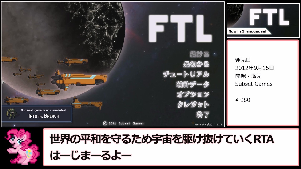 タイムアタック39作目はFTLです。<br><br>最初の会話を進めてから、ラスボス撃破でタイマーストップです。<br><br>年の瀬になんとか投稿間に合いました。<br>大好きなFTLで一年を締めくくれて感無量です。<br>来年もよろしくお願いします。<br><s>あ、一応WRの記録っぽいっすよ。</s><br>無慈悲されちゃった<br><br>youtube版→<a href="https://www.youtube.com/watch?v=xypjHYeEXJE" target="_blank" rel="noopener nofollow">https://www.youtube.com/watch?v=xypjHYeEXJE</a><br>無編集版→<a href="https://www.youtube.com/watch?v=0h9GF-YJCqU" target="_blank" rel="noopener nofollow">https://www.youtube.com/watch?v=0h9GF-YJCqU</a><br />以前の動画 <br>単発物→<a href="https://www.nicovideo.jp/series/338691" target="_blank" rel="noopener">series/338691</a> <br>Rustler→<a href="https://www.nicovideo.jp/series/335004" target="_blank" rel="noopener">series/335004</a> <br>ばっどがいず→<a href="https://www.nicovideo.jp/series/335005" target="_blank" rel="noopener">series/335005</a> <br>百英雄伝rising→<a href="https://www.nicovideo.jp/series/389628" target="_blank" rel="noopener">series/389628</a>
