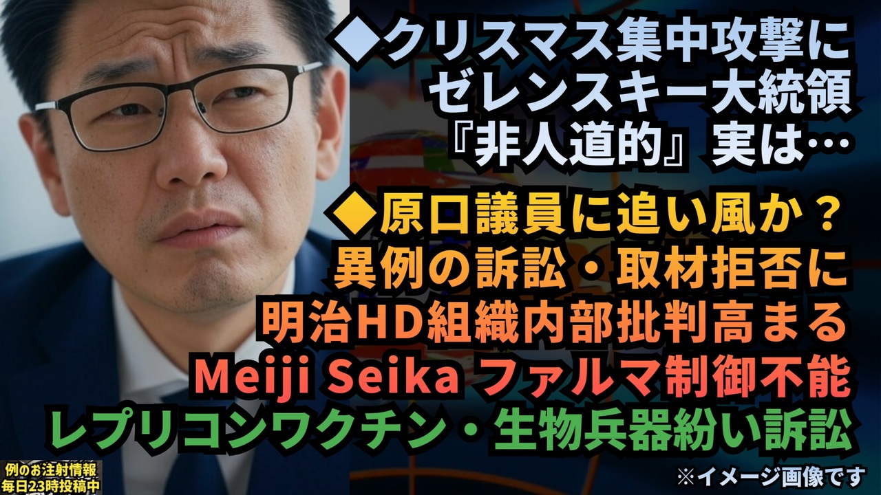 クリスマスの集中攻撃にゼレンスキー大統領「これ以上、非人道的なことがあるだろうか」<br>↓<br>ロシアから提案されたクリスマス停戦を拒否したのがゼレンスキーだということを念頭に置いたうえで記事を読みましょうね<br>X(旧Twitter)<a href="https://x.com/Tamama0306/status/1872141060996251902?t=ylxVXZQZARS9LeLB3lpA5A&s=19" target="_blank" rel="noopener nofollow">https://x.com/Tamama0306/status/1872141060996251902?t=ylxVXZQZARS9LeLB3lpA5A&s=19</a><br><br>クリスマス停戦記事比較<br>Yahoo<br><a href="https://news.yahoo.co.jp/articles/f516abd67693af0e86b312a152114edb740e94eb" target="_blank" rel="noopener nofollow">https://news.yahoo.co.jp/articles/f516abd67693af0e86b312a152114edb740e94eb</a><br>AFP <br><a href="https://www.afpbb.com/articles/-/3553573?cx_amp=all&act=all" target="_blank" rel="noopener nofollow">https://www.afpbb.com/articles/-/3553573?cx_amp=all&act=all</a><br><br><br>ZAITEN<br>【新ワクチンをめぐる〝恫喝訴訟〟にOBら辟易<br>明治HD「製薬子会社」制御不能でガバナンス崩壊】<br><br>Meiji Seikaファルマは…上場会社グループ企業とは思えぬ所業を繰り広げているのだ。<br>Meijiを率いる社長の小林大吉郎とその側近が一連の対応を主導し、社内にも詳しい情報は知らされていないとの声も聞こえてくる。本来ならばブレーキ役となるべき明治HDも静観するばかり。業績にも影響が出てはじめ、まさにガバナンス崩壊とも言える状況に陥っている。<br>(つづきはZAITEN2025年1月号で)<br><a href="https://x.com/kazuchancocone/status/1872248865203855578?t=Sf8uI0vBM7tOxuWzT0d6yw&s=19" target="_blank" rel="noopener nofollow">https://x.com/kazuchancocone/status/1872248865203855578?t=Sf8uI0vBM7tOxuWzT0d6yw&s=19</a><br><br><br>明治HD 「製菓子会社」制御不能でガバナンス崩壊<br><br>「書かせる方載せる方も社会常識に欠けていると言わざるを得ません」<br><br>ZAITENさん、これまで存在に気づかず申し訳ありません<br>これからはチェックします。原口先生への提訴について明治の記事続報をお待ちしたいです<br><br><a href="https://x.com/jazzismy/status/1872094748904935935?t=RrrKMkEHakMrtkqm9gDrEw&s=19" target="_blank" rel="noopener nofollow">https://x.com/jazzismy/status/1872094748904935935?t=RrrKMkEHakMrtkqm9gDrEw&s=19</a><br><br><br>ゼレンスキー大統領<br>ウクライナ<br>ロシア<br>戦争<br>生物兵器<br>レプリコンワクチン<br>コスタイベ<br>MeijiSeikaファルマ<br>原口一博<br>ワクチン<br>コロナワクチン<br><br><br>マイリンク<a href="https://lit.link/keiichiro81401" target="_blank" rel="noopener nofollow">https://lit.link/keiichiro81401</a><br><br><br />著作権、肖像権に配慮して作成しております。<br><br>◆気になったニュースの台本!?<br>メモ代わりに作った台本をそのままあげてます<br><a href="https://keiichiro8140.hatenablog.com/." target="_blank" rel="noopener nofollow">https://keiichiro8140.hatenablog.com/.</a><br><br><br>ここからはシリーズ紹介<br><br><br>◆ ワクチン解毒・デトックス<br><a href="https://x.gd/fZweg" target="_blank" rel="noopener nofollow">https://x.gd/fZweg</a><br><br>◆ウイリアム・マキス博士のがん治療(イベルメクチン・フェンベンダゾール等)<br><a href="https://x.gd/AtFYS" target="_blank" rel="noopener nofollow">https://x.gd/AtFYS</a><br><br>◆予防接種健康被害救済制度<br><a href="https://x.gd/0xK9x" target="_blank" rel="noopener nofollow">https://x.gd/0xK9x</a><br><br>◆気になったニュース #1501~<br><br>◆ 【ショートver】気になったニュース<br><a href="https://x.gd/7MxXC" target="_blank" rel="noopener nofollow">https://x.gd/7MxXC</a><br><br>◆ 気になったニュース #1001~<br><a href="https://x.gd/Lp8gv" target="_blank" rel="noopener nofollow">https://x.gd/Lp8gv</a><br><br>◆ 気になったニュース #501~<br><a href="https://x.gd/EmbS4" target="_blank" rel="noopener nofollow">https://x.gd/EmbS4</a><br><br>◆ 気になったニュース #1~#500<br><a href="https://x.gd/uPhNb" target="_blank" rel="noopener nofollow">https://x.gd/uPhNb</a><br><br>◆ X(旧Twitter)・テレグラムで気になった情報<br><a href="https://x.gd/YG6FT" target="_blank" rel="noopener nofollow">https://x.gd/YG6FT</a><br><br>◆ 日比谷5万人パレードデ⚪生放送アーカイブ動画<br><a href="https://x.gd/3CHJv" target="_blank" rel="noopener nofollow">https://x.gd/3CHJv</a><br><br>◆日比谷5万人パレード⚪モのマイリスト作ってみました<br><a href="https://nico.ms/mylist/76828848?ref=sp_other" target="_blank" rel="noopener nofollow">https://nico.ms/mylist/76828848?ref=sp_other</a><br><br>◆3.30 令和の百姓⚪⚪<br><a href="https://www.nicovideo.jp/series/511791?ref=garage_share_other" target="_blank" rel="noopener nofollow">https://www.nicovideo.jp/series/511791?ref=garage_share_other</a><br><br>◆ 及川幸久さんの【XNEWS】シリーズ<br><a href="https://x.gd/3k78K" target="_blank" rel="noopener nofollow">https://x.gd/3k78K</a><br><br>◆これまでの動画<a href="https://x.gd/sPXoJ" target="_blank" rel="noopener nofollow">https://x.gd/sPXoJ</a><br><br>◆もしも(BAN)の時のためのマイリンク集<a href="https://lit.link/K-16_News44" target="_blank" rel="noopener nofollow">https://lit.link/K-16_News44</a><br><br>