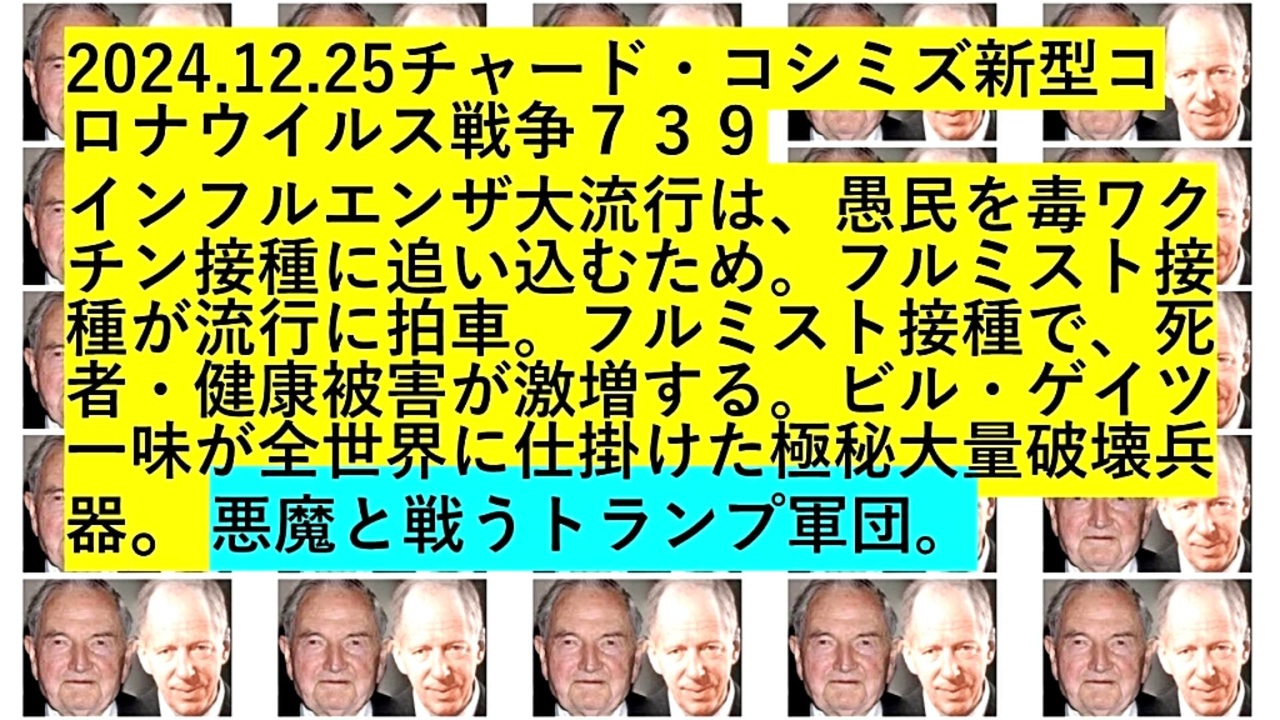 <span style="color: #cc0000;"><strong>◐【 テーマ : 新型コロナウイルス戦争⦅ 739 ⦆⦅ 暫定版 ⦆】</strong></span><br><br> <span style="color: #ff0000;"><strong>「『 インフルエンザ大流行 』は、『 愚民 』を『 毒ワクチン接種 』に『 追い込む 』ため。『 フルミスト接種 』が『 流行 』に『 拍車 』。<br> 『 フルミスト接種 』で、『 死者・健康被害 』が『 激増 』する。『 ビル・ゲイツ一味 』が『 全世界 』に仕掛けた『 極秘大量破壊兵器 』。<br> 『 悪魔 』と戦う『 トランプ軍団 』」</strong></span><br><br> <span style="color: #38761d;"><strong>◐ 『 リチャード・コシミズ・チャンネル⦅ ニコニコ チャンネル ⦆』</strong></span><br> <span style="color: #0000ff;"><strong><a href="https://ch.nicovideo.jp/richardkoshimizu" target="_blank" rel="noopener nofollow">https://ch.nicovideo.jp/richardkoshimizu</a></strong></span><br><br> <span style="color: #38761d;"><strong>◐ 『 リチャード・コシミズ「 ニコニコ生放送⦅ LIVE ⦆」』</strong></span><br> <span style="color: #0000ff;"><strong><a href="https://www.nicovideo.jp/user/120930363/live_programs" target="_blank" rel="noopener nofollow">https://www.nicovideo.jp/user/120930363/live_programs</a></strong></span><br><br> <span style="color: #38761d;"><strong>◐ 『 リチャード・コシミズ「 Rumble 」公式 動画ギャラリー 』</strong></span><br> <span style="color: #0000ff;"><strong><a href="https://rumble.com/user/richardkoshimizu" target="_blank" rel="noopener nofollow">https://rumble.com/user/richardkoshimizu</a></strong></span><br> <span style="color: #0000ff;"><strong><a href="https://rumble.com/user/RKVideoGallery" target="_blank" rel="noopener nofollow">https://rumble.com/user/RKVideoGallery</a></strong></span><br><br>