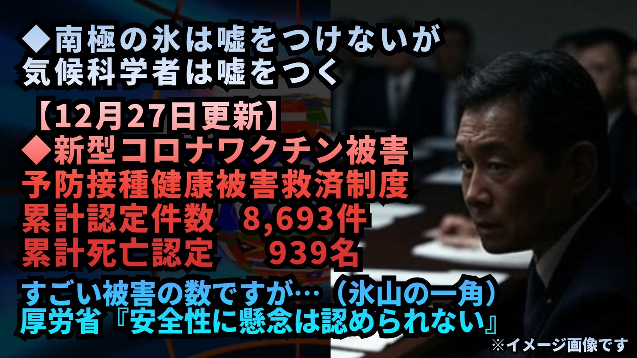 左:1979年12月24日南極大陸の氷<br>右:2024年12月24日南極大陸の氷<br><br>45年で17%拡大しました。<br>キコウヘンドウタイヘンダー<br><a href="https://x.gd/e8VVm" target="_blank" rel="noopener nofollow">https://x.gd/e8VVm</a><br><br><br>南極の海氷面積は1979年に比べて現在17%増加している。氷は嘘をつかないが、気候科学者は嘘をついている<br>①<a href="https://x.gd/bnClS" target="_blank" rel="noopener nofollow">https://x.gd/bnClS</a><br>②<a href="https://x.gd/YmmxV" target="_blank" rel="noopener nofollow">https://x.gd/YmmxV</a><br><br><br>死亡認定は939名に<br><br>【2024年最終版】<br>本日(12/27)厚生労働省公表分を反映<br><br>新型コロナワクチン<br>予防接種健康被害救済制度<br><br>新たに55件(うち死亡3件)が認定されました。<br><br>現時点で国が認めた事例だけで<br>8,693件認定 死亡認定は939名です。 <a href="https://t.co/5vePhkIPeh" target="_blank" rel="noopener nofollow">https://t.co/5vePhkIPeh</a><br><br><br>新型コロナワクチン健康被害認定件数、新たに55件認定、認定件数8,683件、その内死亡認定3件増加の939件<br>81歳 ギラン・バレー症候群<br>70歳 ギラン・バレー症候群<br>62歳 ギラン・バレー症候群<br>47歳 皮膚筋炎<br>81歳 弓部大動脈瘤破裂<br>71歳 急性大動脈解離<br>など<br><a href="https://x.gd/5jePo" target="_blank" rel="noopener nofollow">https://x.gd/5jePo</a><br><br><br>鵜川さん:ここ数日、聴くに耐えきれない面談が続いた。<br>闘病中の母の見舞いに行く為にコロナワクチンを接種した娘さんが接種後に体調に異変を来たし、亡くなった。<br>娘さんは結婚直前だった。<br>母は憔悴し生きる気力を失いかけている。<br>思いやりワクチンとやらで、一つの家族を破滅に追いやっている。<br>厚労省、審査会の者達。<br>これでも重大な懸念は無いと言えるのか?<br>私は600件近くのこう言った話を聞き、国に懸念を認めさせる為に被害者遺族と戦っている。<br>まともに正月なんて迎えられないんだよ。<br><a href="https://x.gd/qNDuk" target="_blank" rel="noopener nofollow">https://x.gd/qNDuk</a><br><br><br />著作権、肖像権に配慮して作成しております。<br><br>◆気になったニュースの台本!?<br>メモ代わりに作った台本をそのままあげてます<br><a href="https://keiichiro8140.hatenablog.com/." target="_blank" rel="noopener nofollow">https://keiichiro8140.hatenablog.com/.</a><br><br><br>ここからはシリーズ紹介<br><br><br>◆ ワクチン解毒・デトックス<br><a href="https://x.gd/fZweg" target="_blank" rel="noopener nofollow">https://x.gd/fZweg</a><br><br>◆ウイリアム・マキス博士のがん治療(イベルメクチン・フェンベンダゾール等)<br><a href="https://x.gd/AtFYS" target="_blank" rel="noopener nofollow">https://x.gd/AtFYS</a><br><br>◆予防接種健康被害救済制度<br><a href="https://x.gd/0xK9x" target="_blank" rel="noopener nofollow">https://x.gd/0xK9x</a><br><br>◆気になったニュース #1501~<br><br>◆ 【ショートver】気になったニュース<br><a href="https://x.gd/7MxXC" target="_blank" rel="noopener nofollow">https://x.gd/7MxXC</a><br><br>◆ 気になったニュース #1001~<br><a href="https://x.gd/Lp8gv" target="_blank" rel="noopener nofollow">https://x.gd/Lp8gv</a><br><br>◆ 気になったニュース #501~<br><a href="https://x.gd/EmbS4" target="_blank" rel="noopener nofollow">https://x.gd/EmbS4</a><br><br>◆ 気になったニュース #1~#500<br><a href="https://x.gd/uPhNb" target="_blank" rel="noopener nofollow">https://x.gd/uPhNb</a><br><br>◆ X(旧Twitter)・テレグラムで気になった情報<br><a href="https://x.gd/YG6FT" target="_blank" rel="noopener nofollow">https://x.gd/YG6FT</a><br><br>◆ 日比谷5万人パレードデ⚪生放送アーカイブ動画<br><a href="https://x.gd/3CHJv" target="_blank" rel="noopener nofollow">https://x.gd/3CHJv</a><br><br>◆日比谷5万人パレード⚪モのマイリスト作ってみました<br><a href="https://nico.ms/mylist/76828848?ref=sp_other" target="_blank" rel="noopener nofollow">https://nico.ms/mylist/76828848?ref=sp_other</a><br><br>◆3.30 令和の百姓⚪⚪<br><a href="https://www.nicovideo.jp/series/511791?ref=garage_share_other" target="_blank" rel="noopener nofollow">https://www.nicovideo.jp/series/511791?ref=garage_share_other</a><br><br>◆ 及川幸久さんの【XNEWS】シリーズ<br><a href="https://x.gd/3k78K" target="_blank" rel="noopener nofollow">https://x.gd/3k78K</a><br><br>◆これまでの動画<a href="https://x.gd/sPXoJ" target="_blank" rel="noopener nofollow">https://x.gd/sPXoJ</a><br><br>◆もしも(BAN)の時のためのマイリンク集<a href="https://lit.link/K-16_News44" target="_blank" rel="noopener nofollow">https://lit.link/K-16_News44</a><br><br>