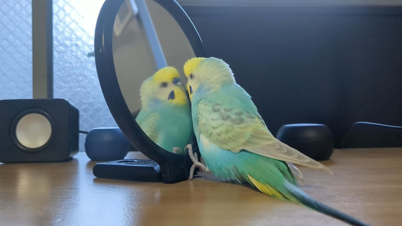鏡に夢中なインコさん