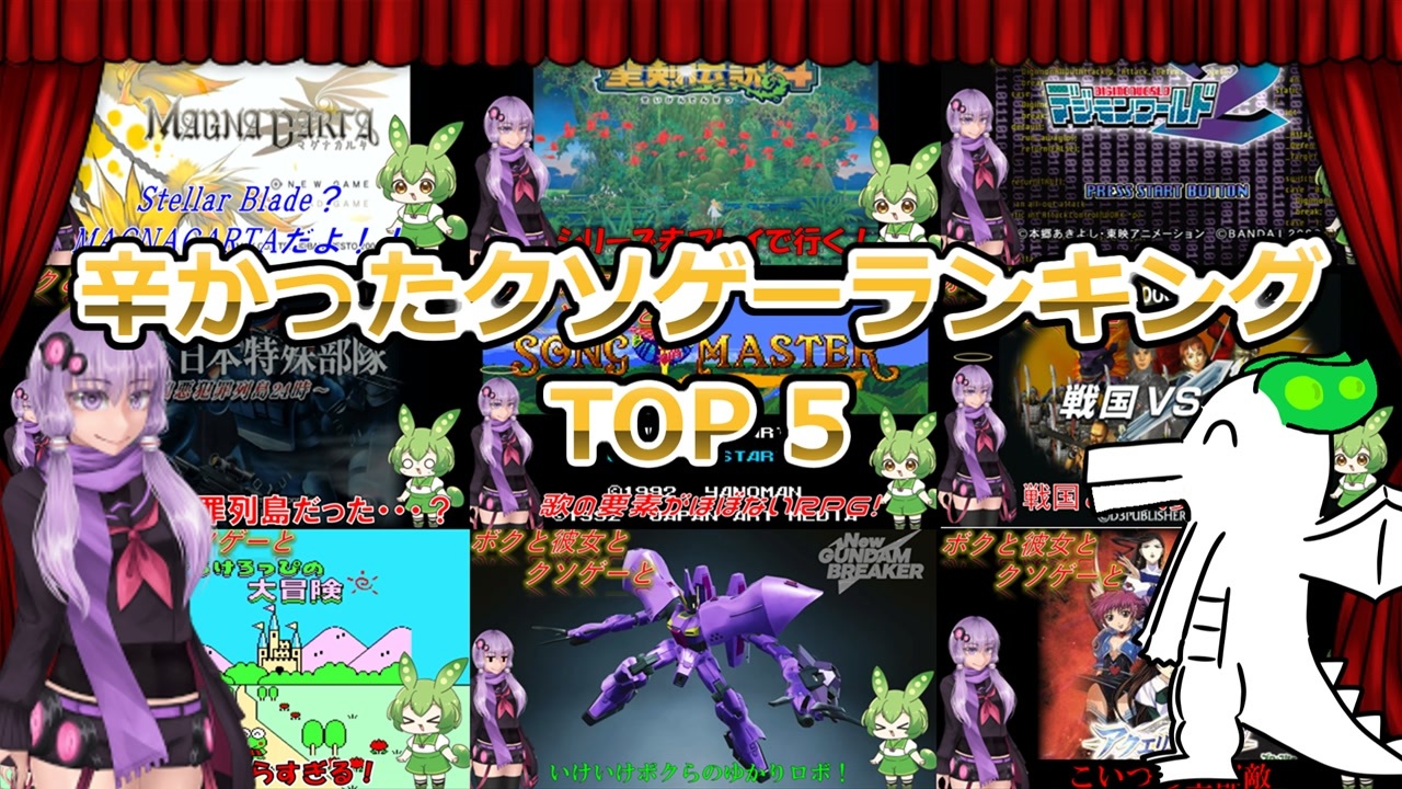 今年プレイしたクソゲーの中からプレイ中に精神的・身体的にダメージを与えてきたクソゲーを順位付け!<br><br>ゆ:ランキングは主観によるものです<br>ず:異論は認めるのだ<br><br>5位:<a href="https://www.nicovideo.jp/watch/sm44154041" target="_blank" rel="noopener nofollow">https://www.nicovideo.jp/watch/sm44154041</a><br>4位:<a href="https://www.nicovideo.jp/watch/sm43775387" target="_blank" rel="noopener nofollow">https://www.nicovideo.jp/watch/sm43775387</a><br>3位:<a href="https://www.nicovideo.jp/watch/sm43745519" target="_blank" rel="noopener nofollow">https://www.nicovideo.jp/watch/sm43745519</a><br>2位:<a href="https://www.nicovideo.jp/watch/sm43124852" target="_blank" rel="noopener nofollow">https://www.nicovideo.jp/watch/sm43124852</a><br>1位:<a href="https://www.nicovideo.jp/watch/sm44101258" target="_blank" rel="noopener nofollow">https://www.nicovideo.jp/watch/sm44101258</a><br><br>動画内で使用させていただいた素材<br>【イラスト】<br>結月ゆかり→Ray-Kbys様:<a href="https://seiga.nicovideo.jp/seiga/im10915386" target="_blank" rel="noopener nofollow">https://seiga.nicovideo.jp/seiga/im10915386</a><br><br>【音声】<br>VoiceVox:ずんだもん<br><a href="https://voicevox.hiroshiba.jp/" target="_blank" rel="noopener nofollow">https://voicevox.hiroshiba.jp/</a><br><br>A.I.Voice:結月ゆかり<br><a href="https://aivoice.jp/product/yukari/" target="_blank" rel="noopener nofollow">https://aivoice.jp/product/yukari/</a><br><br>【その他素材】<br>効果音ラボ様:<a href="https://soundeffect-lab.info/" target="_blank" rel="noopener nofollow">https://soundeffect-lab.info/</a><br>いらすとや様:<a href="https://www.irasutoya.com/" target="_blank" rel="noopener nofollow">https://www.irasutoya.com/</a><br>等<br>