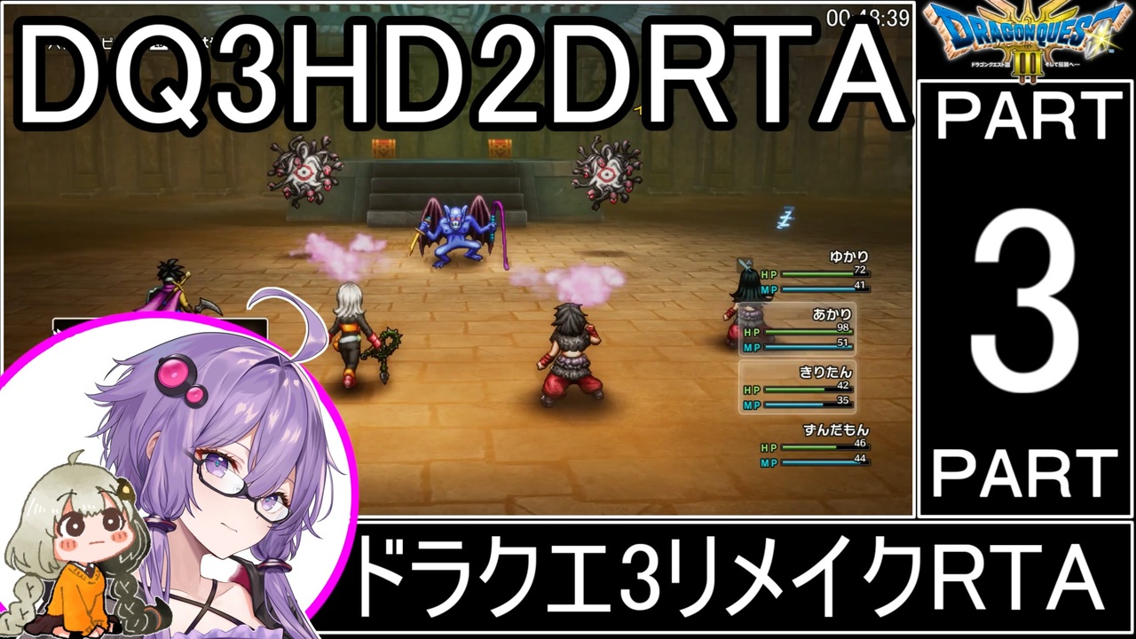 明けましておめでとうございます。<br>魔王軍4天王との闘いが始まるPart3お待たせしました。<br><br>次→<a href="https://www.nicovideo.jp/watch/sm44531148" class="watch">sm44531148</a><br><br>◆計測区間◆<br>・冒険を始めます~ ゾーマをやっつけた!の表示が出た瞬間<br>◆レギュレーション◆<br>・ゲームモードはバッチリ冒険で変更禁止 <br>・予約購入特典の利用禁止<br>・ルイーダの酒場でのおたすけ機能使用禁止<br><br>過去作PART1豆リスト <a href="https://www.nicovideo.jp/mylist/75696856" target="_blank" rel="noopener">mylist/75696856</a> <br><span style="color: #ff0000;"><strong>動画を楽しんで頂けたら『いいね』をぽちっとお願いします!</strong></span><br>お知らせ用のツイッター始めました。 <a href="https://twitter.com/S9G7d4lM1TLkoSd" target="_blank" rel="noopener nofollow">https://twitter.com/S9G7d4lM1TLkoSd</a><br><br>使用合成音声ソフト<br>A.I.VOICE:結月ゆかり、紲星あかり<br><br>この動画で利用している株式会社スクウェア・エニックスを代表とする共同著作者が権利を所有する<br>著作物及びスギヤマ工房有限会社が権利を所有する楽曲の転載・配布は禁止いたします。<br>© ARMOR PROJECT/BIRD STUDIO/SPIKE CHUNSOFT/SQUARE ENIX<br>© SUGIYAMA KOBO<br>℗ SUGIYAMA KOBO