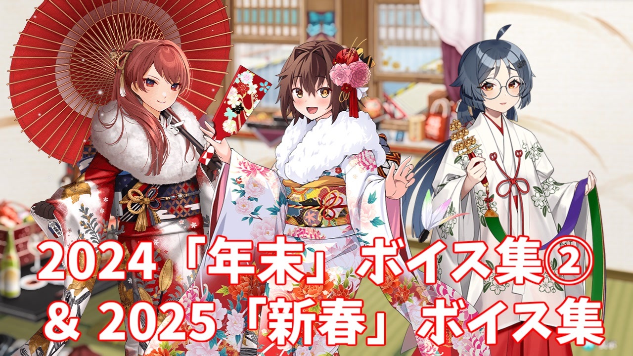 あけましておめでとうございます。<br>前回の動画で見逃していた年末ボイスと、12/29にオンメンテで追加された秋雲と風雲の年末ボイスと、<br>9隻の新規「新春」ボイス集です。<br>2024年の「新春」ボイスはこちら→ <a href="https://www.nicovideo.jp/watch/sm43222686" class="watch">sm43222686</a> <br><br><a href="#" class="seekTime" data-seekTime="00:04" onclick="seekNicoPlayer('#00:04'); return false;">#00:04</a> 年末ボイス(図鑑No.順)<br>(夕立 秋雲 風雲 Commandant_Teste)<br><br><a href="#" class="seekTime" data-seekTime="01:14" onclick="seekNicoPlayer('#01:14'); return false;">#01:14</a> 新春ボイス(図鑑No.順)<br>(Drum Valiant 平安丸 Phoenix Mogador Gloire Lexington 伊36 伊41)<br><br>【新規絵】<br>(古鷹 武蔵 Intrepid/改 Hornet Nevada/改/mod.2 平安丸/改)<br><br>前|2024「年末」ボイス集 (12/26アップデート) <a href="https://www.nicovideo.jp/watch/sm44470672" class="watch">sm44470672</a> <br><strong>次|白雪改二 追加ボイス&2025「節分」ボイス集 (1/28アップデート) </strong><a href="https://www.nicovideo.jp/watch/sm44595158" class="watch">sm44595158</a><br><br>艦これ追加ボイス集 マイリスト(<a href="https://www.nicovideo.jp/mylist/40513442" target="_blank" rel="noopener">mylist/40513442</a>)<br>シリーズ(<a href="https://www.nicovideo.jp/series/34200" target="_blank" rel="noopener">series/34200</a>)<br><br>Youtubeでも活動しています。<br>チャンネル <a href="https://www.youtube.com/channel/UCTYYB9O7hiQlH6Ee-Xxlbpg" target="_blank" rel="noopener nofollow">https://www.youtube.com/channel/UCTYYB9O7hiQlH6Ee-Xxlbpg</a>