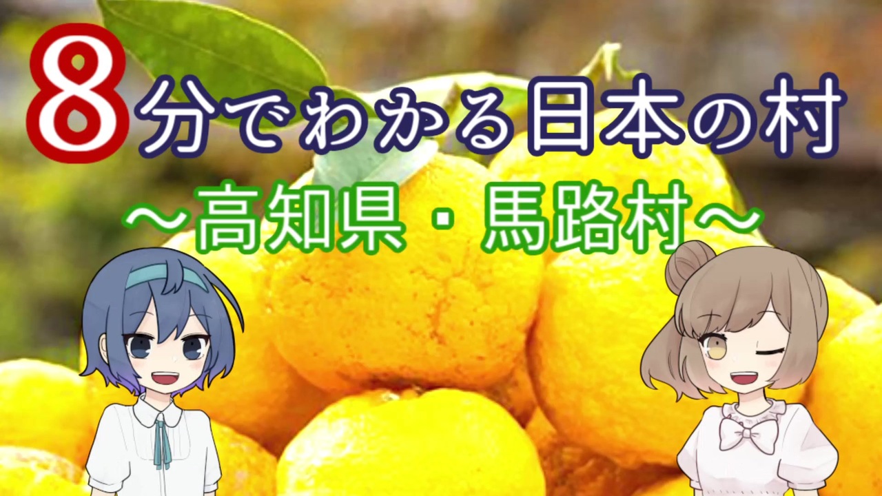 8分でわかる日本の村、略して村8分(?)。<br>CeVIOの<span style="color: #990000;"><strong>ささらちゃん</strong></span>と<span style="color: #351c75;"><strong>つづみちゃん</strong></span>でお届けする、ゆるふわ地理解説動画です。<br><br>*****<br>今回紹介するのは、高知県東部の山中にひっそりと佇む山村<span style="color: #ff9900;"><strong>「馬路村」</strong></span>。<br>人通りもまばらな四国の奥地にありながら、黄色くて甘酸っぱい果物<span style="color: #38761d;"><strong>「ゆず」</strong></span>の産地として全国区の知名度を誇っています。<br>人口1,000人にも満たない小さな村は、いかにしてこの大きな栄光を掴んだのでしょうか…?<br><br>●ほかの投稿動画はこちら <a href="https://www.nicovideo.jp/mylist/69024106" target="_blank" rel="noopener">mylist/69024106</a><br>●CeVIOでつくった曲シリーズ <a href="https://www.nicovideo.jp/series/187141" target="_blank" rel="noopener">series/187141</a><br>●8分でわかる日本の村シリーズ <a href="https://www.nicovideo.jp/series/161119" target="_blank" rel="noopener">series/161119</a><br>●シリーズに入れるほどでもないシリーズ <a href="https://www.nicovideo.jp/series/128870" target="_blank" rel="noopener">series/128870</a><br><br>●馬路村HP <a href="https://vill.umaji.lg.jp/" target="_blank" rel="noopener nofollow">https://vill.umaji.lg.jp/</a><br>●馬路村農協HP <a href="https://www.yuzu.or.jp/" target="_blank" rel="noopener nofollow">https://www.yuzu.or.jp/</a>