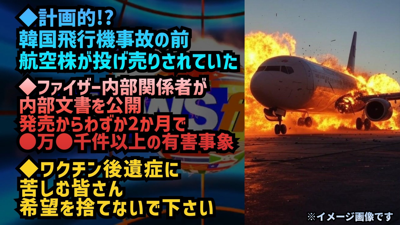 デマかと思ったら本当だった……(怖)<br><br>確かに2024年12月27日金曜 13時頃<br>(韓国標準時日本標準時と同じ)<br>に 誰 か が 済州(チェジュ)航空株を<br>投げ売りしてる<br><br>事故は12月29日日曜 9時頃<br><br>胴体着陸不可解な点が多いとは思っていたが<br>仕組まれてたという事???<br><a href="https://x.gd/KViN8" target="_blank" rel="noopener nofollow">https://x.gd/KViN8</a><br><br><br>ファイザーは自分たちが何をしているのかを完全に理解していました。2025年こそ、彼らが責任を追及される年であることを願っています。人道に対する罪です<br><br>ファイザーの内部関係者が内部文書を公開しました。その文書によれば、発売からわずか2か月で15万8千件以上の有害事象報告が寄せられていたとのことです。<br><a href="https://t.co/X7b29LsuDy" target="_blank" rel="noopener nofollow">https://t.co/X7b29LsuDy</a><br><a href="https://www.nicovideo.jp/watch/sm44496781" class="watch">sm44496781</a><br><br>これは、数年前にアーロン・シリ氏が訴訟を起こして公開させた38ページの副作用リストに記載されていた内容そのものです。本来、ファイザー社はこの文書を75年間公開しない予定だったのです。<br><a href="https://x.gd/UytLt" target="_blank" rel="noopener nofollow">https://x.gd/UytLt</a><br><br><br>2023年11月<br>これ凄いね。英国の皮膚がんメラノーマ増加。やはり日本でも皮膚からスパイク蛋白が検出されている人間がいるだけのことはある。ゲノム改変人間はいて当然なので、その発見は一部研究者に任せるとして、英国があと何年このままかが気になる。<br><a href="https://x.gd/DU2LE" target="_blank" rel="noopener nofollow">https://x.gd/DU2LE</a><br><br>2025年1月<br>日本国内でも皮膚がんがふえてきました。昨年後半に「もうみんな止めてるし追加接種しなくていいんじゃないですか?」と提案しても聞いてくれず夫婦で接種し続けた患者が、配偶者は脳梗塞、まもなく本人も非常にまれな皮膚がん発症して大手術。もうやめたと言ってました。結局、こうならないと止めない<br><a href="https://x.gd/SZxk5" target="_blank" rel="noopener nofollow">https://x.gd/SZxk5</a><br><br>モデルナ皮膚がんワクチン<br><a href="https://x.gd/8U6sN" target="_blank" rel="noopener nofollow">https://x.gd/8U6sN</a><br><br><br>ワクチン後遺症に苦しむ皆さん、希望を捨てないで下さい。色々なことが研究や臨床で解ってきていますし、高い確率で効果を上げる治療法(保険診療)を編み出したお医者様もおり、今年は様々な希望に手が届く様になると思います。まずは治らないという絶望感を「絶対に治す」いう信念に変えましょう<br><a href="https://x.gd/XjbcD" target="_blank" rel="noopener nofollow">https://x.gd/XjbcD</a><br><br><br><br />著作権、肖像権に配慮して作成しております。<br><br>◆気になったニュースの台本!?<br>メモ代わりに作った台本をそのままあげてます<br><a href="https://keiichiro8140.hatenablog.com/." target="_blank" rel="noopener nofollow">https://keiichiro8140.hatenablog.com/.</a><br><br><br>ここからはシリーズ紹介<br><br><br>◆ ワクチン解毒・デトックス<br><a href="https://x.gd/fZweg" target="_blank" rel="noopener nofollow">https://x.gd/fZweg</a><br><br>◆ウイリアム・マキス博士のがん治療(イベルメクチン・フェンベンダゾール等)<br><a href="https://x.gd/AtFYS" target="_blank" rel="noopener nofollow">https://x.gd/AtFYS</a><br><br>◆予防接種健康被害救済制度<br><a href="https://x.gd/0xK9x" target="_blank" rel="noopener nofollow">https://x.gd/0xK9x</a><br><br>◆気になったニュース #1501~<br><br>◆ 【ショートver】気になったニュース<br><a href="https://x.gd/7MxXC" target="_blank" rel="noopener nofollow">https://x.gd/7MxXC</a><br><br>◆ 気になったニュース #1001~<br><a href="https://x.gd/Lp8gv" target="_blank" rel="noopener nofollow">https://x.gd/Lp8gv</a><br><br>◆ 気になったニュース #501~<br><a href="https://x.gd/EmbS4" target="_blank" rel="noopener nofollow">https://x.gd/EmbS4</a><br><br>◆ 気になったニュース #1~#500<br><a href="https://x.gd/uPhNb" target="_blank" rel="noopener nofollow">https://x.gd/uPhNb</a><br><br>◆ X(旧Twitter)・テレグラムで気になった情報<br><a href="https://x.gd/YG6FT" target="_blank" rel="noopener nofollow">https://x.gd/YG6FT</a><br><br>◆ 日比谷5万人パレードデ⚪生放送アーカイブ動画<br><a href="https://x.gd/3CHJv" target="_blank" rel="noopener nofollow">https://x.gd/3CHJv</a><br><br>◆日比谷5万人パレード⚪モのマイリスト作ってみました<br><a href="https://nico.ms/mylist/76828848?ref=sp_other" target="_blank" rel="noopener nofollow">https://nico.ms/mylist/76828848?ref=sp_other</a><br><br>◆3.30 令和の百姓⚪⚪<br><a href="https://www.nicovideo.jp/series/511791?ref=garage_share_other" target="_blank" rel="noopener nofollow">https://www.nicovideo.jp/series/511791?ref=garage_share_other</a><br><br>◆ 及川幸久さんの【XNEWS】シリーズ<br><a href="https://x.gd/3k78K" target="_blank" rel="noopener nofollow">https://x.gd/3k78K</a><br><br>◆これまでの動画<a href="https://x.gd/sPXoJ" target="_blank" rel="noopener nofollow">https://x.gd/sPXoJ</a><br><br>◆もしも(BAN)の時のためのマイリンク集<a href="https://lit.link/K-16_News44" target="_blank" rel="noopener nofollow">https://lit.link/K-16_News44</a><br><br>