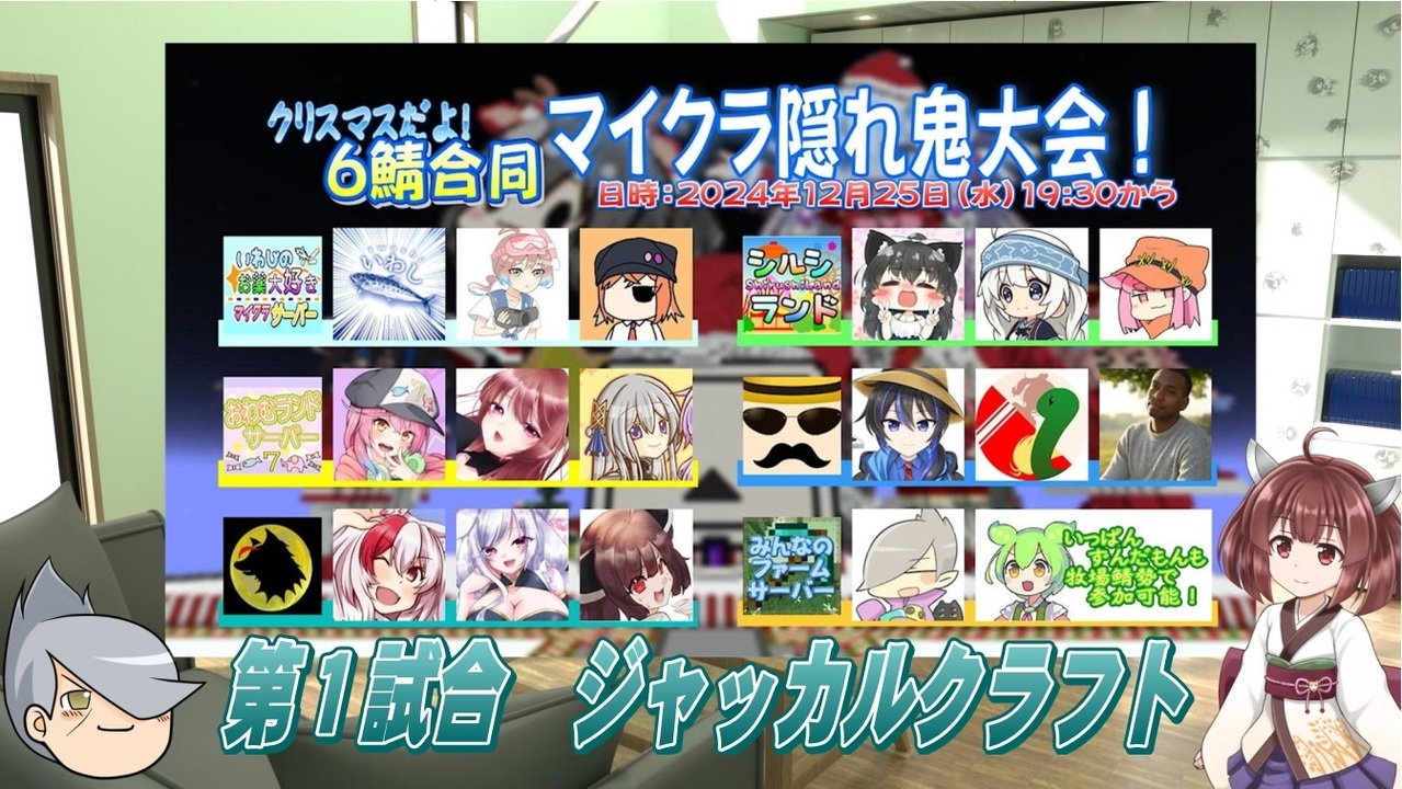 2024年クリスマスイベント6鯖合マイクラ隠れ鬼大会の<br>第1試合の様子を紹介します。<br><br>ルールブックはこちら<br><a href="https://docs.google.com/presentation/d/13VI0dnzZupwLNYKNq2X1KYzvmjxXEgQzNXwyMAxrzRU/edit?usp=sharing" target="_blank" rel="noopener nofollow">https://docs.google.com/presentation/d/13VI0dnzZupwLNYKNq2X1KYzvmjxXEgQzNXwyMAxrzRU/edit?usp=sharing</a><br><br>参加した鯖は<br>・みんなのファームサーバー<br>・いわしのお薬大好きサーバー<br>・シルシランド<br>・おわむランド<br>・凪尾ランド<br>・ジャッカルクラフト<br>の6鯖です。<br><br>この動画では以下の音声合成ソフトを利用しています。<br>VOICEROID2:東北きりたん<br>VOICEROID2:東北ずん子<br><br><a target="_blank" href="https://qa.nicovideo.jp/faq/show/19424?site_domain=default" style="font-size: 13px;color: #657586; text-decoration: underline; line-height: 1.4">この動画は投稿者によって修正されました</a>