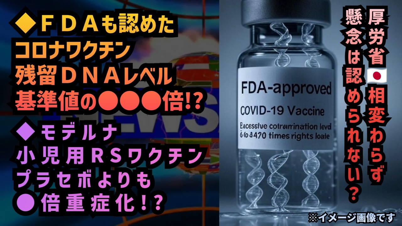 RSウイルスの感染予防のワクチンであるはずなのに、RSウイルスに感染して、しかもプラセボよりも3倍も重症化の危険性<br><br>モデルナの小児用RSウイルスワクチンの危険性<br><a href="https://x.com/doc_shimi/status/1873142257932746796?t=PLwhMA_ZPITw91RuvQyIDg&s=19" target="_blank" rel="noopener nofollow">https://x.com/doc_shimi/status/1873142257932746796?t=PLwhMA_ZPITw91RuvQyIDg&s=19</a><br><br><a href="https://x.com/KEIICHIRO8140/status/1875212638587867391?t=HS-OFgxuEJAXfUx3V-AALw&s=19" target="_blank" rel="noopener nofollow">https://x.com/KEIICHIRO8140/status/1875212638587867391?t=HS-OFgxuEJAXfUx3V-AALw&s=19</a><br><br>FDAの研究所が新型コロナワクチンに過剰なDNA汚染を発見<br><br>FDA の研究所(ホワイトオーク キャンパスの研究施設)で行われた調査で、残留 DNA レベルが安全基準の 6 ~ 470 倍を超えていることが判明し、衝撃的な事実が明らかになった。専門家は、これは「決定的な証拠」だと述べている<br><a href="https://x.gd/N8xL2" target="_blank" rel="noopener nofollow">https://x.gd/N8xL2</a><br><br>FDAの研究所がCOVID-19ワクチンに過剰なDNA汚染を発見<br>X(旧Twitter)<br><a href="https://x.gd/IdtDVY" target="_blank" rel="noopener nofollow">https://x.gd/IdtDVY</a><br>記事<br><a href="https://x.gd/ypPaQ" target="_blank" rel="noopener nofollow">https://x.gd/ypPaQ</a><br>論文<br><a href="https://x.gd/czMyv" target="_blank" rel="noopener nofollow">https://x.gd/czMyv</a><br><br>免疫学の教授であり、Vaxine Pty Ltdのディレクター(取締役)であるニコライ・ペトロフスキー氏は、この調査結果を「決定的証拠だ」と述べました。<br><a href="https://x.com/MaryanneDemasi/status/1874936255030624501?t=ernvJq_0vk0I3aI8zWR5tQ&s=19" target="_blank" rel="noopener nofollow">https://x.com/MaryanneDemasi/status/1874936255030624501?t=ernvJq_0vk0I3aI8zWR5tQ&s=19</a><br><br>Vaxine「ヴァクスィン」<br><a href="https://vaxine.net/about/people/" target="_blank" rel="noopener nofollow">https://vaxine.net/about/people/</a><br><br><br>FDA<br>DNA汚染<br>ワクチン<br>コロナワクチン<br>新型コロナワクチン<br>残留DNAレベル基準値超え<br>過剰なDNA汚染<br>製薬会社<br>プラスミドDNA<br>がんが成長しやすくなる<br>急造ワクチンは危険<br><br><br />著作権、肖像権に配慮して作成しております。<br><br>◆気になったニュースの台本!?<br>メモ代わりに作った台本をそのままあげてます<br><a href="https://keiichiro8140.hatenablog.com/." target="_blank" rel="noopener nofollow">https://keiichiro8140.hatenablog.com/.</a><br><br><br>ここからはシリーズ紹介<br><br><br>◆ ワクチン解毒・デトックス<br><a href="https://x.gd/fZweg" target="_blank" rel="noopener nofollow">https://x.gd/fZweg</a><br><br>◆ウイリアム・マキス博士のがん治療(イベルメクチン・フェンベンダゾール等)<br><a href="https://x.gd/AtFYS" target="_blank" rel="noopener nofollow">https://x.gd/AtFYS</a><br><br>◆予防接種健康被害救済制度<br><a href="https://x.gd/0xK9x" target="_blank" rel="noopener nofollow">https://x.gd/0xK9x</a><br><br>◆気になったニュース #1501~<br><br>◆ 【ショートver】気になったニュース<br><a href="https://x.gd/7MxXC" target="_blank" rel="noopener nofollow">https://x.gd/7MxXC</a><br><br>◆ 気になったニュース #1001~<br><a href="https://x.gd/Lp8gv" target="_blank" rel="noopener nofollow">https://x.gd/Lp8gv</a><br><br>◆ 気になったニュース #501~<br><a href="https://x.gd/EmbS4" target="_blank" rel="noopener nofollow">https://x.gd/EmbS4</a><br><br>◆ 気になったニュース #1~#500<br><a href="https://x.gd/uPhNb" target="_blank" rel="noopener nofollow">https://x.gd/uPhNb</a><br><br>◆ X(旧Twitter)・テレグラムで気になった情報<br><a href="https://x.gd/YG6FT" target="_blank" rel="noopener nofollow">https://x.gd/YG6FT</a><br><br>◆ 日比谷5万人パレードデ⚪生放送アーカイブ動画<br><a href="https://x.gd/3CHJv" target="_blank" rel="noopener nofollow">https://x.gd/3CHJv</a><br><br>◆日比谷5万人パレード⚪モのマイリスト作ってみました<br><a href="https://nico.ms/mylist/76828848?ref=sp_other" target="_blank" rel="noopener nofollow">https://nico.ms/mylist/76828848?ref=sp_other</a><br><br>◆3.30 令和の百姓⚪⚪<br><a href="https://www.nicovideo.jp/series/511791?ref=garage_share_other" target="_blank" rel="noopener nofollow">https://www.nicovideo.jp/series/511791?ref=garage_share_other</a><br><br>◆ 及川幸久さんの【XNEWS】シリーズ<br><a href="https://x.gd/3k78K" target="_blank" rel="noopener nofollow">https://x.gd/3k78K</a><br><br>◆これまでの動画<a href="https://x.gd/sPXoJ" target="_blank" rel="noopener nofollow">https://x.gd/sPXoJ</a><br><br>◆もしも(BAN)の時のためのマイリンク集<a href="https://lit.link/K-16_News44" target="_blank" rel="noopener nofollow">https://lit.link/K-16_News44</a><br><br>