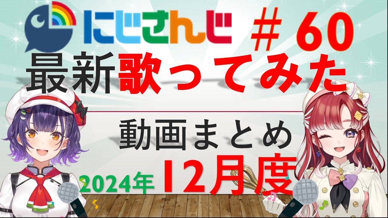 <span style="color: #00ff00;">◆</span>期間:2024年12月1日~12月31日<br><span style="color: #00ff00;">◆</span>対象:にじさんじライバーによる歌ってみた動画<br><span style="font-size: 10px;">(にじさんじのみ対象。JP・元ID・元KR・EN)</span><br><span style="color: #00ff00;">◆</span><span style="color: #262626;">参考サイト:(</span><span style="color: #262626;"><strong>↓元動画はこのページからご参照ください↓</strong></span><span style="color: #262626;">)</span><br>VMusic Ch. 様<br><a href="https://music.vtuber-ch.com/?gname=にじさんじALL" target="_blank" rel="noopener nofollow">https://music.vtuber-ch.com/?gname=にじさんじALL</a><br>にじさんじ非公式Wiki 様<br><a href="https://wikiwiki.jp/nijisanji/歌唱まとめ" target="_blank" rel="noopener nofollow">https://wikiwiki.jp/nijisanji/歌唱まとめ</a><br><br>前回(11月)の歌みたまとめ:<a href="https://www.nicovideo.jp/watch/sm44390808" class="watch">sm44390808</a><br>年間歌ってみたまとめ:もうすぐ投稿予定<br><br>プレイリストは上記非公式Wiki内のプレイリストをご活用ください。<br>気になる歌動画を見つけたらぜひ、元動画をご覧ください!!<br><br>よく確認はしましたが、抜けがありましたらコメントをお願いいたします。