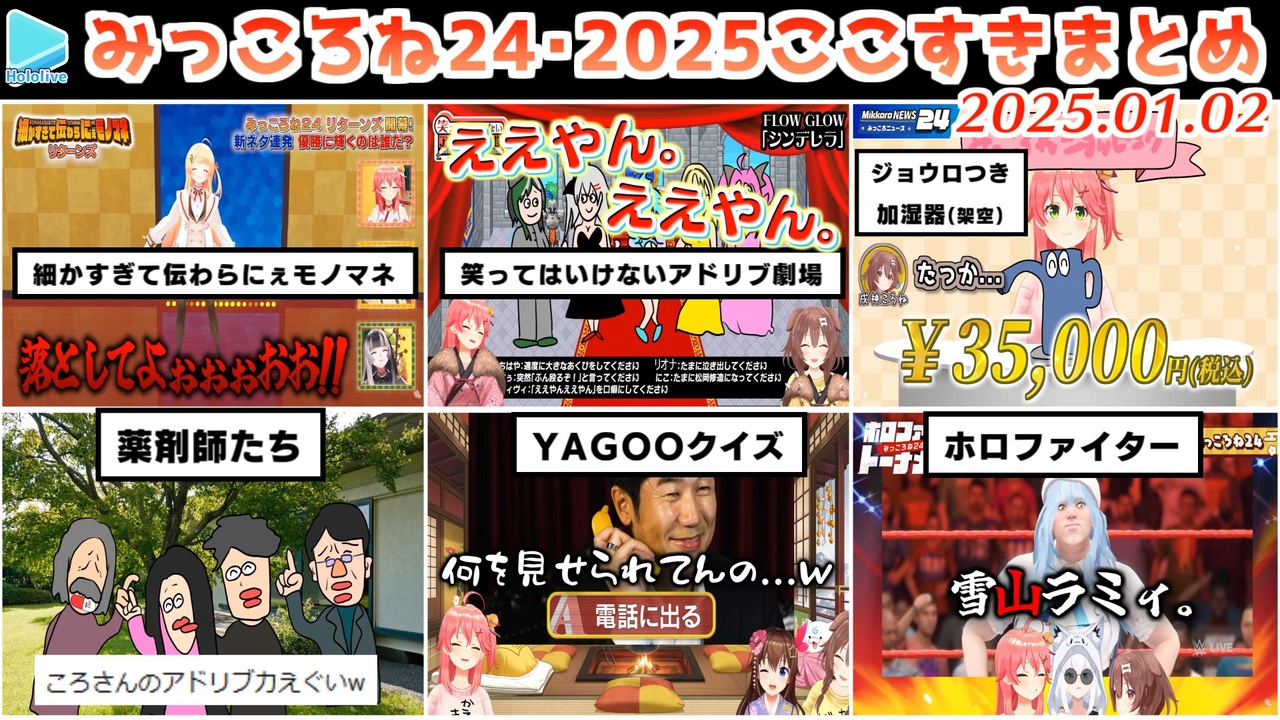 <a href="#" class="seekTime" data-seekTime="00:00" onclick="seekNicoPlayer('#00:00'); return false;">#00:00</a> 企画「細かすぎて伝わらにぇモノマネ」<br><a href="#" class="seekTime" data-seekTime="02:52" onclick="seekNicoPlayer('#02:52'); return false;">#02:52</a> 企画「笑ってはいけないアドリブ劇場」<br><a href="#" class="seekTime" data-seekTime="05:00" onclick="seekNicoPlayer('#05:00'); return false;">#05:00</a> 企画「ロケ王決定戦」<br><a href="#" class="seekTime" data-seekTime="05:40" onclick="seekNicoPlayer('#05:40'); return false;">#05:40</a> 企画「なりきりディベートバトル」<br><a href="#" class="seekTime" data-seekTime="08:13" onclick="seekNicoPlayer('#08:13'); return false;">#08:13</a> ホロファイタートーナメントAブロック<br><a href="#" class="seekTime" data-seekTime="17:43" onclick="seekNicoPlayer('#17:43'); return false;">#17:43</a> ホロファイタートーナメントBブロック<br><a href="#" class="seekTime" data-seekTime="28:51" onclick="seekNicoPlayer('#28:51'); return false;">#28:51</a> おむつ、履いてます<br><a href="#" class="seekTime" data-seekTime="29:52" onclick="seekNicoPlayer('#29:52'); return false;">#29:52</a> ゆる凸待ち:ヴィヴィ<br><a href="#" class="seekTime" data-seekTime="31:54" onclick="seekNicoPlayer('#31:54'); return false;">#31:54</a> 実はあった3人のユニット名<br><a href="#" class="seekTime" data-seekTime="35:01" onclick="seekNicoPlayer('#35:01'); return false;">#35:01</a> ノエルのマネ<br><a href="#" class="seekTime" data-seekTime="36:10" onclick="seekNicoPlayer('#36:10'); return false;">#36:10</a> だいしゃせいたいかい<br><a href="#" class="seekTime" data-seekTime="38:27" onclick="seekNicoPlayer('#38:27'); return false;">#38:27</a> 道に落ちてたハイテンションな草<br><a href="#" class="seekTime" data-seekTime="39:11" onclick="seekNicoPlayer('#39:11'); return false;">#39:11</a> 企画「朝からライト」<br><a href="#" class="seekTime" data-seekTime="40:42" onclick="seekNicoPlayer('#40:42'); return false;">#40:42</a> 企画「クイズ YAGOO'25」<br><a href="#" class="seekTime" data-seekTime="49:06" onclick="seekNicoPlayer('#49:06'); return false;">#49:06</a> 企画「ブチギレツッコミ逆算クイズ」<br><a href="#" class="seekTime" data-seekTime="53:15" onclick="seekNicoPlayer('#53:15'); return false;">#53:15</a> ころねミオしゃ<br><a href="#" class="seekTime" data-seekTime="54:10" onclick="seekNicoPlayer('#54:10'); return false;">#54:10</a> 昼ドラ:薬剤師たち<br><a href="#" class="seekTime" data-seekTime="61:14" onclick="seekNicoPlayer('#61:14'); return false;">#61:14</a> 企画「笑ってはいけないゲーム実況」<br><a href="#" class="seekTime" data-seekTime="63:58" onclick="seekNicoPlayer('#63:58'); return false;">#63:58</a> 企画「みっころニュース24」<br><a href="#" class="seekTime" data-seekTime="71:42" onclick="seekNicoPlayer('#71:42'); return false;">#71:42</a> 企画「新春頂上決戦」<br><a href="#" class="seekTime" data-seekTime="79:35" onclick="seekNicoPlayer('#79:35'); return false;">#79:35</a> ルイ姉と習字<br><a href="#" class="seekTime" data-seekTime="80:20" onclick="seekNicoPlayer('#80:20'); return false;">#80:20</a> ゆる凸待ち:ねねち<br><br>Miko Ch. さくらみこ <a href="https://t.co/FM8eBkuiOO" target="_blank" rel="noopener nofollow">https://t.co/FM8eBkuiOO</a><br>Korone Ch. 戌神ころね <a href="https://t.co/qeTXwRU2F1" target="_blank" rel="noopener nofollow">https://t.co/qeTXwRU2F1</a><br><br>例によって文字数オーバーなので元動画様URLはつべ版の概要欄からどうぞ<br><a href="https://youtu.be/XzRu11Ij_uI" target="_blank" rel="noopener nofollow">https://youtu.be/XzRu11Ij_uI</a><br /><span style="color: #b7b7b7; font-size: 10px;">ホロライブ切り抜き/なめたけ <a href="https://t.co/CBwJLnYR2c" target="_blank" rel="noopener nofollow">https://t.co/CBwJLnYR2c</a></span>