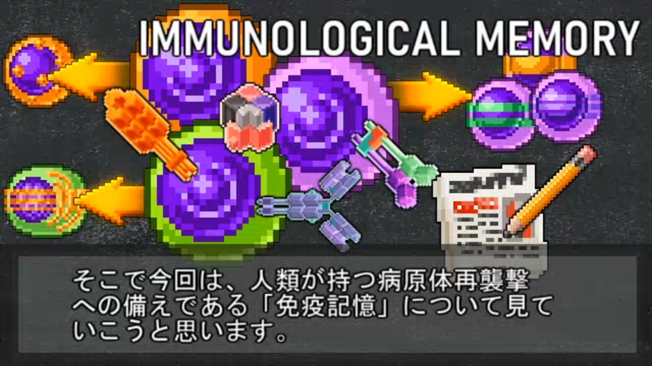 あけましておめでとうございます。そして大変長らくお待たせしました。前回動画から約1年と投稿間隔最長を記録してしまいましたが、完成しました。残念ながら今後も投稿頻度は低いままが続くと思いますが、のんびりお待ちいただければ幸いです。<br> 今回は免疫記憶についてです。免疫記憶というとワクチンを連想する方も多いかと思いますが、それについてはこの動画では紹介せず、一本ワクチン回を作って紹介しようと考えています。投稿頻度が壊滅的なので、いつ出せるか自分で心配になってしまっていますが……<br><br>【Twitter】→ <a href="https://twitter.com/immunoamateur " target="_blank" rel="noopener nofollow">https://twitter.com/immunoamateur </a><br>【第1回】→ <a href="https://www.nicovideo.jp/watch/sm33686747" class="watch">sm33686747</a> 免疫学の基本 <br>【前回】→ <a href="https://www.nicovideo.jp/watch/sm43296278" class="watch">sm43296278</a> 免疫応答の抑制<br>【次回】→ <a href="https://www.nicovideo.jp/watch/sm45654073" class="watch">sm45654073</a> T, B細胞分化(遺伝子再編成)<br>【投稿動画】 → <a href="https://www.nicovideo.jp/mylist/63388345" target="_blank" rel="noopener">mylist/63388345</a>
