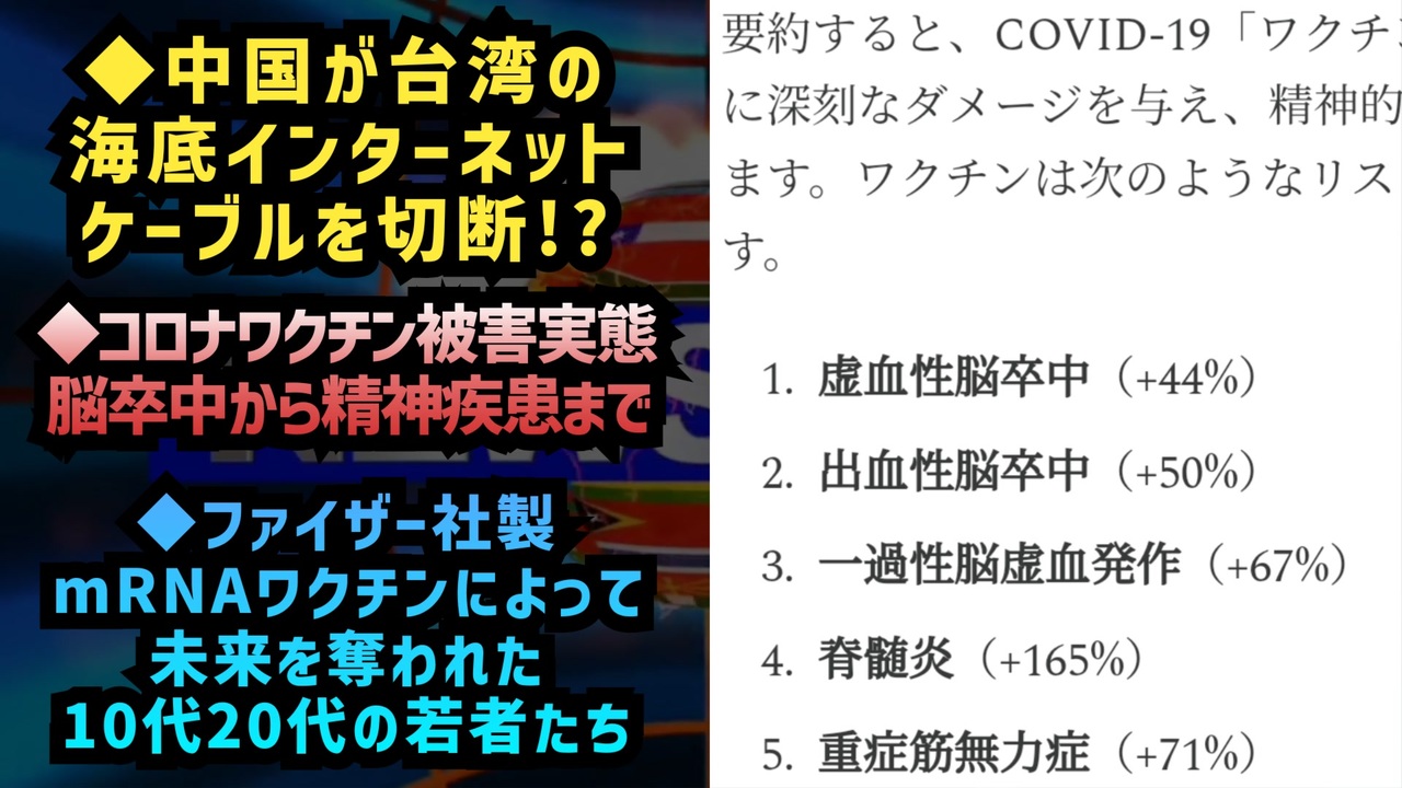 中国が台湾への海底インターネットケーブルを切断<br><br>台湾の沖合で、中国の船舶が海底のインターネットケーブルを切断したという事件が発生しました。<br><a href="https://x.gd/GYyH4" target="_blank" rel="noopener nofollow">https://x.gd/GYyH4</a><br><br><br>台湾の沖合で、中国の船が海底インターネットケーブルを切断しました。2025年1月3日、台湾北東部の基隆港近くで、<br><br>Trans-Pacific Expressケーブル(台湾とアメリカ西海岸を接続している)ケーブルの一部が被害を受けました。<br><br>カメルーン船籍の貨物船「Shunxing 39」が容疑者で、乗組員は全員中国人です。通信への影響は軽微で、台湾は衛星通信の強化を検討中です。これは台湾と中国間の緊張の一環で、国際社会も海底インフラの保護を強化しています。<br><a href="https://x.gd/JLmV2" target="_blank" rel="noopener nofollow">https://x.gd/JLmV2</a><br><br><br>ピーター・マッカロー博士<br>新型コロナウイルスワクチンによる神経学的および精神的な深刻な損傷について<br><br>これらのワクチン接種は、以下のリスクを大幅に高めます:<br><br>1. 虚血性脳卒中(+44%)<br><br>2. 出血性脳卒中(+50%)<br><br>3. 一過性脳虚血発作(TIA)(+67%)<br><br>4. 脊髄炎(+165%)<br><br>5. 重症筋無力症(+71%)<br><br>6. アルツハイマー病(+22.5%)<br><br>7. 認知機能障害(+137.7%)<br><br>8. うつ病(+68.3%)<br><br>9. 不安障害(+43.9%)<br><br>10. 睡眠障害(+93.4%)<br><br>これらの神経毒性を持つCOVID-19ワクチンは、全世界の市場から直ちに撤退させ、神経学的および精神的疾患の急増を防ぐべきです。<br><br>詳しくは@NicHulscher氏による報告をご覧ください(Courageous Discourse掲載):bit.ly/4g1Q6YV<br><br>情報元:@McCulloughFund<br><br><a href="https://x.gd/U1yk2" target="_blank" rel="noopener nofollow">https://x.gd/U1yk2</a><br><br><br>ファイザー社のmRNAワクチンによって<br>未来を奪われた10代20代の若者たち<br><br>この画像には、コミナティ筋注(ファイザー製)の接種に関連するとされる年齢や性別ごとのデータが表示されています。各行には、ケース番号、性別(男性・女性)、年齢、死亡と記載されている情報、そして接種記録が含まれています。具体的な記録内容の詳細や背景情報は不明ですが、死亡に関連する報告が示されています。<br><a href="https://x.gd/Zwi7B" target="_blank" rel="noopener nofollow">https://x.gd/Zwi7B</a><br><br><br />著作権、肖像権に配慮して作成しております。<br><br>◆気になったニュースの台本!?<br>メモ代わりに作った台本をそのままあげてます<br><a href="https://keiichiro8140.hatenablog.com/." target="_blank" rel="noopener nofollow">https://keiichiro8140.hatenablog.com/.</a><br><br><br>ここからはシリーズ紹介<br><br><br>◆ ワクチン解毒・デトックス<br><a href="https://x.gd/fZweg" target="_blank" rel="noopener nofollow">https://x.gd/fZweg</a><br><br>◆ウイリアム・マキス博士のがん治療(イベルメクチン・フェンベンダゾール等)<br><a href="https://x.gd/AtFYS" target="_blank" rel="noopener nofollow">https://x.gd/AtFYS</a><br><br>◆予防接種健康被害救済制度<br><a href="https://x.gd/0xK9x" target="_blank" rel="noopener nofollow">https://x.gd/0xK9x</a><br><br>◆気になったニュース #1501~<br><br>◆ 【ショートver】気になったニュース<br><a href="https://x.gd/7MxXC" target="_blank" rel="noopener nofollow">https://x.gd/7MxXC</a><br><br>◆ 気になったニュース #1001~<br><a href="https://x.gd/Lp8gv" target="_blank" rel="noopener nofollow">https://x.gd/Lp8gv</a><br><br>◆ 気になったニュース #501~<br><a href="https://x.gd/EmbS4" target="_blank" rel="noopener nofollow">https://x.gd/EmbS4</a><br><br>◆ 気になったニュース #1~#500<br><a href="https://x.gd/uPhNb" target="_blank" rel="noopener nofollow">https://x.gd/uPhNb</a><br><br>◆ X(旧Twitter)・テレグラムで気になった情報<br><a href="https://x.gd/YG6FT" target="_blank" rel="noopener nofollow">https://x.gd/YG6FT</a><br><br>◆ 日比谷5万人パレードデ⚪生放送アーカイブ動画<br><a href="https://x.gd/3CHJv" target="_blank" rel="noopener nofollow">https://x.gd/3CHJv</a><br><br>◆日比谷5万人パレード⚪モのマイリスト作ってみました<br><a href="https://nico.ms/mylist/76828848?ref=sp_other" target="_blank" rel="noopener nofollow">https://nico.ms/mylist/76828848?ref=sp_other</a><br><br>◆3.30 令和の百姓⚪⚪<br><a href="https://www.nicovideo.jp/series/511791?ref=garage_share_other" target="_blank" rel="noopener nofollow">https://www.nicovideo.jp/series/511791?ref=garage_share_other</a><br><br>◆ 及川幸久さんの【XNEWS】シリーズ<br><a href="https://x.gd/3k78K" target="_blank" rel="noopener nofollow">https://x.gd/3k78K</a><br><br>◆これまでの動画<a href="https://x.gd/sPXoJ" target="_blank" rel="noopener nofollow">https://x.gd/sPXoJ</a><br><br>◆もしも(BAN)の時のためのマイリンク集<a href="https://lit.link/K-16_News44" target="_blank" rel="noopener nofollow">https://lit.link/K-16_News44</a><br><br>
