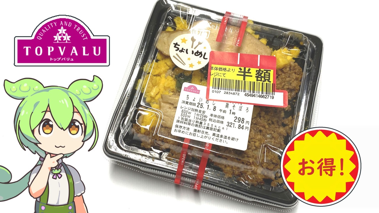 ビッグでは最近「ちょいめし」という <br>少し小さいお弁当の取り扱いがありちょっと気になっていたのですが <br>半額になったものがあったので買ってみることにしました。 <br><br><br>【関連動画】<br> トップバリュの黄色いヤツ「ゆでたパスタに混ぜるだけ ナポリタン 5食(197円)」2025.01.06<br><a href="https://www.nicovideo.jp/watch/sm44509297" target="_blank" rel="noopener nofollow">https://www.nicovideo.jp/watch/sm44509297</a><br><br>【参考】 <br>日本デリカフレッシュ<br> <a href="https://www.n-delica-f.co.jp/index.html" target="_blank" rel="noopener nofollow">https://www.n-delica-f.co.jp/index.html</a><br><br>【使用した素材】(※敬称略) <br>(合成音声)VOICEVOX/ずんだもん/四国めたん <br><a href="https://voicevox.hiroshiba.jp/" target="_blank" rel="noopener nofollow">https://voicevox.hiroshiba.jp/</a> <br>(立ち絵)坂本アヒル<br> <a href="https://seiga.nicovideo.jp/seiga/im10788496?track" target="_blank" rel="noopener nofollow">https://seiga.nicovideo.jp/seiga/im10788496?track</a> <br>(楽曲)甘茶の音楽工房/「楽しい麦畑」「フルーツパフェ」 <br><a href="https://amachamusic.chagasi.co" target="_blank" rel="noopener nofollow">https://amachamusic.chagasi.co</a><br>