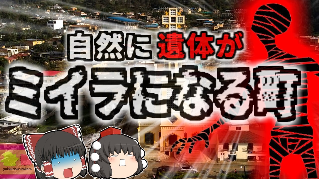 <a href="#" class="seekTime" data-seekTime="00:08" onclick="seekNicoPlayer('#00:08'); return false;">#00:08</a> 「ミイラ」<br><a href="#" class="seekTime" data-seekTime="1:14" onclick="seekNicoPlayer('#1:14'); return false;">#1:14</a> 自然ミイラ化現象が起きる謎の町<br><a href="#" class="seekTime" data-seekTime="1:34" onclick="seekNicoPlayer('#1:34'); return false;">#1:34</a> 『サンベルナルド』<br><a href="#" class="seekTime" data-seekTime="2:21" onclick="seekNicoPlayer('#2:21'); return false;">#2:21</a> ミイラ博物館<br><a href="#" class="seekTime" data-seekTime="3:27" onclick="seekNicoPlayer('#3:27'); return false;">#3:27</a> 1960年代の出来事<br><a href="#" class="seekTime" data-seekTime="4:49" onclick="seekNicoPlayer('#4:49'); return false;">#4:49</a> ミイラの共通点は?<br><a href="#" class="seekTime" data-seekTime="5:29" onclick="seekNicoPlayer('#5:29'); return false;">#5:29</a> 高地の気候が影響?<br><a href="#" class="seekTime" data-seekTime="6:17" onclick="seekNicoPlayer('#6:17'); return false;">#6:17</a> 衣服や眼球までもが残っていた<br><a href="#" class="seekTime" data-seekTime="6:50" onclick="seekNicoPlayer('#6:50'); return false;">#6:50</a> 墓地の場所が偶然オーブン状態に?<br><a href="#" class="seekTime" data-seekTime="8:16" onclick="seekNicoPlayer('#8:16'); return false;">#8:16</a> 明確な原因は不明<br><br><br>引用・出展・参考文献(視聴者提供資料など<br>Wikipedia San Bernardo, Cundinamarca<br><a href="https://ishort.ink/zyH3" target="_blank" rel="noopener nofollow">https://ishort.ink/zyH3</a><br>New York Post <br><a href="https://ishort.ink/RFJU" target="_blank" rel="noopener nofollow">https://ishort.ink/RFJU</a><br><br />※この動画は過去の事件を知り、現在でも同じことが発生する危険性を再認識、関与しないように促すための動画であり、視聴者を扇動、動揺を誘うためのコンテンツではありません。<br><br>ご要望にお応えして、メンバーシップの開設を行いました。<br>下記URLからも登録可能ですので、ご興味がある方は是非ご参加ください。<br><a href="https://www.youtube.com/channel/UCcT5a1J7XJW7CLYI2RKl4pw/join" target="_blank" rel="noopener nofollow">https://www.youtube.com/channel/UCcT5a1J7XJW7CLYI2RKl4pw/join</a><br><br><br>Twitter<br>→<a href="https://twitter.com/yukkurisurutoko" target="_blank" rel="noopener nofollow">https://twitter.com/yukkurisurutoko</a><br><br>取り急ぎ、簡易的にですがマイリストを作りました。<br>【ゆっくり解説】事故・事件関係紹介リスト <br><a href="https://www.nicovideo.jp/mylist/71034319" target="_blank" rel="noopener nofollow">https://www.nicovideo.jp/mylist/71034319</a><br>【ゆっくり解説】放射線系事故<br><a href="https://www.nicovideo.jp/mylist/71034368" target="_blank" rel="noopener nofollow">https://www.nicovideo.jp/mylist/71034368</a><br>【ゆっくり解説】鉄道系事故・事件関連<br><a href="https://www.nicovideo.jp/mylist/71034379" target="_blank" rel="noopener nofollow">https://www.nicovideo.jp/mylist/71034379</a>