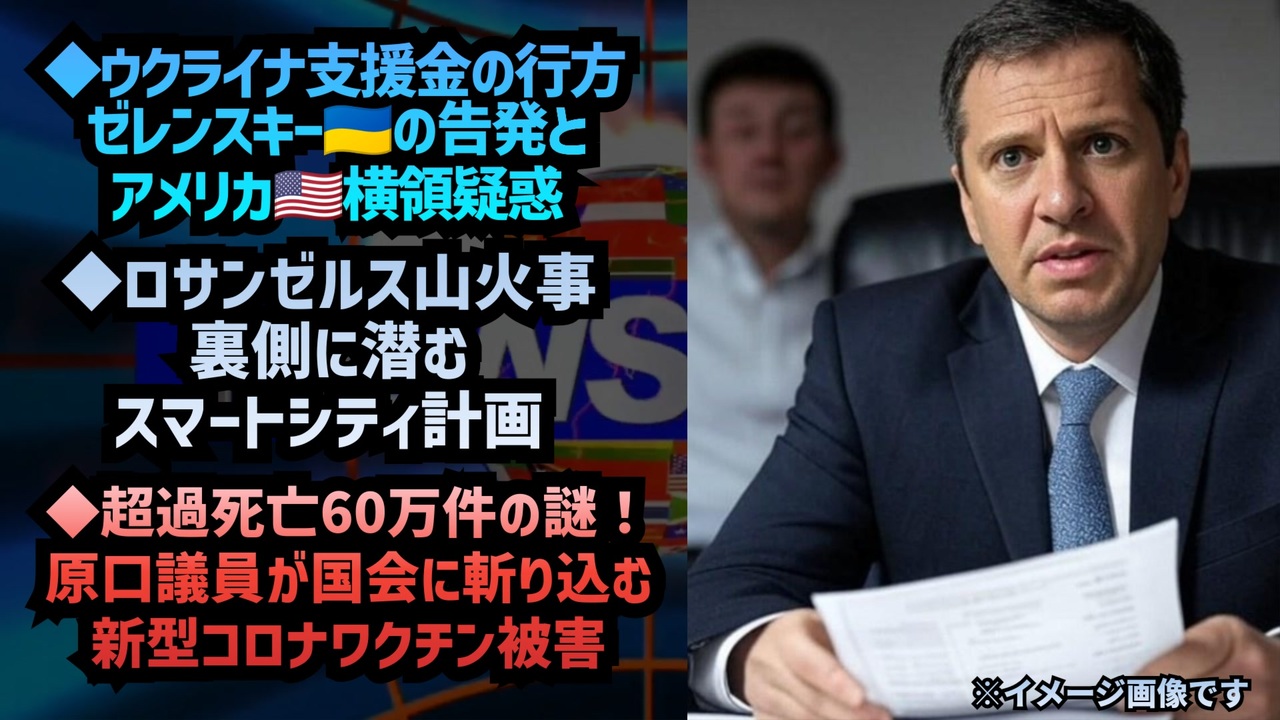 ゼレンスキーが衝撃の告発<br>1770億ドルの支援金のうち、アメリカらが半分を横領している<br>1770億ドルの支援金のうち半分しかウクライナに届いておらず、残り半分はウクライナに届かずに消えている<br>メディアが正常なら世界中でトップニュースになるが…<br><a href="https://x.gd/OlWWK" target="_blank" rel="noopener nofollow">https://x.gd/OlWWK</a><br><br><br>今回のロサンゼルス火災は、これか!<br>スマートシティー化するためだったのか!<br><a href="https://x.gd/qxu7Y" target="_blank" rel="noopener nofollow">https://x.gd/qxu7Y</a><br>記事<br><a href="https://x.gd/0Z3cu" target="_blank" rel="noopener nofollow">https://x.gd/0Z3cu</a><br><br><br>実はトランプ大統領は第一期でセントラル・ヴァレーやロサンゼルスに水を送る灌漑プロジェクトへの覚書や農家の水へのアクセスを増やす命令に署名していたんだけど、ワカサギとサケが絶滅するとか言って民主党が反対して、ニューサムは裁判まで起こしていた。<br>民主党の反対が無ければ今回の山火事も…<br><a href="https://x.gd/8LPZu" target="_blank" rel="noopener nofollow">https://x.gd/8LPZu</a><br><br><br>ロサンゼルス市消防署長が先月、同市の予算から1,700万ドル以上削減されたことで、山火事などの対応不備になることを市長(民主党)に警告していた模様<br><a href="https://x.gd/LWy3I" target="_blank" rel="noopener nofollow">https://x.gd/LWy3I</a><br><br><br>ロサンゼルス消防局のクリスティン・クロウリー消防署長は、先月、カレン・バス市長(民主党)に対し、彼女が消防局の予算から削減した700万ドル以上が、「大規模な緊急事態、特に山火事への準備や訓練、対応能力を深刻に制限している」と警告しました<br><a href="https://x.gd/9OgGA" target="_blank" rel="noopener nofollow">https://x.gd/9OgGA</a><br><br><br>ロサンゼルス山火事は、水不足で消防士たちは消火や鎮圧をあきらめ、避難の支援に集中しているという<br><a href="https://x.gd/ApOP1" target="_blank" rel="noopener nofollow">https://x.gd/ApOP1</a><br><br><br>【コロナワクチンの副反応、死亡報告はいつ、誰の手によって集計されたのか?】<br>原口議員が国会に斬り込みます。<br>死亡報告が1,607件、その中で認定された事例が939件。「超過死亡が60万件もあるのに報告がこれだけ?嘘があるんじゃないか?」と思う方、リツイートを。今年明らかになる疑惑の1つです。<br><a href="https://x.gd/UXJM6" target="_blank" rel="noopener nofollow">https://x.gd/UXJM6</a><br><br><br>ウクライナ支援<br>ゼレンスキー大統領<br>アメリカ横領疑惑<br>ロサンゼルス山火事<br>スマートシティ計画<br>民主党の政策<br>消防予算削減<br>水不足<br>トランプ大統領<br>原口一博<br>コロナワクチン<br><br><br><br />著作権、肖像権に配慮して作成しております。<br><br>◆気になったニュースの台本!?<br>メモ代わりに作った台本をそのままあげてます<br><a href="https://keiichiro8140.hatenablog.com/." target="_blank" rel="noopener nofollow">https://keiichiro8140.hatenablog.com/.</a><br><br><br>ここからはシリーズ紹介<br><br><br>◆ ワクチン解毒・デトックス<br><a href="https://x.gd/fZweg" target="_blank" rel="noopener nofollow">https://x.gd/fZweg</a><br><br>◆ウイリアム・マキス博士のがん治療(イベルメクチン・フェンベンダゾール等)<br><a href="https://x.gd/AtFYS" target="_blank" rel="noopener nofollow">https://x.gd/AtFYS</a><br><br>◆予防接種健康被害救済制度<br><a href="https://x.gd/0xK9x" target="_blank" rel="noopener nofollow">https://x.gd/0xK9x</a><br><br>◆気になったニュース #1501~<br><br>◆ 【ショートver】気になったニュース<br><a href="https://x.gd/7MxXC" target="_blank" rel="noopener nofollow">https://x.gd/7MxXC</a><br><br>◆ 気になったニュース #1001~<br><a href="https://x.gd/Lp8gv" target="_blank" rel="noopener nofollow">https://x.gd/Lp8gv</a><br><br>◆ 気になったニュース #501~<br><a href="https://x.gd/EmbS4" target="_blank" rel="noopener nofollow">https://x.gd/EmbS4</a><br><br>◆ 気になったニュース #1~#500<br><a href="https://x.gd/uPhNb" target="_blank" rel="noopener nofollow">https://x.gd/uPhNb</a><br><br>◆ X(旧Twitter)・テレグラムで気になった情報<br><a href="https://x.gd/YG6FT" target="_blank" rel="noopener nofollow">https://x.gd/YG6FT</a><br><br>◆ 日比谷5万人パレードデ⚪生放送アーカイブ動画<br><a href="https://x.gd/3CHJv" target="_blank" rel="noopener nofollow">https://x.gd/3CHJv</a><br><br>◆日比谷5万人パレード⚪モのマイリスト作ってみました<br><a href="https://nico.ms/mylist/76828848?ref=sp_other" target="_blank" rel="noopener nofollow">https://nico.ms/mylist/76828848?ref=sp_other</a><br><br>◆3.30 令和の百姓⚪⚪<br><a href="https://www.nicovideo.jp/series/511791?ref=garage_share_other" target="_blank" rel="noopener nofollow">https://www.nicovideo.jp/series/511791?ref=garage_share_other</a><br><br>◆ 及川幸久さんの【XNEWS】シリーズ<br><a href="https://x.gd/3k78K" target="_blank" rel="noopener nofollow">https://x.gd/3k78K</a><br><br>◆これまでの動画<a href="https://x.gd/sPXoJ" target="_blank" rel="noopener nofollow">https://x.gd/sPXoJ</a><br><br>◆もしも(BAN)の時のためのマイリンク集<a href="https://lit.link/K-16_News44" target="_blank" rel="noopener nofollow">https://lit.link/K-16_News44</a><br><br>