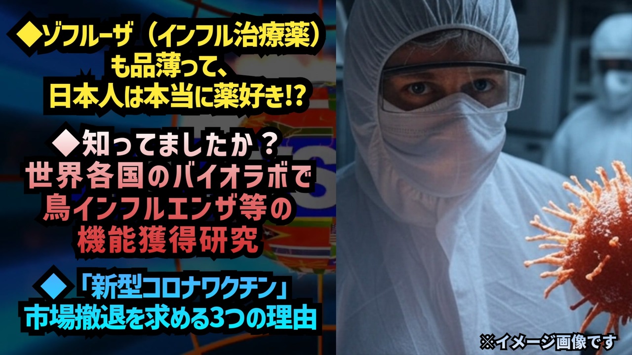 ゾフルーザ(インフルエンザ治療薬)も品薄って、日本人は本当に薬好きですね。あんな危険な薬をよく飲むな。ゾフルーザの発売された年にゾフルーザだけで重篤副作用報告症例が348人、死亡症例が37人出た薬だよ?<br><a href="https://x.com/doc_shimi/status/1878342677101690992?t=Uuto5c5dnv022rHh45XUSQ&s=19" target="_blank" rel="noopener nofollow">https://x.com/doc_shimi/status/1878342677101690992?t=Uuto5c5dnv022rHh45XUSQ&s=19</a><br><br><br>世界各国のバイオラボで鳥インフルエンザ等のの機能獲得研究<br>BSL-3・BSL-4バイオラボの危険性<br>人工的なパンデミックを引き起こす改変病原体<br>エラスムス医療センターの空気感染ウイルス研究<br>スクリップス研究所とゲイツ財団の関係<br>アメリカ南東家禽研究所の疑惑<br><a href="https://t.co/ppU6TKczn8" target="_blank" rel="noopener nofollow">https://t.co/ppU6TKczn8</a><br><br><br>生物兵器疑惑とファウチ博士への批判<br>改変ウイルスの意図的操作の背後にある目的とは?<br>生物学的戦争犯罪としての責任追及の声<br>世界的な調査と法的対応の重要性<br><a href="https://x.com/liz_churchill10/status/1878210115871883333?t=4iSOGVDz9eM3h49UMX9kKw&s=19" target="_blank" rel="noopener nofollow">https://x.com/liz_churchill10/status/1878210115871883333?t=4iSOGVDz9eM3h49UMX9kKw&s=19</a><br><br><br>「新型コロナワクチン」市場撤退を求める3つの理由<br>DNA汚染:独立研究が示す危険な事実<br>負の有効性:接種で感染リスクが増加?<br>超過死亡:ワクチンが世界的死亡率を押し上げる<br><a href="https://x.com/nichulscher/status/1877448454789804485?s=12&t=JNap8KXr0s6Q-ujfeBOWHw" target="_blank" rel="noopener nofollow">https://x.com/nichulscher/status/1877448454789804485?s=12&t=JNap8KXr0s6Q-ujfeBOWHw</a><br><br><br>ゾフルーザ<br>インフルエンザ<br>インフルエンザ治療薬<br>新型コロナワクチン<br>ワクチン<br>DNA汚染<br>超過死亡<br>バイオラボ漏洩問題<br>パンデミックの危険性<br>鳥インフルエンザ機能獲得研究<br>アンソニー・ファウチ<br><br><br />著作権、肖像権に配慮して作成しております。<br><br>◆気になったニュースの台本!?<br>メモ代わりに作った台本をそのままあげてます<br><a href="https://keiichiro8140.hatenablog.com/." target="_blank" rel="noopener nofollow">https://keiichiro8140.hatenablog.com/.</a><br><br><br>ここからはシリーズ紹介<br><br><br>◆ ワクチン解毒・デトックス<br><a href="https://x.gd/fZweg" target="_blank" rel="noopener nofollow">https://x.gd/fZweg</a><br><br>◆ウイリアム・マキス博士のがん治療(イベルメクチン・フェンベンダゾール等)<br><a href="https://x.gd/AtFYS" target="_blank" rel="noopener nofollow">https://x.gd/AtFYS</a><br><br>◆予防接種健康被害救済制度<br><a href="https://x.gd/0xK9x" target="_blank" rel="noopener nofollow">https://x.gd/0xK9x</a><br><br>◆気になったニュース #1501~<br><br>◆ 【ショートver】気になったニュース<br><a href="https://x.gd/7MxXC" target="_blank" rel="noopener nofollow">https://x.gd/7MxXC</a><br><br>◆ 気になったニュース #1001~<br><a href="https://x.gd/Lp8gv" target="_blank" rel="noopener nofollow">https://x.gd/Lp8gv</a><br><br>◆ 気になったニュース #501~<br><a href="https://x.gd/EmbS4" target="_blank" rel="noopener nofollow">https://x.gd/EmbS4</a><br><br>◆ 気になったニュース #1~#500<br><a href="https://x.gd/uPhNb" target="_blank" rel="noopener nofollow">https://x.gd/uPhNb</a><br><br>◆ X(旧Twitter)・テレグラムで気になった情報<br><a href="https://x.gd/YG6FT" target="_blank" rel="noopener nofollow">https://x.gd/YG6FT</a><br><br>◆ 日比谷5万人パレードデ⚪生放送アーカイブ動画<br><a href="https://x.gd/3CHJv" target="_blank" rel="noopener nofollow">https://x.gd/3CHJv</a><br><br>◆日比谷5万人パレード⚪モのマイリスト作ってみました<br><a href="https://nico.ms/mylist/76828848?ref=sp_other" target="_blank" rel="noopener nofollow">https://nico.ms/mylist/76828848?ref=sp_other</a><br><br>◆3.30 令和の百姓⚪⚪<br><a href="https://www.nicovideo.jp/series/511791?ref=garage_share_other" target="_blank" rel="noopener nofollow">https://www.nicovideo.jp/series/511791?ref=garage_share_other</a><br><br>◆ 及川幸久さんの【XNEWS】シリーズ<br><a href="https://x.gd/3k78K" target="_blank" rel="noopener nofollow">https://x.gd/3k78K</a><br><br>◆これまでの動画<a href="https://x.gd/sPXoJ" target="_blank" rel="noopener nofollow">https://x.gd/sPXoJ</a><br><br>◆もしも(BAN)の時のためのマイリンク集<a href="https://lit.link/K-16_News44" target="_blank" rel="noopener nofollow">https://lit.link/K-16_News44</a><br><br>