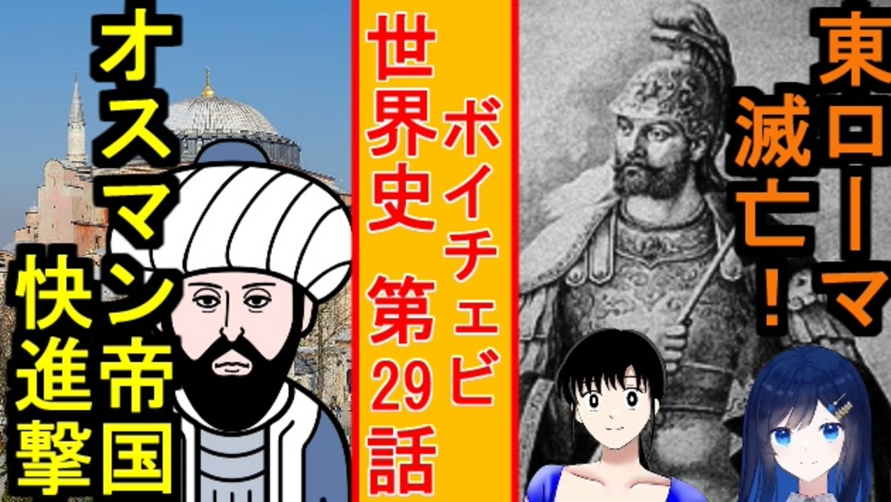 日テレ系「まんが日本史」をオマージュし、<br>学習漫画「世界の歴史」を教科書とした<br>ボイチェビ世界史 第29回は、<br>東ローマ帝国の滅亡と、<br>オスマン帝国の領土拡大について解説します。<br><br>「歴史学者・ことりさん」が、<br>no.7(voicevox)の声でご案内いたします。<br>そしてアシスタントに双葉湊音ちゃんを起用。<br><br>EDテーマ「風のメルヘン」は、<br>宮舞モカ(synthV)に歌ってもらいます。<br>注意点<br>・セリフおよび画像は、その一部は教科書など参考文献から<br>引用させていただくことがあります。<br>・演出のために、舞台の時代にそぐわない画像や<br>音楽を使う場合がございます。<br>・セリフ発声はすべて合成音声<br>・BGMは、他者作成のBGMや音楽を借ります。<br>・若干の表記ゆれはご容赦ください。<br>・親作品は動画最後のスタッフロール画面に掲載します。<br><br>みどころ<br>1:37 東ローマ帝国、一度目の滅亡<br><a href="https://www.nicovideo.jp/watch/sm44532643?from=97" target="_blank" rel="noopener nofollow">https://www.nicovideo.jp/watch/sm44532643?from=97</a><br><br>6:13 メフメト2世 挙兵<br><a href="https://www.nicovideo.jp/watch/sm44532643?from=373" target="_blank" rel="noopener nofollow">https://www.nicovideo.jp/watch/sm44532643?from=373</a><br><br>9:21 東ローマ帝国、二度目の滅亡<br><a href="https://www.nicovideo.jp/watch/sm44532643?from=561" target="_blank" rel="noopener nofollow">https://www.nicovideo.jp/watch/sm44532643?from=561</a><br><br>13:41 オスマン帝国、ウィーン包囲<br><a href="https://www.nicovideo.jp/watch/sm44532643?from=821" target="_blank" rel="noopener nofollow">https://www.nicovideo.jp/watch/sm44532643?from=821</a><br><br>15:16 いきなり!本編終了<br><a href="https://www.nicovideo.jp/watch/sm44532643?from=916" target="_blank" rel="noopener nofollow">https://www.nicovideo.jp/watch/sm44532643?from=916</a><br><br>19:43 ????<br><a href="https://www.nicovideo.jp/watch/sm44532643?from=1183" target="_blank" rel="noopener nofollow">https://www.nicovideo.jp/watch/sm44532643?from=1183</a><br><br>※この動画にない親作品<br>FF4 メインテーマ 作曲:植松伸夫(FFMIDI様)<br><br>※ハーフタイムで、次の動画を宣伝しております。<br>「ビザンツ皇帝 言えるかな?」(古代ローマが面白いP様)<br><a href="https://www.youtube.com/watch?v=d_BlyvjPJiE&t=1s" target="_blank" rel="noopener nofollow">https://www.youtube.com/watch?v=d_BlyvjPJiE&t=1s</a>