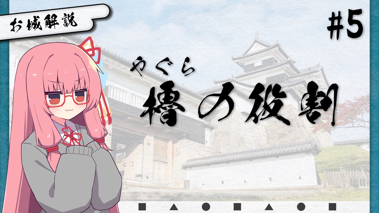 お城好きの茜ちゃんがお城の解説のような何かをしてくれる動画 ぱーとふぁいぶ。<br>今回は近世城郭に建つ櫓のアレコレについての話~<br><br>本シリーズは<br><strong>お城の事よく知らない方~初心者あたり</strong>に向けた内容のつもりです。<br>情報量で溺れさせないよう、全ては語りません。(お城有識者の補足コメントなど大歓迎です!)<br>また、<strong>主に近世城郭にスポットを当てて</strong>語ります。<br><br><strong>《視聴の際の注意》</strong><br><span style="color: #ff0000;">※中の人は専門家でも何でもない</span><span style="color: #ff0000;"><strong>ただのお城好き</strong></span><span style="color: #ff0000;">(城郭検定2級所持)です。参考程度でお願いします。</span><br> 間違えてたら優しく教えてください。<br>※諸説ある歴史は諸説楽しみましょう。<br><br><strong>《声・お借りした素材》</strong><br>声:A.I.VOICE2 琴葉茜 / 葵<br>立ち絵:ことのは(もえ) ゆめうつうつ 様 <a href="https://seiga.nicovideo.jp/seiga/im11419114" target="_blank" rel="noopener">im11419114</a><br>BGM:真夜中の一人お茶会 ユーキヒロセ 様 <a href="https://www.youtube.com/watch?v=Mo50ueX58HM&t=298s" target="_blank" rel="noopener nofollow">https://www.youtube.com/watch?v=Mo50ueX58HM&t=298s</a><br>効果音:効果音ラボ 様<br>フォント:玉ねぎ楷書製品版 <a href="https://gyokutendo.booth.pm/items/2111678" target="_blank" rel="noopener nofollow">https://gyokutendo.booth.pm/items/2111678</a><br>弘前城写真:ジュンP 様(photo AC)<br><br><strong>《参考文献・サイト》</strong><br>・よくわかる日本の城 日本城郭検定公式参考書(著 加藤理文 様) (ONE PUBLISHING)<br>・理文先生のお城がっこう 城歩き編 第59回 櫓① その起源と種類 城びと 様<br> (<a href="https://shirobito.jp/article/1768)" target="_blank" rel="noopener nofollow">https://shirobito.jp/article/1768)</a><br>・理文先生のお城がっこう 城歩き編 第62回 櫓④ 天守代用の櫓1 城びと 様<br> (<a href="https://shirobito.jp/article/1824)" target="_blank" rel="noopener nofollow">https://shirobito.jp/article/1824)</a><br>・特別史跡 三内丸山遺跡 リーフレット<br> (<a href="https://sannaimaruyama.pref.aomori.jp/materials/publications/leaflet/)" target="_blank" rel="noopener nofollow">https://sannaimaruyama.pref.aomori.jp/materials/publications/leaflet/)</a><br><br /><br><span style="color: #cc4125; font-size: 24px;"><strong>城郭登城祭第三陣やるよ~! みんなお城行こうね!</strong></span><br>詳しくは下記の告知動画を観てね!<br>◆開催期間:<br>2026年4月4日(土) 0:00 ~ 4月12日(日) 23:59<br><br>◆告知動画:<br><a href="https://www.nicovideo.jp/watch/sm45392440" class="watch">sm45392440</a><br><br>《城郭登城祭第二陣(2025)の参加動画》<br><a href="https://www.nicovideo.jp/mylist/77145802" target="_blank" rel="noopener">mylist/77145802</a><br><br>《琴葉姉妹のお城さんぽ》<br><a href="https://www.nicovideo.jp/series/332352" target="_blank" rel="noopener">series/332352</a><br><br>《お城の初心者解説動画のような何か》<br><a href="https://www.nicovideo.jp/series/485578" target="_blank" rel="noopener">series/485578</a><br><br>いつもコメントやいいね、広告等で応援いただきありがとうございます!物凄く励みになってます!<br>良ければ気軽にフォローとか反応頂けたら嬉しみです~( ˘ω˘)<br><br>中の人のあれこれ(lit link)→ <a href="https://lit.link/yunominochashibu" target="_blank" rel="noopener nofollow">https://lit.link/yunominochashibu</a><br><br><a target="_blank" href="https://qa.nicovideo.jp/faq/show/19424?site_domain=default" style="font-size: 13px;color: #657586; text-decoration: underline; line-height: 1.4">この動画は投稿者によって修正されました</a>