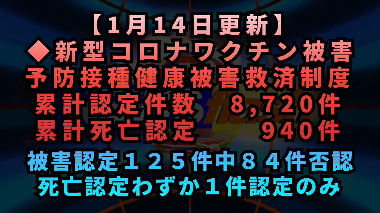 死亡認定の申請自体が無いっぽいのですが、違和感<br><br><br>【1月14日更新】◆新型コロナワクチン被害救済制度 累計認定件数 8,720件 累計死亡認定 940件<br><br>「今回は、新型コロナワクチン接種に関連する健康被害の認定状況についてお伝えします。<br><br>審査された125件のうち、認定されたのはわずか37件、一方で84件が否認され、4件が保留という結果でした。累積データでは、進達受理件数12,697件のうち8,720件が認定されていますが、約30%にあたる2,972件が否認されています。<br><br>特に深刻なのは死亡認定の状況です。死亡一時金や葬祭料に関する進達受理件数は1,613件にもかかわらず、認定されたのはわずか940件、否認されたケースが483件にのぼります。さらに今回の審議では、死亡認定がたった1件しか認められていないのです。<br><br>認定基準は『厳密な因果関係の証明を求めない』とされながらも、実際には多くのケースで『因果関係を否定する論拠がある』として却下されています。命を落とした方の遺族が救済を受けられない現状は非常に厳しいものです。<br><br>この数字を見ると、救済制度の運用に重大な課題があることが明らかです。死亡認定の少なさは、ワクチン接種後の健康被害に苦しむ人々にとって大きな不安を残す結果ではないでしょうか。」<br><br><br><a href="https://www.mhlw.go.jp/stf/shingi/shingi-shippei_127696_00006.html" target="_blank" rel="noopener nofollow">https://www.mhlw.go.jp/stf/shingi/shingi-shippei_127696_00006.html</a><br><br />著作権、肖像権に配慮して作成しております。<br><br>◆気になったニュースの台本!?<br>メモ代わりに作った台本をそのままあげてます<br><a href="https://keiichiro8140.hatenablog.com/." target="_blank" rel="noopener nofollow">https://keiichiro8140.hatenablog.com/.</a><br><br><br>ここからはシリーズ紹介<br><br><br>◆ ワクチン解毒・デトックス<br><a href="https://x.gd/fZweg" target="_blank" rel="noopener nofollow">https://x.gd/fZweg</a><br><br>◆ウイリアム・マキス博士のがん治療(イベルメクチン・フェンベンダゾール等)<br><a href="https://x.gd/AtFYS" target="_blank" rel="noopener nofollow">https://x.gd/AtFYS</a><br><br>◆予防接種健康被害救済制度<br><a href="https://x.gd/0xK9x" target="_blank" rel="noopener nofollow">https://x.gd/0xK9x</a><br><br>◆気になったニュース #1501~<br><br>◆ 【ショートver】気になったニュース<br><a href="https://x.gd/7MxXC" target="_blank" rel="noopener nofollow">https://x.gd/7MxXC</a><br><br>◆ 気になったニュース #1001~<br><a href="https://x.gd/Lp8gv" target="_blank" rel="noopener nofollow">https://x.gd/Lp8gv</a><br><br>◆ 気になったニュース #501~<br><a href="https://x.gd/EmbS4" target="_blank" rel="noopener nofollow">https://x.gd/EmbS4</a><br><br>◆ 気になったニュース #1~#500<br><a href="https://x.gd/uPhNb" target="_blank" rel="noopener nofollow">https://x.gd/uPhNb</a><br><br>◆ X(旧Twitter)・テレグラムで気になった情報<br><a href="https://x.gd/YG6FT" target="_blank" rel="noopener nofollow">https://x.gd/YG6FT</a><br><br>◆ 日比谷5万人パレードデ⚪生放送アーカイブ動画<br><a href="https://x.gd/3CHJv" target="_blank" rel="noopener nofollow">https://x.gd/3CHJv</a><br><br>◆日比谷5万人パレード⚪モのマイリスト作ってみました<br><a href="https://nico.ms/mylist/76828848?ref=sp_other" target="_blank" rel="noopener nofollow">https://nico.ms/mylist/76828848?ref=sp_other</a><br><br>◆3.30 令和の百姓⚪⚪<br><a href="https://www.nicovideo.jp/series/511791?ref=garage_share_other" target="_blank" rel="noopener nofollow">https://www.nicovideo.jp/series/511791?ref=garage_share_other</a><br><br>◆ 及川幸久さんの【XNEWS】シリーズ<br><a href="https://x.gd/3k78K" target="_blank" rel="noopener nofollow">https://x.gd/3k78K</a><br><br>◆これまでの動画<a href="https://x.gd/sPXoJ" target="_blank" rel="noopener nofollow">https://x.gd/sPXoJ</a><br><br>◆もしも(BAN)の時のためのマイリンク集<a href="https://lit.link/K-16_News44" target="_blank" rel="noopener nofollow">https://lit.link/K-16_News44</a><br><br>