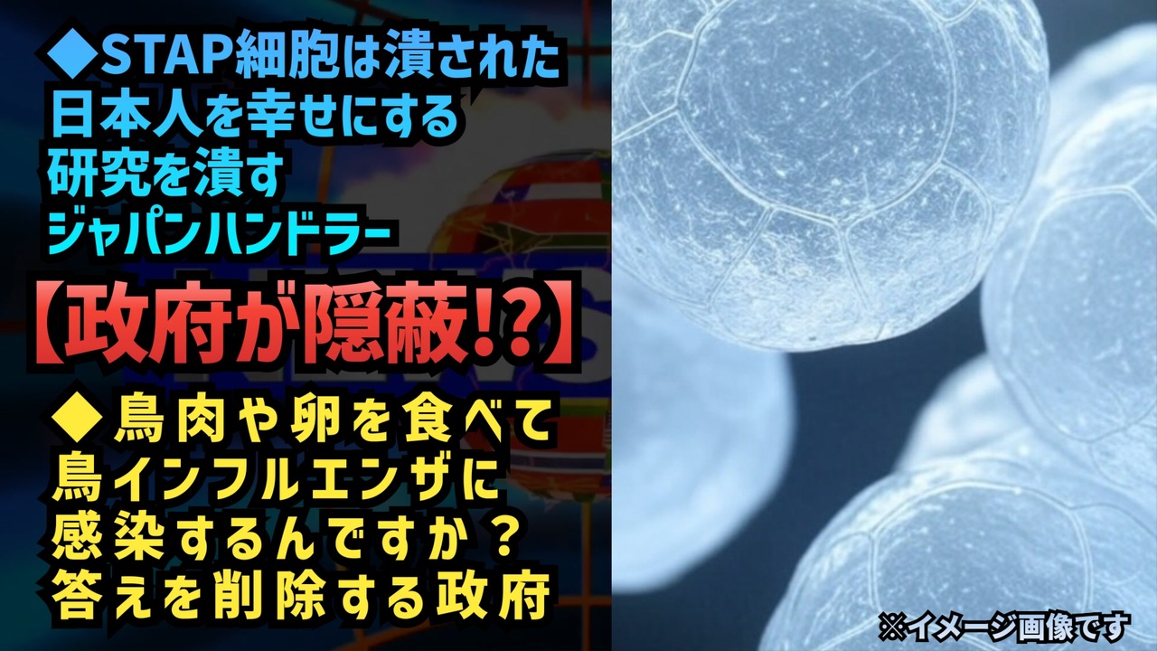 小保方さんが発見したSTAP細胞とは、簡単な手技で細胞が多機能細胞に変わる。損傷した組織をこの技法で治療すれば、例えば脊椎損傷で車椅子生活をしている人を解放できたかも知れない。<br>掛け声ばかりのiPS細胞とはえらい違いである。<br>日本人を幸せにする研究を、DSが許すわけがない。ハーバード大学といえば、ジャパンハンドラーのジョセフ・ナイがいる。<br><a href="https://x.com/KojiKoj94192232/status/1877818844367991041?t=_2X5OTGcDZXHsuB8wFyGRg&s=19" target="_blank" rel="noopener nofollow">https://x.com/KojiKoj94192232/status/1877818844367991041?t=_2X5OTGcDZXHsuB8wFyGRg&s=19</a><br><br><br>日本軍と中国軍に「殺し合いを行わせる」<br>これが米国政権中枢の戦略文書に明確に書かれている。<br>ジョセフ・ナイ著「日本に関する超党派の報告書」<br><a href="https://x.com/TetuwanA/status/1878588137259299294?t=sQP3P-Ht92ukYP8J12dnEQ&s=19" target="_blank" rel="noopener nofollow">https://x.com/TetuwanA/status/1878588137259299294?t=sQP3P-Ht92ukYP8J12dnEQ&s=19</a><br><br><br>コレ、ページ消されてる…<br>証拠隠滅??<br><br>鳥インフルエンザが発生しても、鶏肉・鶏卵は安全安心です ~厚真町(あつま町)での発生を受けてのお知らせ~<br><br>#鳥インフルエンザ詐欺<br>#鳥インフルエンザに騙されるな<br><br><a href="https://x.com/kuu331108/status/1878046289335902332?t=ewewGb80HD8nAxYJaZUpag&s=19" target="_blank" rel="noopener nofollow">https://x.com/kuu331108/status/1878046289335902332?t=ewewGb80HD8nAxYJaZUpag&s=19</a><br><br><br><br>鳥インフルエンザは人には感染しないという記事、調べた範囲で11つ消されている<br>再掲しときます<br><br>Q.<br>鳥肉や卵を食べて鳥インフルエンザは人に感染することはあるんですか?<br><br>A<br>ありません<br>農林水産省<br><br>#鳥インフルエンザはヤラセ<br>#鳥殺戮やめろ <br><br><br>農林水産省の白石さん<br>「鶏肉や卵を食べて鳥インフルエンザに感染することはありません。鳥インフルエンザが発生した農場の鶏はすべて殺処分され、施設の消毒が徹底されます。また、卵は洗浄・消毒され、鶏肉は解体前に検査されるため、感染した鶏や卵が市場に出回ることはありません。万が一ウイルスが食品内にあっても、加熱や胃酸で死滅します。風評被害を防ぐため、正しい知識の共有にご協力ください。」<br><a href="https://x.com/kuu331108/status/1878048527773020249?t=hkAXv1WCujFeY-4CB8XL8w&s=09" target="_blank" rel="noopener nofollow">https://x.com/kuu331108/status/1878048527773020249?t=hkAXv1WCujFeY-4CB8XL8w&s=09</a><br><br><br><br />著作権、肖像権に配慮して作成しております。<br><br>◆気になったニュースの台本!?<br>メモ代わりに作った台本をそのままあげてます<br><a href="https://keiichiro8140.hatenablog.com/." target="_blank" rel="noopener nofollow">https://keiichiro8140.hatenablog.com/.</a><br><br><br>ここからはシリーズ紹介<br><br><br>◆ ワクチン解毒・デトックス<br><a href="https://x.gd/fZweg" target="_blank" rel="noopener nofollow">https://x.gd/fZweg</a><br><br>◆ウイリアム・マキス博士のがん治療(イベルメクチン・フェンベンダゾール等)<br><a href="https://x.gd/AtFYS" target="_blank" rel="noopener nofollow">https://x.gd/AtFYS</a><br><br>◆予防接種健康被害救済制度<br><a href="https://x.gd/0xK9x" target="_blank" rel="noopener nofollow">https://x.gd/0xK9x</a><br><br>◆気になったニュース #1501~<br><br>◆ 【ショートver】気になったニュース<br><a href="https://x.gd/7MxXC" target="_blank" rel="noopener nofollow">https://x.gd/7MxXC</a><br><br>◆ 気になったニュース #1001~<br><a href="https://x.gd/Lp8gv" target="_blank" rel="noopener nofollow">https://x.gd/Lp8gv</a><br><br>◆ 気になったニュース #501~<br><a href="https://x.gd/EmbS4" target="_blank" rel="noopener nofollow">https://x.gd/EmbS4</a><br><br>◆ 気になったニュース #1~#500<br><a href="https://x.gd/uPhNb" target="_blank" rel="noopener nofollow">https://x.gd/uPhNb</a><br><br>◆ X(旧Twitter)・テレグラムで気になった情報<br><a href="https://x.gd/YG6FT" target="_blank" rel="noopener nofollow">https://x.gd/YG6FT</a><br><br>◆ 日比谷5万人パレードデ⚪生放送アーカイブ動画<br><a href="https://x.gd/3CHJv" target="_blank" rel="noopener nofollow">https://x.gd/3CHJv</a><br><br>◆日比谷5万人パレード⚪モのマイリスト作ってみました<br><a href="https://nico.ms/mylist/76828848?ref=sp_other" target="_blank" rel="noopener nofollow">https://nico.ms/mylist/76828848?ref=sp_other</a><br><br>◆3.30 令和の百姓⚪⚪<br><a href="https://www.nicovideo.jp/series/511791?ref=garage_share_other" target="_blank" rel="noopener nofollow">https://www.nicovideo.jp/series/511791?ref=garage_share_other</a><br><br>◆ 及川幸久さんの【XNEWS】シリーズ<br><a href="https://x.gd/3k78K" target="_blank" rel="noopener nofollow">https://x.gd/3k78K</a><br><br>◆これまでの動画<a href="https://x.gd/sPXoJ" target="_blank" rel="noopener nofollow">https://x.gd/sPXoJ</a><br><br>◆もしも(BAN)の時のためのマイリンク集<a href="https://lit.link/K-16_News44" target="_blank" rel="noopener nofollow">https://lit.link/K-16_News44</a><br><br>